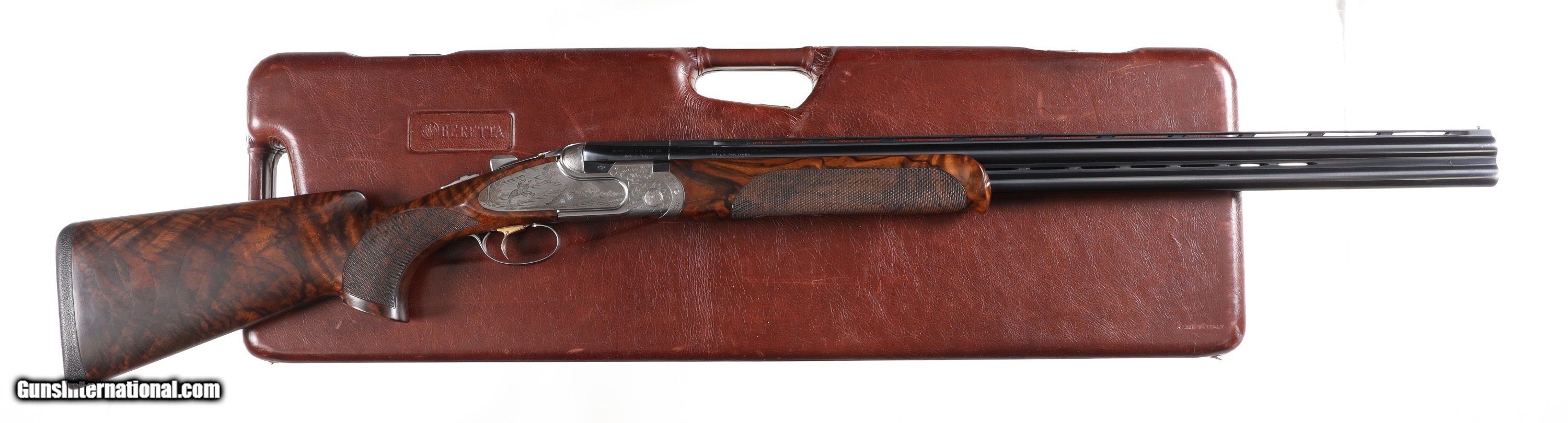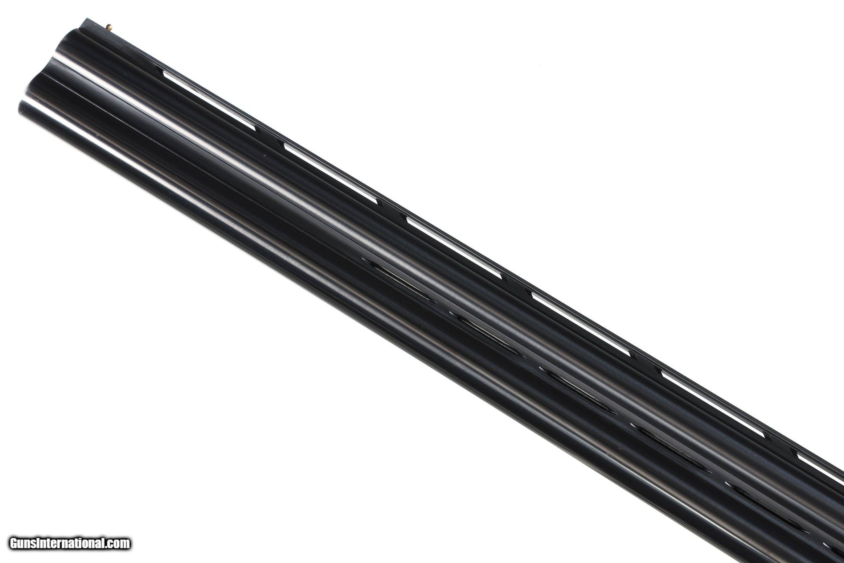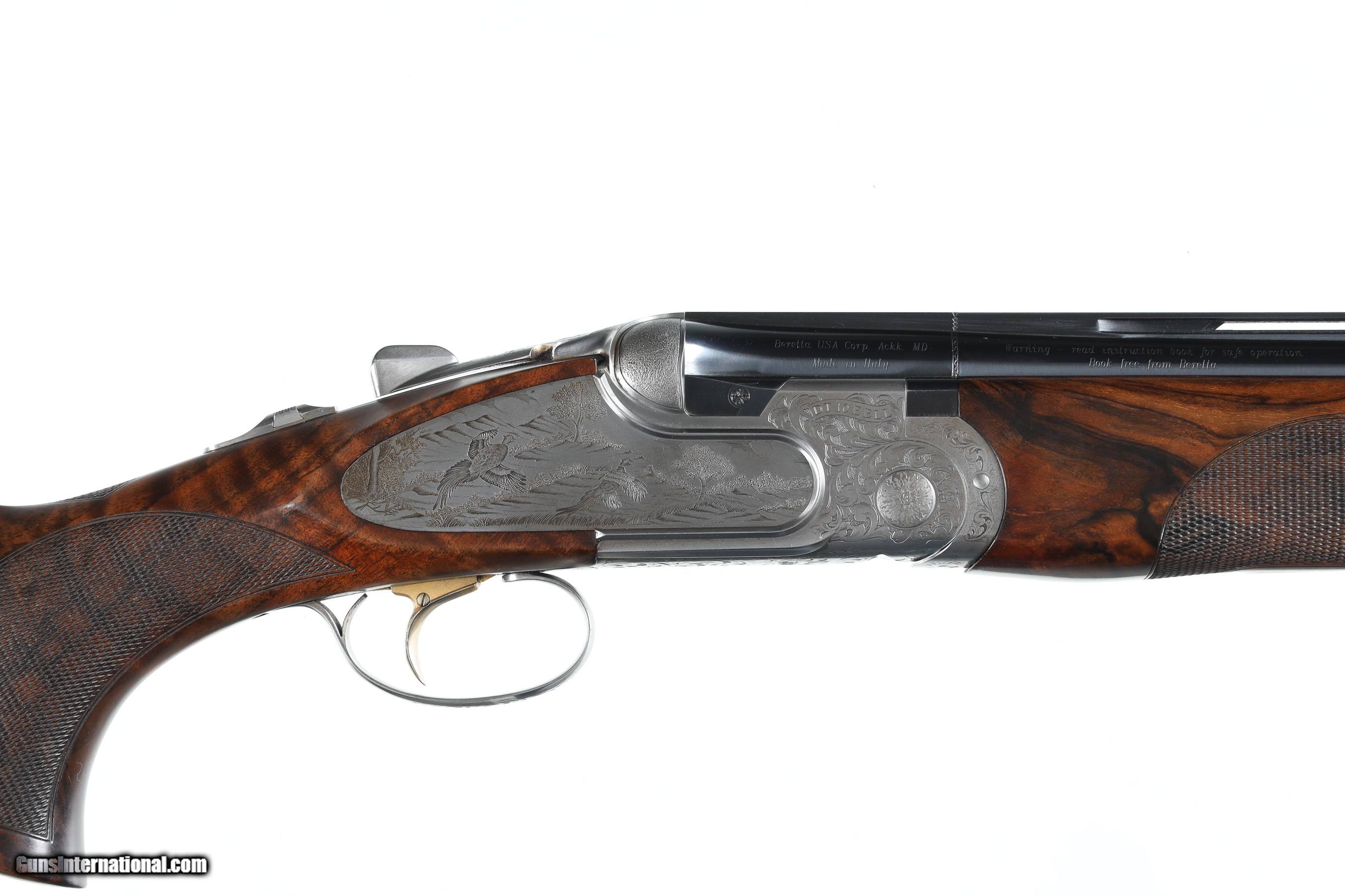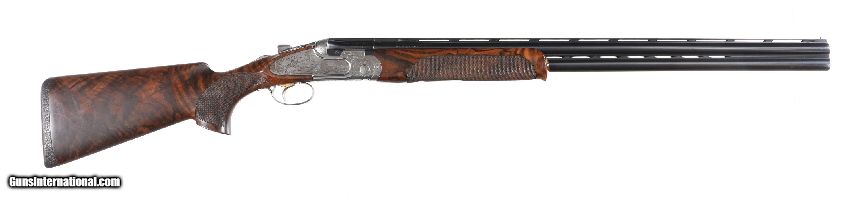 Description: Single selective trigger with ejectors, blue finished barrels with wide sporting clays rib, profusely factory engraved with dual game scene vignette on both sides. Balance of coverage is in broad scroll and vine. Stock in highly figured and marbled French walnut with pistol grip and sporting forearm. LOP 14 3/8", DAC 1 3/8", DAH 2 1/8". 3" chambers with factory interchangeable choke tubes. Supplied with 6 choke tubes as well as additional strikers and sight beads. Shotgun is housed in leather covered luggage case. Excellent overall condition retaining over 95% blue finish on barrels, receiver remains excellent with no distress. Stocks are excellent with some very minor period of use impressions, bores are bright, mechanically excellent, case is very fine. Mfg in 2008 • Free Shipping, No Credit Card Fees. • Lay-a-way available for this firearm. • 1/3 Down, a 1/3 in 30 Days 1/3 in 60 Days. SOLD Manufacturer: Beretta Model: DT10 EELL Serial Number: AG3865B Barrel Length: 30 |
