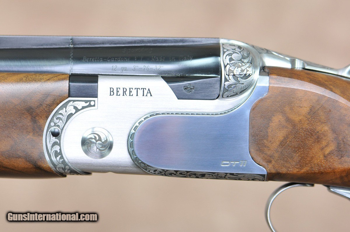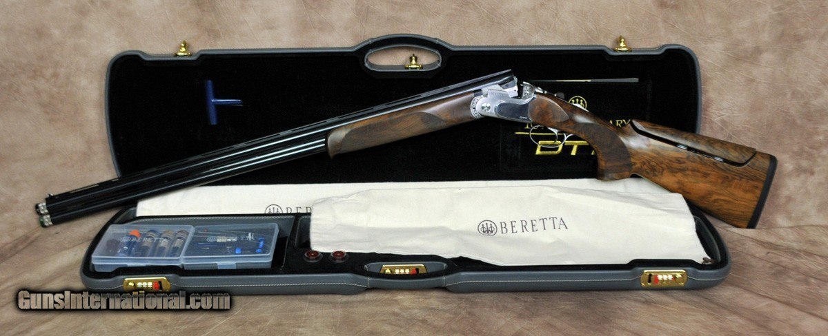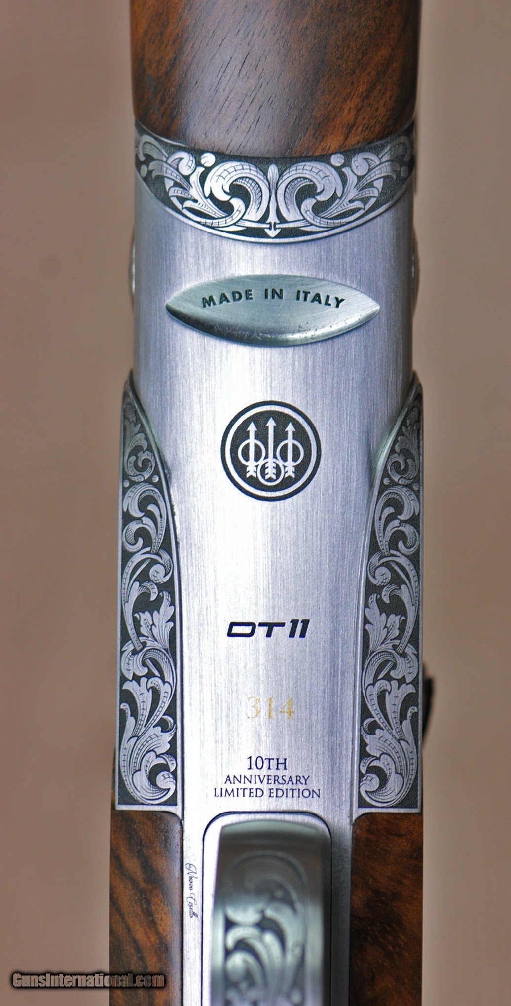 Description: New Special Edition From Beretta!!!!! DT11 10th Anniversary B Fast Sporter. Only 350 produced, this is #314. Features elegant ribbon scroll, Gold serial number and limited logo. 32″ Steelium Pro barrels with five Optima HP Chokes. Highly figured grade III B fast stock and leather special edition case- SOLD |