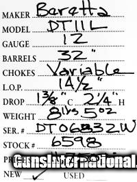 Description: Beretta DT11L 12 gauge SOLD Serial Number: DT06832W Barrels: 32 Stock Comb: 1 3/8 Stock Heel: 2 1/4 LOP: 14 1/2 Weight: 8lbs 5oz Chokes: Variable |
