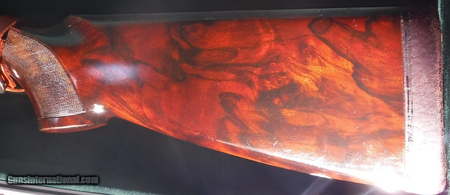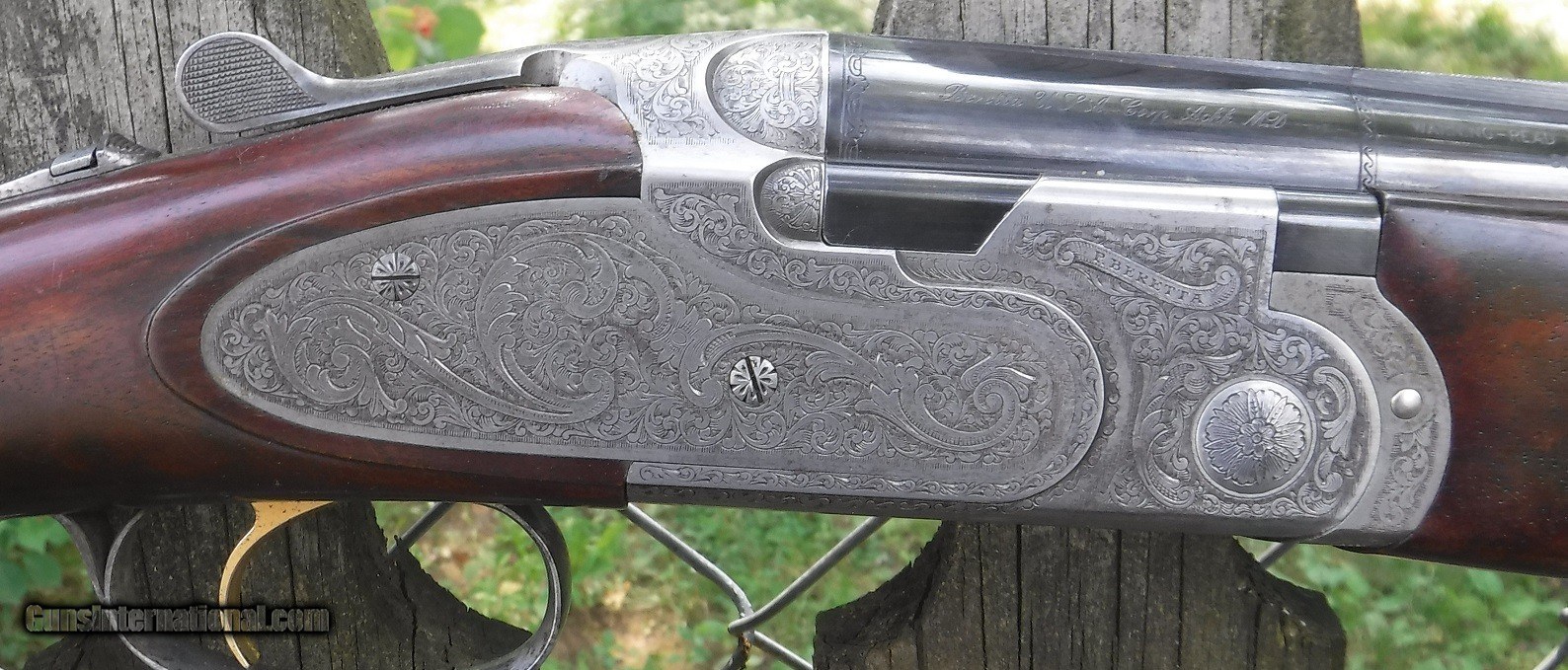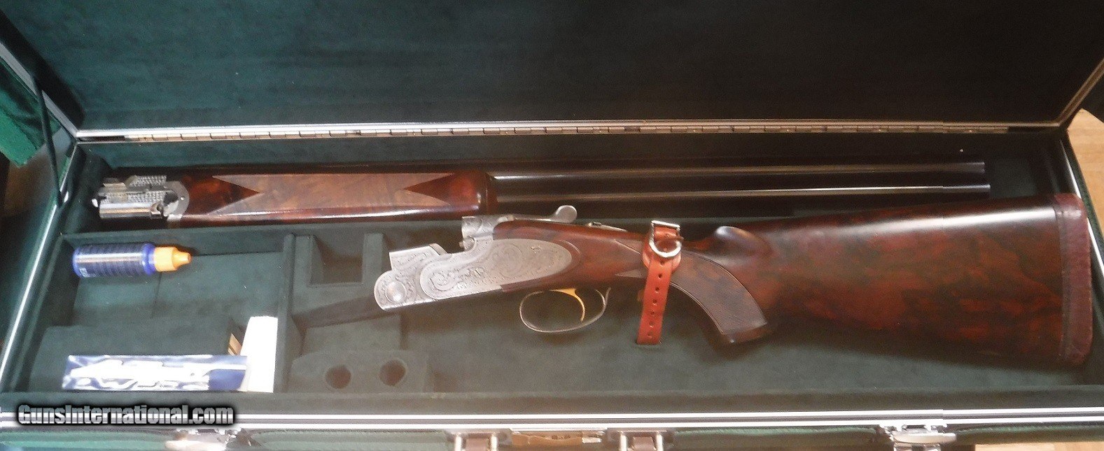 Description: BERETTA -GALLERY EDITION MOD. 687EELL - 12 GAUGE O/U - 28 INCH VENT RIB BARRELS WITH TWO BERETTA CHOKE TUBES - HIGHLY FIGURED PISTOL GRIP STOCK WITH LEATHER COVERED PAD - lop 14 1/2" - drop at comb 1 1/2" - drop at heel 2 1/8" - VERY SLIGHT CAST OFF - tSNAUBLE FOREND - COIN FINISH RECEIVER WITH FULL COVERAGE BOLD SCROLL ENGRAVING DONE BY GIOVANELLI - WOOD SHOWS MANY LIGHT HANDLING MARKS - CASED IN METALCASE WITH GREEN CANVAS COVER SOLD |