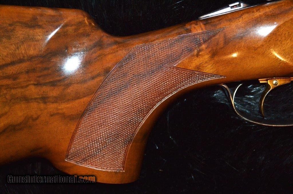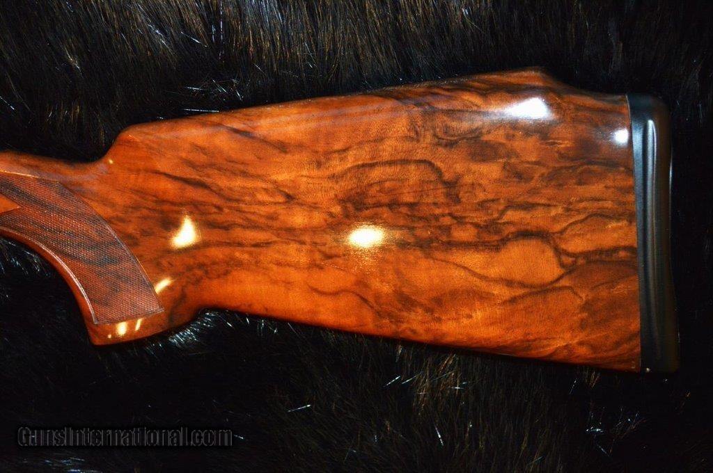 Description: This is a high condition Beretta Model 682 GOLD E TRAP 12 gauge with 30 inch vent rib barrels with 6 Beretta OptimaBore Chokes. The chokes are full, improved modified, modified, improved cylinder and two skeet chokes for maximum flexibility for all shooting disciplines. The gun is chambered 3" for those serious Annie Oakley shoots :). The receiver has the dual color finish with engraved merging circular lines and gold highlights. The trigger is gold as well. The stock and Beavertail forend are upgraded special deluxe wood with beautiful figure, gloss finish and fine checkering. The gun shows almost no wear and has been shot very little. The gun weighs 7 pounds 12 ounces. The barrels weigh 1.4 KG or 3.08 lbs. The drop comb = 1.5" and the drop heel = 1.5". It all comes in the Beretta blue plastic case specifically made for this gun with a stock wrench and a Beretta factory spare parts box that includes an extra trigger and two extra front beads. SOLD |