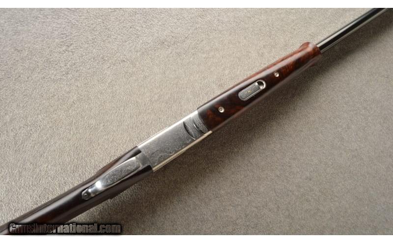 Description: This Beretta S687 EELL Diamond Pigeon was manufactured in 2005 and is gun two of a set. The other gun is list under SKU:4586727. The upper left barrel is marked "OB 12 GA. 3". - 28" and "SPORTING/ Beretta - Made In Italy / Gardone V.T.". The right barrel is marked "Beretta U.S.A. Corp. Ackk, MD" and "WARNING-READ INSTRUCTION BOOK FOR SAFE OPERATION BOOK FREE FROM BERETTA" / "LCL INC Scottsdale AZ". The barrels are 28" with a checkered ventilated rib and ejectors. The rib is marked with a gold "1". The trigger plate is marked "PATENTED" and "Bottega C. Giovanelli". The bottom of the receiver is marked "P. Beretta / S 687 EELL / Diamond Pigeon". There are a few proofs on the watertable. The sideplates of the S687 EELL feature a fine classic game scene of Woodcocks and pheasants in flight, these are enhanced by intricately detailed motifs of the birds in nature. The stock set is a two-piece checkered high grade walnut straight stock with a Schnabel forend, fluted straight comb with a carved checkered wood butt plate. Stock measurements (DC - 1.5" and DH - 2 1/4.") with about 1/4" cast for a right-handed person. Comes with 5 flush Beretta chokes (MOD, IC, CYL, IM, FULL". Overall this gun remains in great shape with minimal marks. 12 Gauge Chambers: 3" chambers. Metal Condition: Barrels rate about 80%-85%. The coin finished surfaces are in excellent shape. The gold on the triggers are mostly worn off. Wood Condition: The checkering on the stock and buttplate show matting in the checkering. No dents or dings. Bore Condition: Bright with smooth surface. Barrels: 28" barrels. Triggers: Two gold triggers. Stock Dimensions: LOP 13.5". Fore End: Schnable. Butt Pad: Wood butt plate. Sights: Front bead. Chokes: Removable. Item Location: Owatonna, MN Price: $5,299.99 Contact Seller |