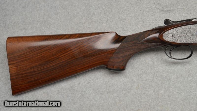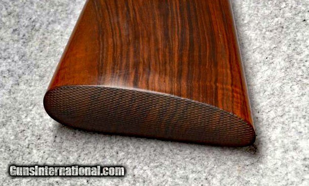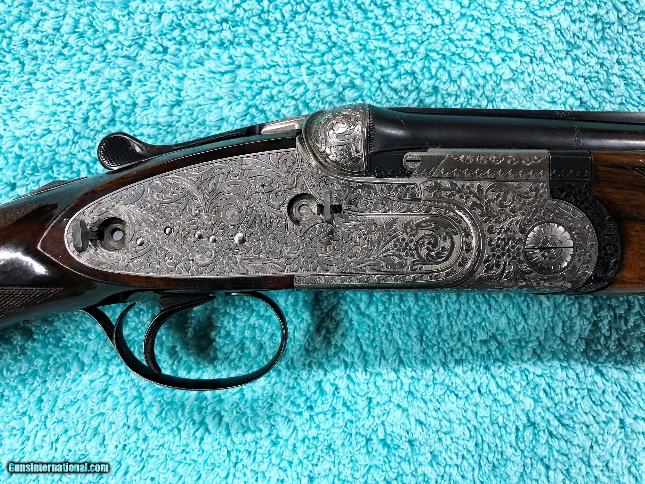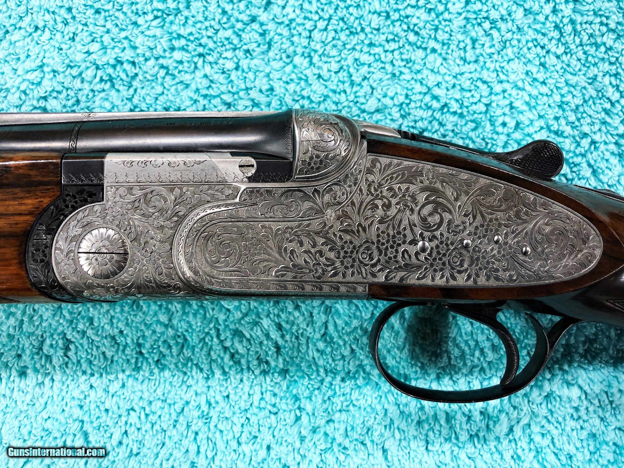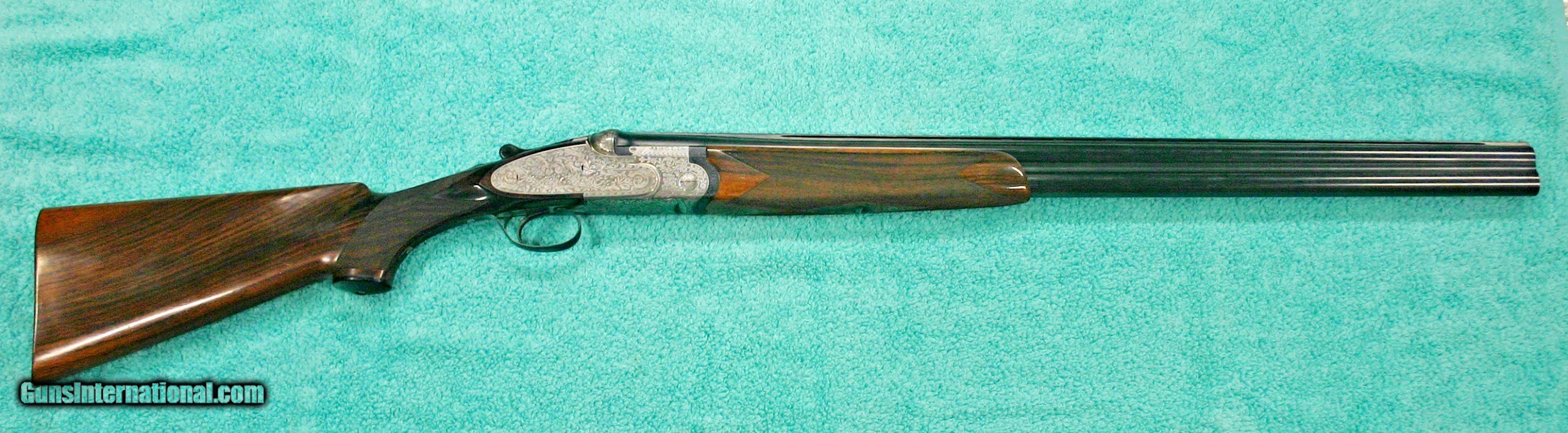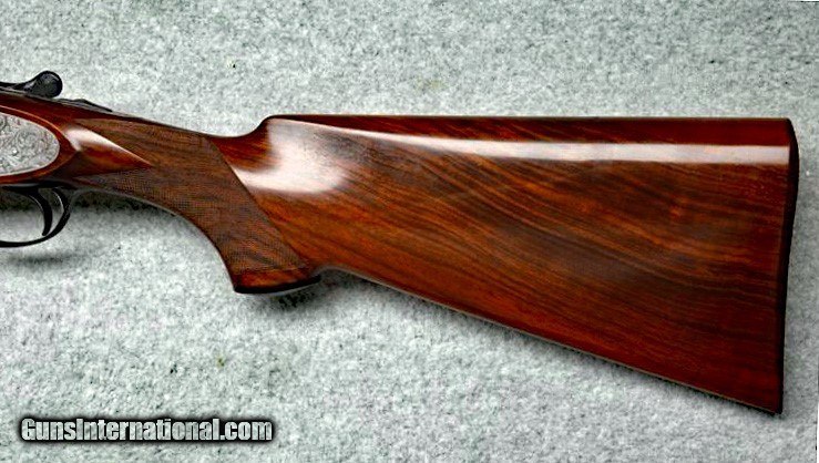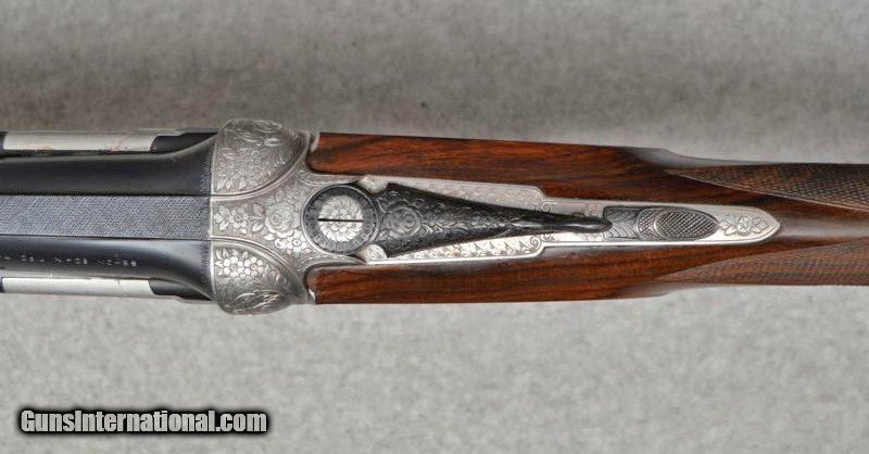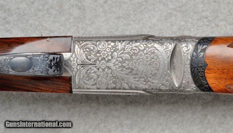 Description: Beretta Model S3 EL, 12 ga., 28”bls., Turrini engraved, Hand Detachable Sidelocks – Exc. Plus P.Beretta Model S3 EL, Sidelock Ejector, 12 gauge with 28” Boehler Antinit steel barrels fitted with a hand-filed cross-hatch ventilated rib with single silver bead front sight, choked Full and Modified, with 2 ¾” chambers, a single non-select trigger with a checkered face, a pistol grip stock with field forend, hand detachable sidelocks, and jeweled forend iron on the inside and the barrel sides. Features: Beretta experts will tell you that the S3 EL is the exact same gun as the SO5 as named by Garcia from 1968 to 1975. This gun was built in 1968, just before Garcia. After Garcia no longer distributed these guns, Beretta changed the name from SO5 back to SO3. This pre-Garcia EL engraving is very full and exactly like the later EELL engraving, but without the gold crown, the pierced top lever and the gold washed pins. I have owned two SO5EELLs and I know this engraving pattern is identical in every way, including the concealed hand-detachable locks and the location of the master engraver’s signature. After 1975, Beretta’s EL engraving is much different and much less full. Specifically, this EELL pattern is full coverage (100%) acanthus scrolls executed masterfully in a heavy bouquet/floral design with intertwined vines and fitted with the two concealed (thumbnail operated) hand-detachable trap door through-bolts disguised artistically into the intense foliage pattern. The engraving is of the highest order, true for all SOEELL’s and is signed by the master engraver,”G.Turrini” on the bottom of the action, right side of the trigger bow. This piece has retainer screws, including the replaceable locking shoulders on the barrel, and the locking screws hidden inside the forearm iron. The English walnut stock here is conservative compared to my former SO5EELLs, but preferred by many for its dark and warm colors and pleasing figure comprised of black and brown streaks planned so that they run in the direction of and parallel with the toe line. The finish is hand-rubbed oil It is shaped with a Prince-of-Wales pistol grip with horn grip cap and a field forend with perfectly executed hand checkering in point patterns on the pistol grip and a generous full wrap-around pattern on the forend (checkering is 26 lpi). Dimensions are LOP 14 1/8” to its original hand-checkered butt; DOC 1 ¾“ and DOH 2 ¼” and its weight is 7 lbs 4 oz. A leather-covered recoil pad could add up to any custom required measurement up to 15 1/8”. Neutral stock for the right or left hand. The serial number, “34237,” is marked on the barrel block and the water table and the serial number is inscribed again on the trigger tang. The Roman Numeral XXIV is on the bottom of the barrel which indicates the gun was made 24 years after 1944, or in 1968, just ahead of the Garcia distribution period or the gun would have been marked SO5 EL. Richard Rawlingson, Fieldsports writer, claimed the Beretta SO5 sidelock to be one of the most influential guns of the 20th Century. “The best competition shooters in the world choose the best shotguns in the world: and with five gold medals in five different Olympics and countless awards in prestigious international competitions, champions consider the Beretta SO5 over-and-under the finest competition shotgun ever made. A premium gun in every respect, the SO5 is a sidelock shotgun optimized for bringing clay shooters to the podium.” Last year’s trap champion at my own range told me “the only competitor he was worried about was the one who pulled out his Beretta SO5 sidelock.” These high grade Berettas are known for their incredible fit and finish of wood to metal and this one is a magnificent example. Condition: This gun would grade 98% overall with only slight handling marks. The wood finish remains at 96% condition, the checkering remains at 100% with no diamonds missing or worn, the original barrel blue is still at 99%. The trigger guard and tang still have 100% blue. The bores remain new as they were when made. This gun appears that it has seen very little use in the field. Comes with Berettta’s fitted trunk case. Installment Plans available. Price here to sell at $ 8,200.00 Seller is the author of The Rifleman’s Rifle (Winchester pre-64 Model 70s) and will furnish a Letter of Provenance that this gun is from his collection. Please check out author’s feedback on ebay under rcrwin70roger. 3-day non-firing inspection for full refund, shipping is $60 to buyer’s FFL, payment by MO, certified check , wire transfer or personal check with wait for validation. For questions, call (678) 971-4173 and ask for Roger. Footnote: Beretta SO Sidelocks Place in History: When Browning’s Superposed over/under became the first factory-manufactured over/under and was met with success, Beretta’s head of design, Tullio Marengoni, was not impressed by Browning's design, finding its under-slung lumps clumsy and inelegant. In a thinly veiled side-swipe at the rival gun, Marengoni, in an early Beretta catalogue, described the Browning design as 'very high, heavy and ugly', an insult that the Italian trade continued to use against the Superposed for the next 70 years! To reduce the height on his design Marengoni rejected conventional lumps and instead turned to a system used by Boss of England, mounting the barrels low in the action body on stub pins. This, however, had been expensive to make, as it was only a hand-made proposition. In 1932, Marengoni re-worked the design so that it needed less handwork and added his locking design with a cross bolt that emerged from the upper left side of the receiver. Further security was provided by trapezoidal barrel shoulders that engage cut outs in the action walls, a feature that has become a Beretta signature. The SO’s other distinguishing feature is that it was designed from the outset as a true sidelock. Recognising early o