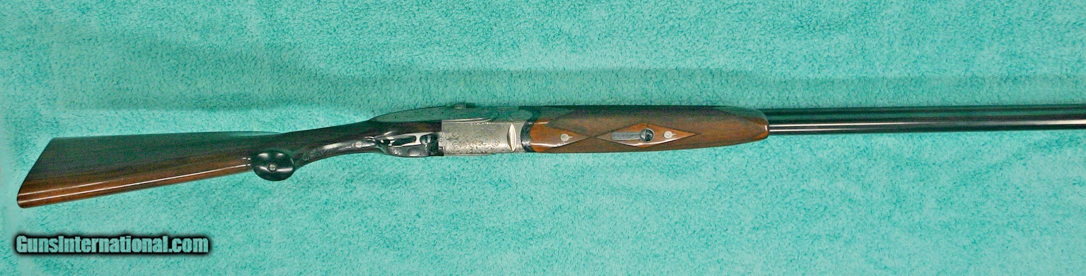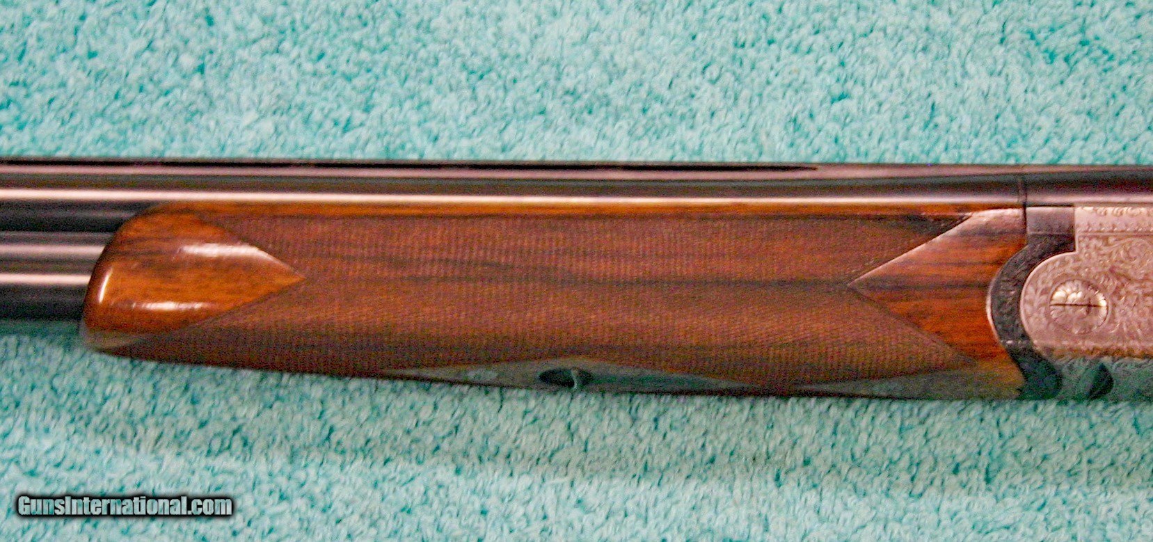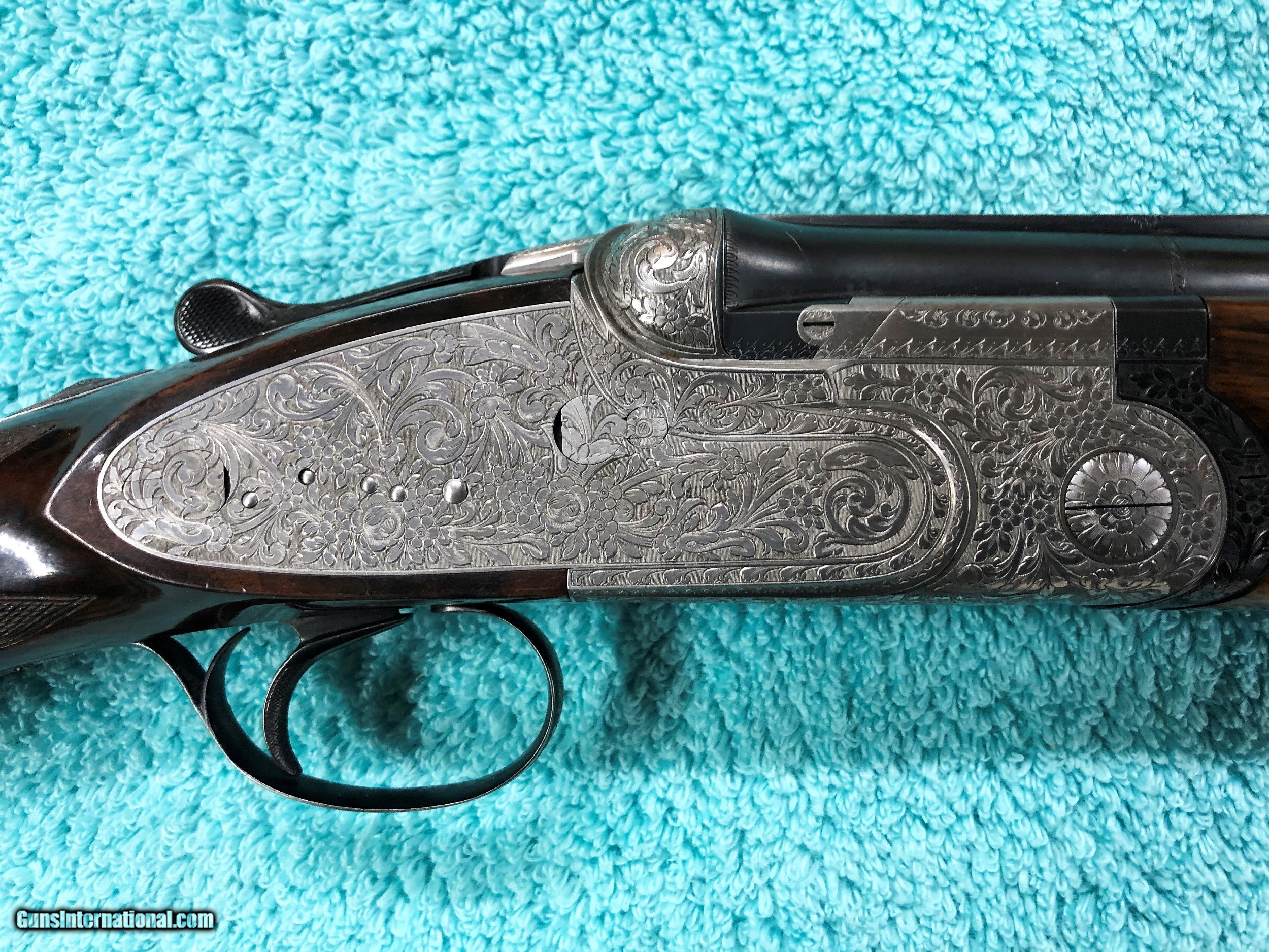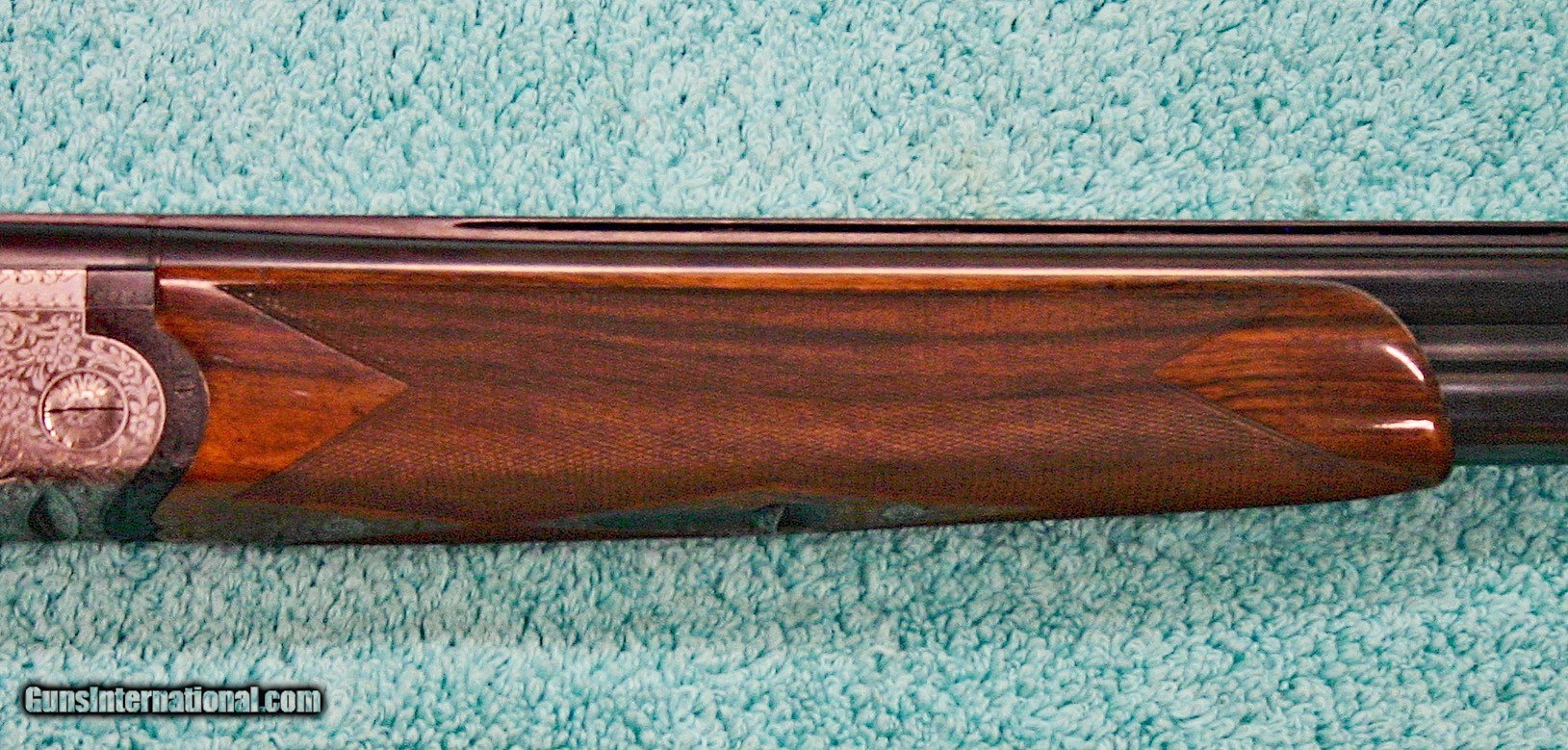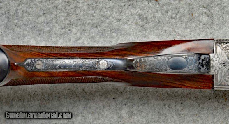 Description: Beretta Model S3 EL, 12 ga., 28”bls., Turrini engraved, Hand Detachable Sidelocks – Exc. Plus P.Beretta Model S3 EL, Sidelock Ejector, 12 gauge with 28” Boehler Antinit steel barrels fitted with a hand-filed cross-hatch ventilated rib with single silver bead front sight, choked Full and Modified, with 2 ¾” chambers, a single non-select trigger with a checkered face, a pistol grip stock with field forend, hand detachable sidelocks, and jeweled forend iron on the inside and the barrel sides. Features: Beretta experts will tell you that the S3 EL is the exact same gun as the SO5 as named by Garcia from 1968 to 1975. This gun was built in 1968, just before Garcia. After Garcia no longer distributed these guns, Beretta changed the name from SO5 back to SO3. This pre-Garcia EL engraving is very full and exactly like the later EELL engraving, but without the gold crown, the pierced top lever and the gold washed pins. I have owned two SO5EELLs and I know this engraving pattern is identical in every way, including the concealed hand-detachable locks and the location of the master engraver’s signature. After 1975, Beretta’s EL engraving is much different and much less full. Specifically, this EELL pattern is full coverage (100%) acanthus scrolls executed masterfully in a heavy bouquet/floral design with intertwined vines and fitted with the two concealed (thumbnail operated) hand-detachable trap door through-bolts disguised artistically into the intense foliage pattern. The engraving is of the highest order, true for all SOEELL’s and is signed by the master engraver,”G.Turrini” on the bottom of the action, right side of the trigger bow. This piece has retainer screws, including the replaceable locking shoulders on the barrel, and the locking screws hidden inside the forearm iron. The English walnut stock here is conservative compared to my former SO5EELLs, but preferred by many for its dark and warm colors and pleasing figure comprised of black and brown streaks planned so that they run in the direction of and parallel with the toe line. The finish is hand-rubbed oil It is shaped with a Prince-of-Wales pistol grip with horn grip cap and a field forend with perfectly executed hand checkering in point patterns on the pistol grip and a generous full wrap-around pattern on the forend (checkering is 26 lpi). Dimensions are LOP 14 1/8” to its original hand-checkered butt; DOC 1 ¾“ and DOH 2 ¼” and its weight is 7 lbs 4 oz. A leather-covered recoil pad could add up to any custom required measurement up to 15 1/8”. Neutral stock for the right or left hand. The serial number, “34237,” is marked on the barrel block and the water table and the serial number is inscribed again on the trigger tang. The Roman Numeral XXIV is on the bottom of the barrel which indicates the gun was made 24 years after 1944, or in 1968, just ahead of the Garcia distribution period or the gun would have been marked SO5 EL. Richard Rawlingson, Fieldsports writer, claimed the Beretta SO5 sidelock to be one of the most influential guns of the 20th Century. “The best competition shooters in the world choose the best shotguns in the world: and with five gold medals in five different Olympics and countless awards in prestigious international competitions, champions consider the Beretta SO5 over-and-under the finest competition shotgun ever made. A premium gun in every respect, the SO5 is a sidelock shotgun optimized for bringing clay shooters to the podium.” Last year’s trap champion at my own range told me “the only competitor he was worried about was the one who pulled out his Beretta SO5 sidelock.” These high grade Berettas are known for their incredible fit and finish of wood to metal and this one is a magnificent example. Condition: This gun would grade 98% overall with only slight handling marks. The wood finish remains at 96% condition, the checkering remains at 100% with no diamonds missing or worn, the original barrel blue is still at 99%. The trigger guard and tang still have 100% blue. The bores remain new as they were when made. This gun appears that it has seen very little use in the field. Comes with Berettta’s fitted trunk case. Installment Plans available. Price here to sell at $ 8,200.00 Seller is the author of The Rifleman’s Rifle (Winchester pre-64 Model 70s) and will furnish a Letter of Provenance that this gun is from his collection. Please check out author’s feedback on ebay under rcrwin70roger. 3-day non-firing inspection for full refund, shipping is $60 to buyer’s FFL, payment by MO, certified check , wire transfer or personal check with wait for validation. For questions, call (678) 971-4173 and ask for Roger. Footnote: Beretta SO Sidelocks Place in History: When Browning’s Superposed over/under became the first factory-manufactured over/under and was met with success, Beretta’s head of design, Tullio Marengoni, was not impressed by Browning's design, finding its under-slung lumps clumsy and inelegant. In a thinly veiled side-swipe at the rival gun, Marengoni, in an early Beretta catalogue, described the Browning design as 'very high, heavy and ugly', an insult that the Italian trade continued to use against the Superposed for the next 70 years! To reduce the height on his design Marengoni rejected conventional lumps and instead turned to a system used by Boss of England, mounting the barrels low in the action body on stub pins. This, however, had been expensive to make, as it was only a hand-made proposition. In 1932, Marengoni re-worked the design so that it needed less handwork and added his locking design with a cross bolt that emerged from the upper left side of the receiver. Further security was provided by trapezoidal barrel shoulders that engage cut outs in the action walls, a feature that has become a Beretta signature. The SO’s other distinguishing feature is that it was designed from the outset as a true sidelock. Recognising early o