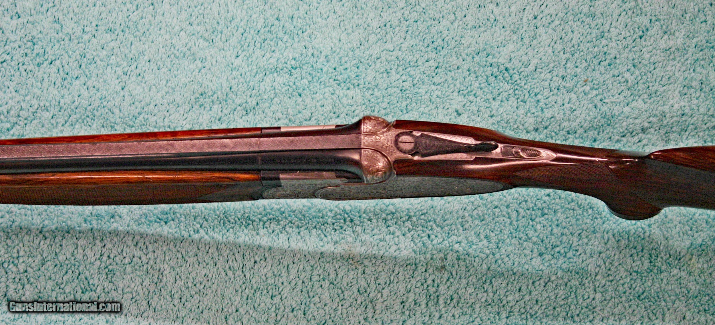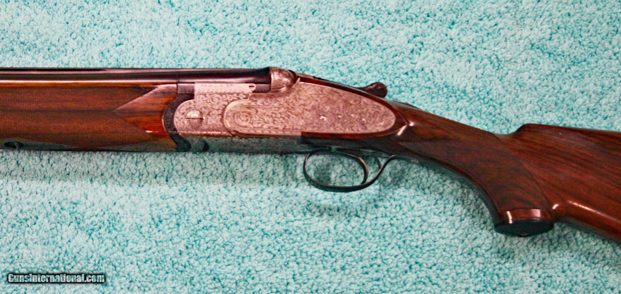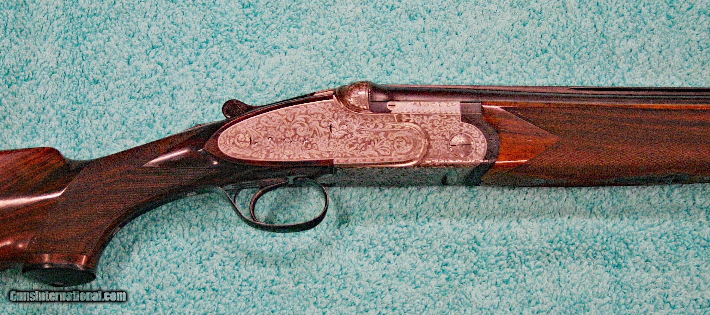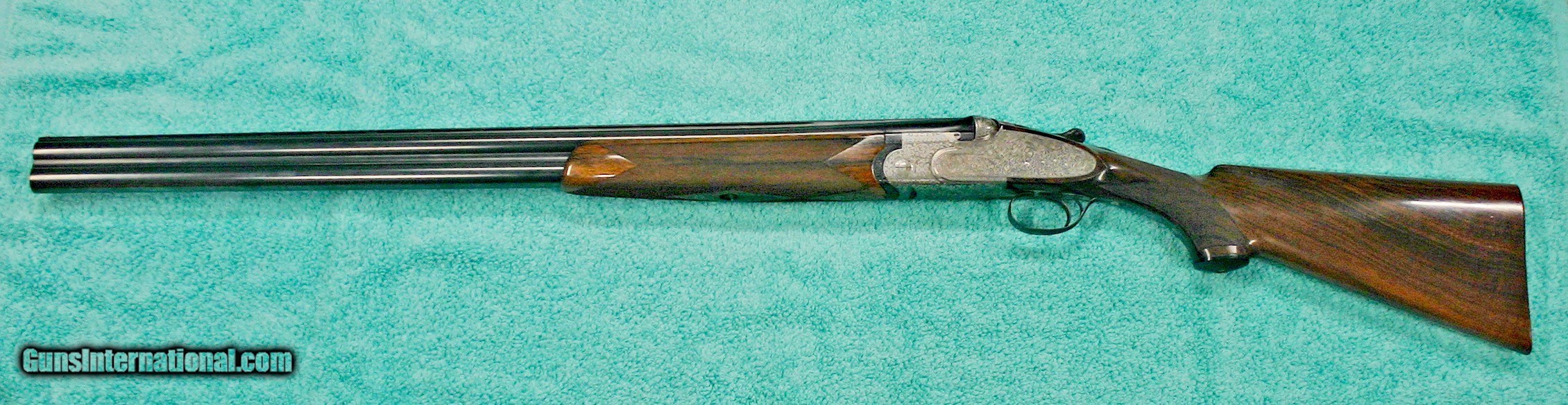 Description: Beretta Model S3 EL, 12 ga., 28”bls., Turrini engraved, Hand Detachable Sidelocks – Exc. Plus P.Beretta Model S3 EL, Sidelock Ejector, 12 gauge with 28” Boehler Antinit steel barrels fitted with a hand-filed cross-hatch ventilated rib with single silver bead front sight, choked Full and Modified, with 2 ¾” chambers, a single non-select trigger with a checkered face, a pistol grip stock with field forend, hand detachable sidelocks, and jeweled forend iron on the inside and the barrel sides. Features: Beretta experts will tell you that the S3 EL is the exact same gun as the SO5 as named by Garcia from 1968 to 1975. This gun was built in 1968, just before Garcia. After Garcia no longer distributed these guns, Beretta changed the name from SO5 back to SO3. This pre-Garcia EL engraving is very full and exactly like the later EELL engraving, but without the gold crown, the pierced top lever and the gold washed pins. I have owned two SO5EELLs and I know this engraving pattern is identical in every way, including the concealed hand-detachable locks and the location of the master engraver’s signature. After 1975, Beretta’s EL engraving is much different and much less full. Specifically, this EELL pattern is full coverage (100%) acanthus scrolls executed masterfully in a heavy bouquet/floral design with intertwined vines and fitted with the two concealed (thumbnail operated) hand-detachable trap door through-bolts disguised artistically into the intense foliage pattern. The engraving is of the highest order, true for all SOEELL’s and is signed by the master engraver,”G.Turrini” on the bottom of the action, right side of the trigger bow. This piece has retainer screws, including the replaceable locking shoulders on the barrel, and the locking screws hidden inside the forearm iron. The English walnut stock here is conservative compared to my former SO5EELLs, but preferred by many for its dark and warm colors and pleasing figure comprised of black and brown streaks planned so that they run in the direction of and parallel with the toe line. The finish is hand-rubbed oil It is shaped with a Prince-of-Wales pistol grip with horn grip cap and a field forend with perfectly executed hand checkering in point patterns on the pistol grip and a generous full wrap-around pattern on the forend (checkering is 26 lpi). Dimensions are LOP 14 1/8” to its original hand-checkered butt; DOC 1 ¾“ and DOH 2 ¼” and its weight is 7 lbs 4 oz. A leather-covered recoil pad could add up to any custom required measurement up to 15 1/8”. Neutral stock for the right or left hand. The serial number, “34237,” is marked on the barrel block and the water table and the serial number is inscribed again on the trigger tang. The Roman Numeral XXIV is on the bottom of the barrel which indicates the gun was made 24 years after 1944, or in 1968, just ahead of the Garcia distribution period or the gun would have been marked SO5 EL. Richard Rawlingson, Fieldsports writer, claimed the Beretta SO5 sidelock to be one of the most influential guns of the 20th Century. “The best competition shooters in the world choose the best shotguns in the world: and with five gold medals in five different Olympics and countless awards in prestigious international competitions, champions consider the Beretta SO5 over-and-under the finest competition shotgun ever made. A premium gun in every respect, the SO5 is a sidelock shotgun optimized for bringing clay shooters to the podium.” Last year’s trap champion at my own range told me “the only competitor he was worried about was the one who pulled out his Beretta SO5 sidelock.” These high grade Berettas are known for their incredible fit and finish of wood to metal and this one is a magnificent example. Condition: This gun would grade 98% overall with only slight handling marks. The wood finish remains at 96% condition, the checkering remains at 100% with no diamonds missing or worn, the original barrel blue is still at 99%. The trigger guard and tang still have 100% blue. The bores remain new as they were when made. This gun appears that it has seen very little use in the field. Comes with Berettta’s fitted trunk case. Installment Plans available. Price here to sell at $ 8,200.00 Seller is the author of The Rifleman’s Rifle (Winchester pre-64 Model 70s) and will furnish a Letter of Provenance that this gun is from his collection. Please check out author’s feedback on ebay under rcrwin70roger. 3-day non-firing inspection for full refund, shipping is $60 to buyer’s FFL, payment by MO, certified check , wire transfer or personal check with wait for validation. For questions, call (678) 971-4173 and ask for Roger. Footnote: Beretta SO Sidelocks Place in History: When Browning’s Superposed over/under became the first factory-manufactured over/under and was met with success, Beretta’s head of design, Tullio Marengoni, was not impressed by Browning's design, finding its under-slung lumps clumsy and inelegant. In a thinly veiled side-swipe at the rival gun, Marengoni, in an early Beretta catalogue, described the Browning design as 'very high, heavy and ugly', an insult that the Italian trade continued to use against the Superposed for the next 70 years! To reduce the height on his design Marengoni rejected conventional lumps and instead turned to a system used by Boss of England, mounting the barrels low in the action body on stub pins. This, however, had been expensive to make, as it was only a hand-made proposition. In 1932, Marengoni re-worked the design so that it needed less handwork and added his locking design with a cross bolt that emerged from the upper left side of the receiver. Further security was provided by trapezoidal barrel shoulders that engage cut outs in the action walls, a feature that has become a Beretta signature. The SO’s other distinguishing feature is that it was designed from the outset as a true sidelock. Recognising early o