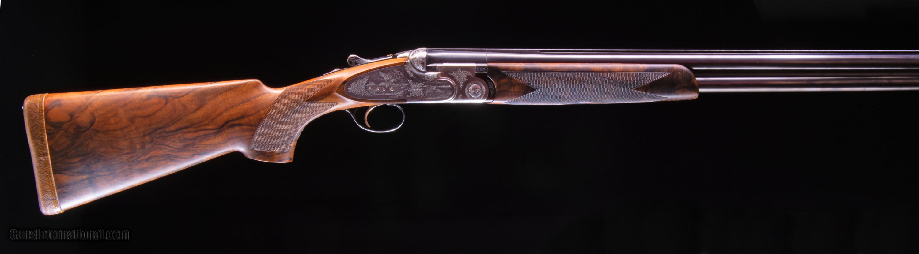 Description: Hammerless Sidelocks - A beautiful Italian lady that will perform. Weighted for clay shooting this gun feels great between the hands and swings beautifully. She does not feel her weight but like a gun a pound less. Choke tubes. *** Note: To see this gun with high resolution photos and a zoom-in feature, go to the vintagedoubles main site and search for the gun ID: 4536 or browse the main site to see our full gun collection. SOLD Manufacturer: Beretta SO 3 EELL in wonderful condition! This would make a superb sporting clays gun ! New Price! Model: SO3EELL Serial Number: 10494 Ejectors: Yes Barrels: 28 Barrel Type: Steel Action: Sidelock ejector Gauge Info: 12 gauge Stock Comb: 1 3/8 Stock Heel: 2 1/8 Stock Cast: 1/4 LOP: 14 1/2" with le Weight: 7lbs 12oz Choke Left: .028 (Upper) Choke Right: .022 Light full (Low Proof:Nitro: 2 3/4 Minimum Wall Thickness Left: .034 (Upper) Minimum Wall Thickness Right: .032 (Lower) |
