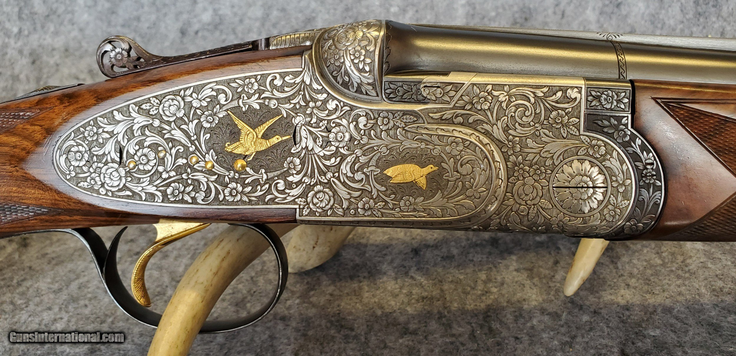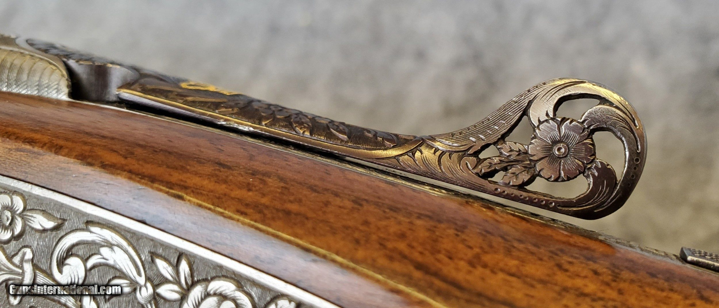 - The receiver, plates, trigger guard, and top lever are coin-finished and feature 100% engraving. The design is floral scroll paired with elegant borders around gold birds. The top lever is pierced with an inlaid gold crown.