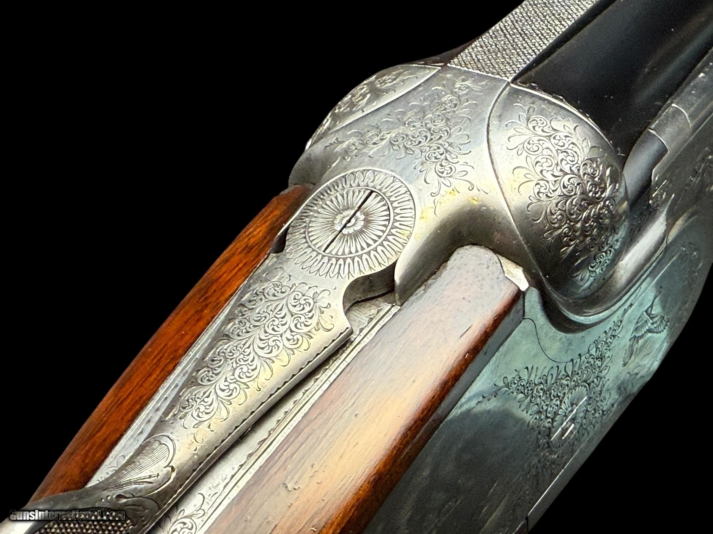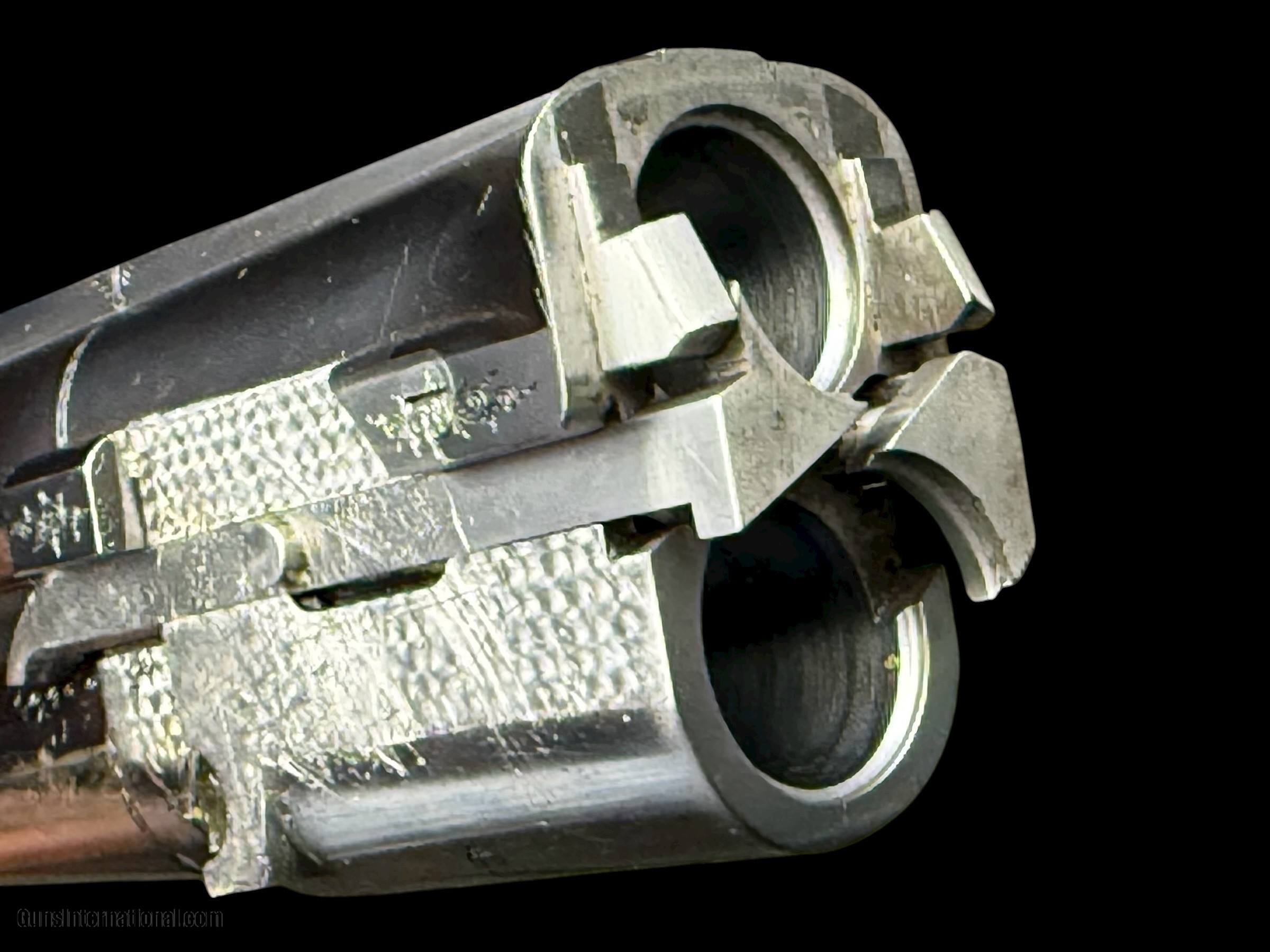 Description: PETRO BERETTA - ITALY - MODEL: SO-6 SPORTING O/U SHOTGUN - SIDELOCK ACTION - STUNNING HAND-ENGRAVED BULINO GAME SCENE & SCROLL ENGRAVED COIN FINISH RECEIVER FEATURING GROUSE / WOODCOCK / MALLARD - "SPORTING" IN GOLD ON TRIGGERGUARD - 12GA - 2 3/4" NITRO - 28" VENT RIB BARRELS - CHOKES: .013 /.023 SINGLE SELECTIVE TRIGGER - EJECTORS - BEAUTIFUL SPECIAL ORDER FEATHERCROTCH BLACK WALNUT PISTOL GRIP STOCK AND SPORTING FOREND W/ SMALL SCHNABLE TIP. - SOLID ORANGE RUBBER PAD - (1/2") DIMS: LOP: 14 1/4" | DAC: 1 1/2" | DAH: 2" - SLIGHT CAST-ON AT HEEL - (ADJUSTMENT TO LOP SERVICES AVAILABLE) WEIGHT: 8LBS 2 OZ - MFG: 1991 - CASED IN BERETTA LEATHERETTE CASE W/ TURNSCREWS. - CONDITION: GUN IS IN EXCELLENT OVERALL CONDITION SHOWING LITTLE SIGNS OF USE. ACTION LOCKS-UP VERY TIGHTLY. BORES CLEAR. EJECTORS STRONG. TRIGGER CRISP. WOOD FINISH AND BLUING EXCELLENT. CASE VERY GOOD OVERALL. GENTLEMEN. THIS IS A BEAUTIFUL BERETTA SO-6 SPORTING GUN IN FINE CONDITION. VERY SPECIAL WOOD AND EXQUISITE ENGRAVING. A FANTASTIC SPORTING CLAYS OR FIELD GUN. YOU WILL LIKE THIS GUN! PRICED TO SELL - PLEASE CALL NOW! FFL REQUIRED - FLAT $50 S/H/I CARD FEE APPLIES - Shotgun Gauge: 12 Gauge Manufacturer: BERETTA Model: S0-6 SPORTING Serial Number: C12832B Barrel Length: 28 Chambers: 2.75 OR 70MM Ejectors: YES Condition: EXC Metal Condition: EXC Wood Condition: EXC Bore Condition: EXC Action: SLE Triggers: SINGLE SELECTIVE Weight: 8LBS 2OZ Manufacture Date: 1991 Price: $16,900.00 Contact Seller |