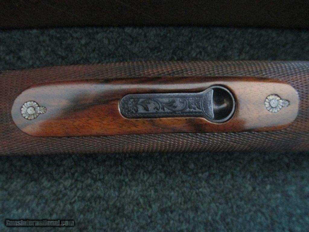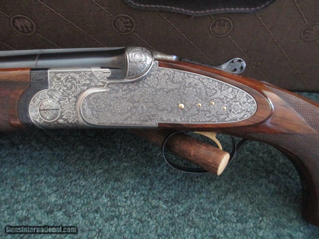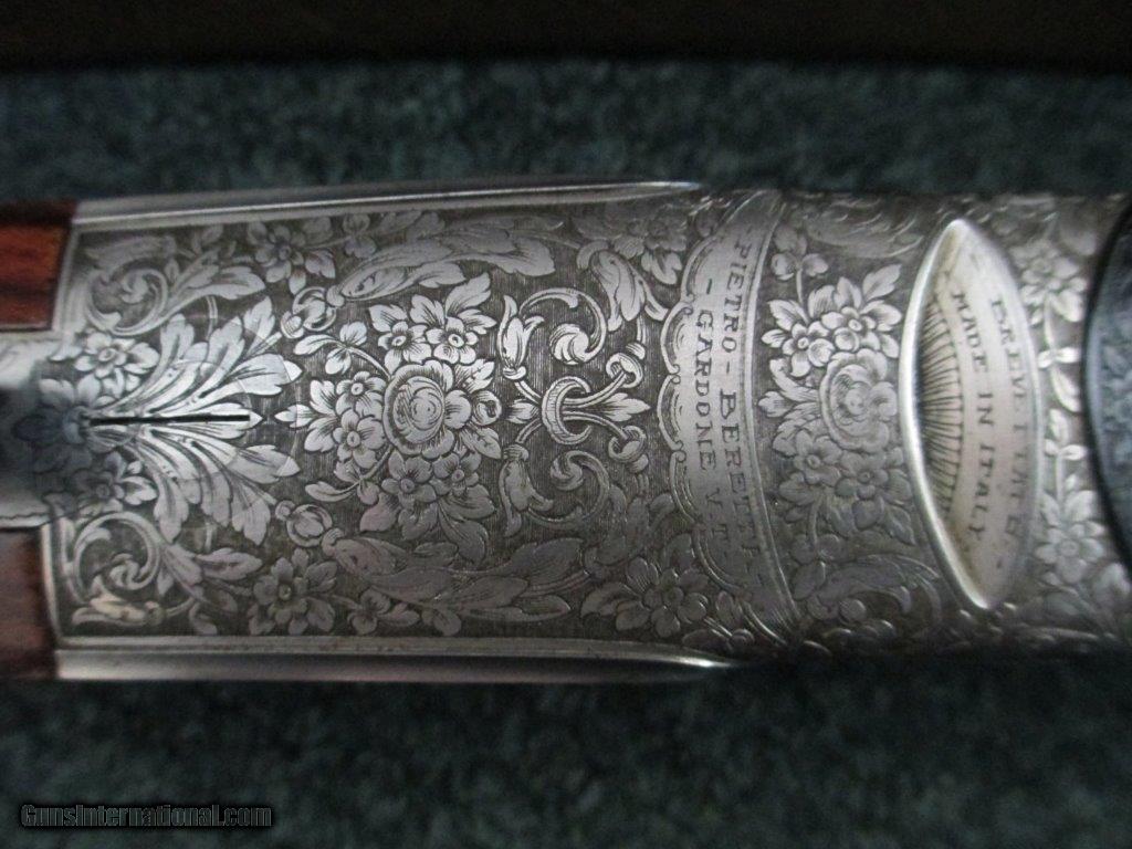 Description: P.Beretta, SO3 EELL,- Imperial, 12ga., 4 barrel set, barrel #1 28" ported cylinder IM/IC, barrel #2 28" ported cylinder IM/IC, barrel #3 32" O/U F/IM, barrel #4 34" trap Full choke, 14 1/2" length of pull,28” barrels, IM/F choked & 28” barrels, IC/F choked, all barrells marked with numbers, very rare, highest grade Beretta ever made, beautiful engraving by Bielli, gold trigger, gold dove, gold crown, gold side lock pins, full side lock, tight fit, hard case holds 2 barrels, checkered butt, auto ejector shows very little wear, if any, excellent condition, SOLD |