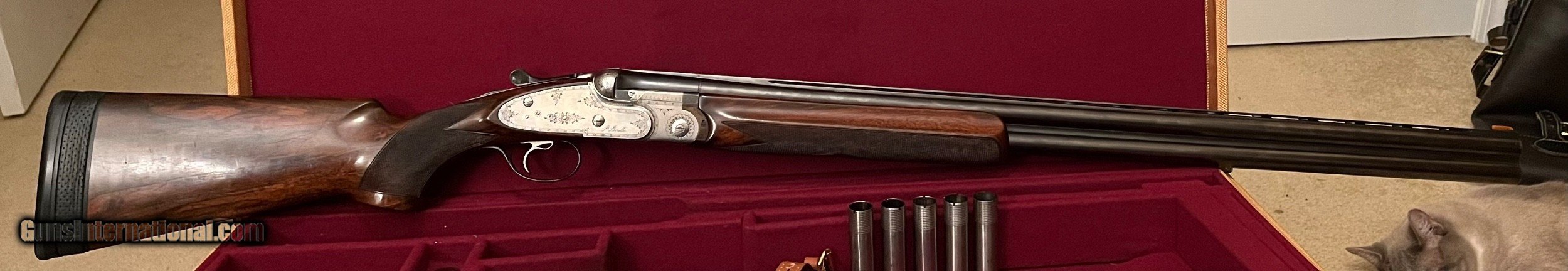 Description: Price reduced! Beautiful Beretta SO4 sidelock with 30 inch barrels and Briley Chokes setup for sporting clays. A premium Beretta sidelock for the price of a box lock. This shotgun was updated by Cole's and includes a leather covered ISIS recoil reduction system. The true 30-inch Boehler Antinit steel barrels have excellent bores, Briley thin wall chokes and a hand filed, ventilated rib. Single non-selective trigger, manual safety, excellent fine checkering on beautiful dark streaked walnut. LOP 14 3/4, DAC 1 1/4, DAH 1 3/4, If you haven’t felt the trigger in the Beretta sidelocks, it is the best you’ll feel in any shotgun, at any price. Shotgun was made in 1976 and includes a “Montreal” and “Monaco” Olympic medallion inset in the grip and vacant gold oval in the butt. Tasteful engraving with “Trap” in gold on the trigger guard. Included chokes XF, IM, LMOD, IC, CYL. Price is $6575 plus shipping. My email is josephgrazianogmail, 251-223-0038. SOLD Shotgun Gauge: 12 Gauge |