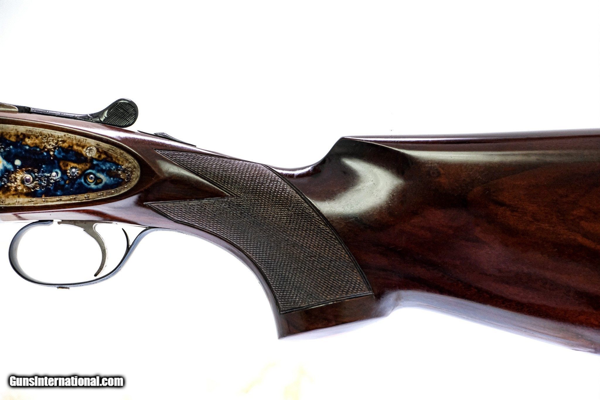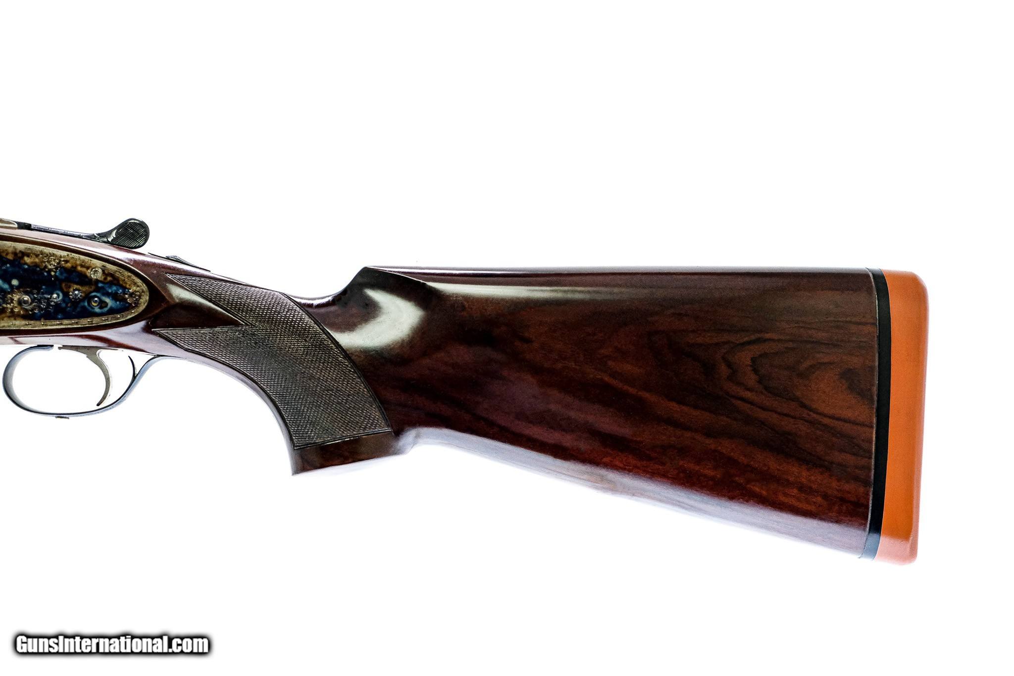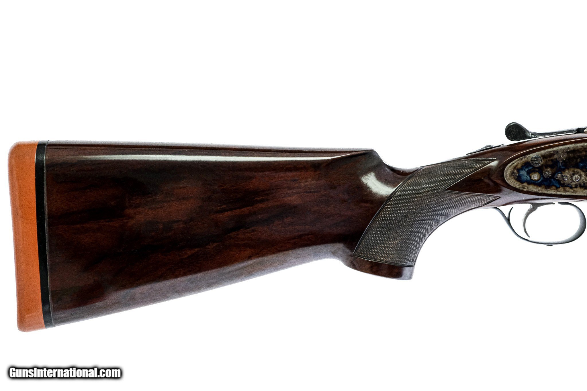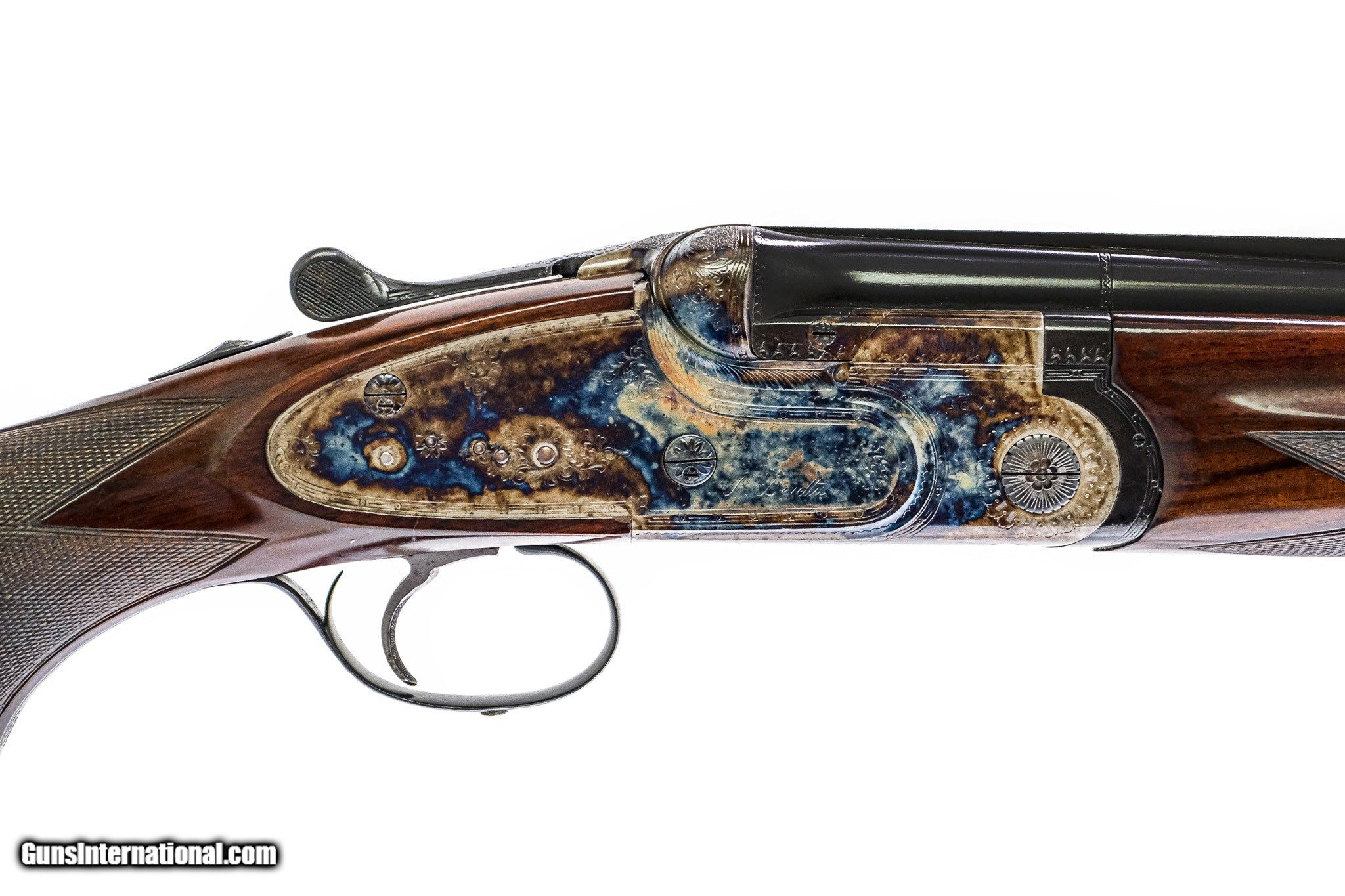 Description: Beretta - SO4, O/U Sidelock, 12ga. 29" Barrels Choked 1/2/Full. Made in 1978, 2 3/4" chambers, manual safety, magnificently engraved with English scroll and border engraving, right hand palm swell, a unique gun, with completely English finished on it, with an English Slivers pad, has a gold clay target on the trigger guard, the gun looks 100% new and unfired, a perfect target gun thats tight and new. All the locks and barrels are jeweled, this is a very high grade gun with a very unusual finish. Obviously special ordered. Inv: 71911 8 lbs. 2 oz. 14 3/4" x 1 3/8" x 2" $9,995.00 CALL 860-225-6581 FOR FURTHER INFORMATION ABOUT THIS GUN & THE INSPECTION PERIOD. SOLD |