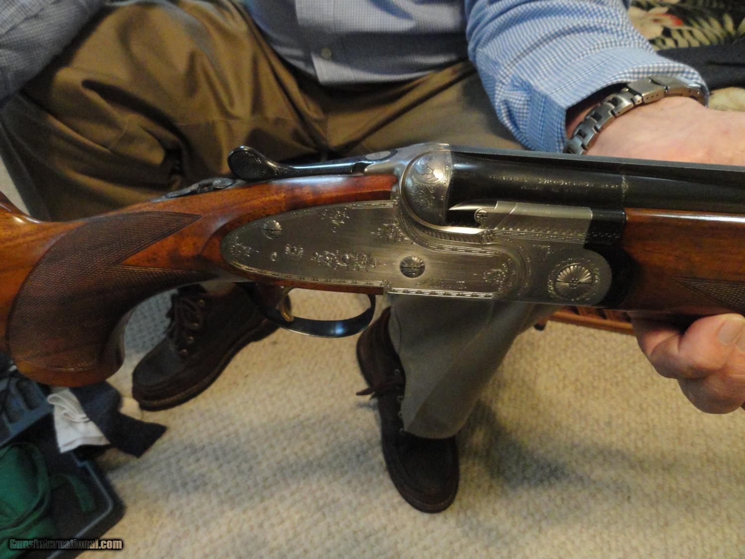 Description: Up for SALE a BERETTA SO4, Sidelock border eng, w/28" barrels, choked skt/skt. Drop heel 2 1/16, Drop Comb 1 1/4, LOP 14-1/8 to kick-eez pad. cast off 1/8, PG stock nicely figured wood. Serial# CO628B Beretta cased, Excellent Condition SOLD |