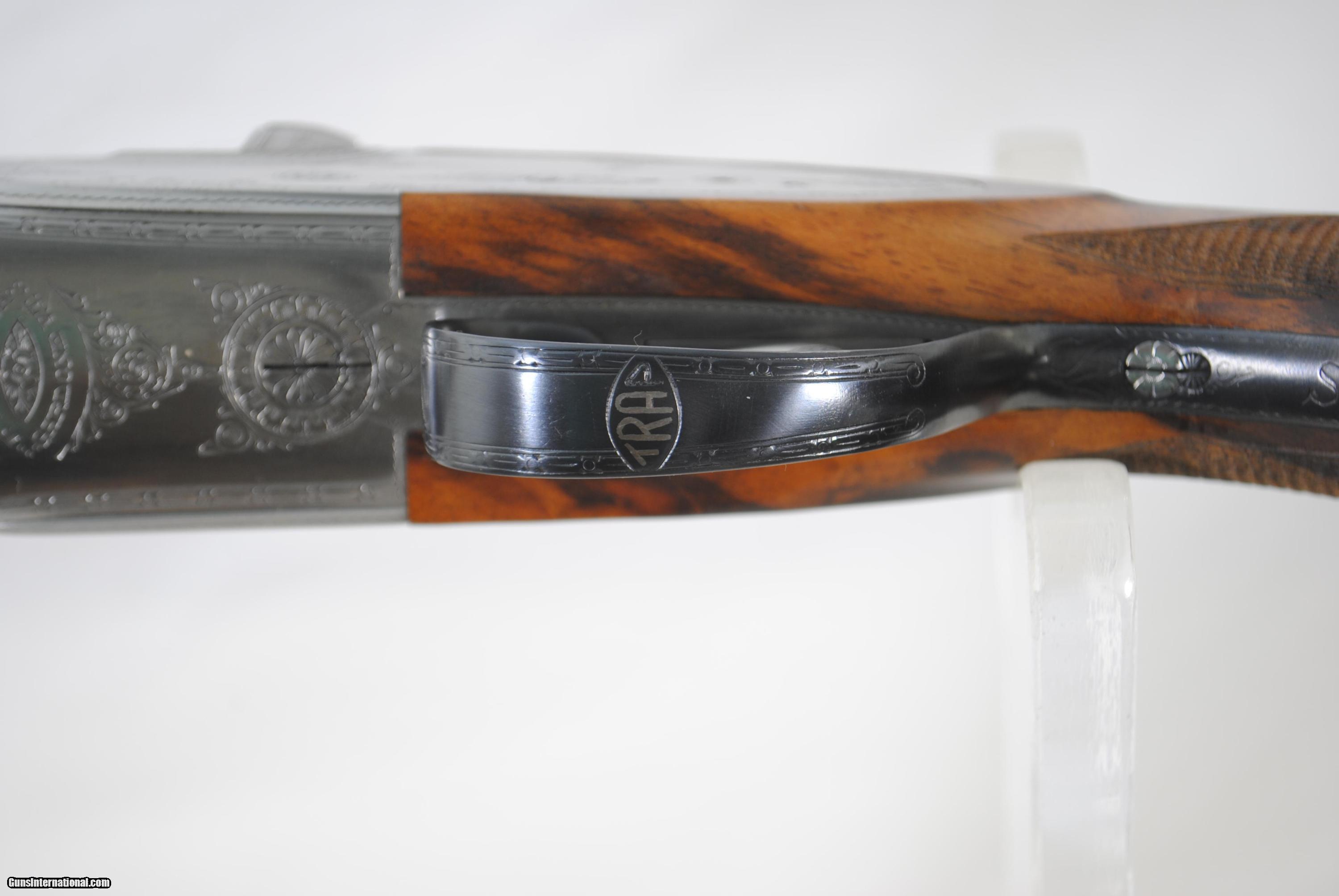Description: Beretta SO4 Trap in 12 gauge with 29" barrels. Highly figured wood. Bores as original - bottom measures .727 with 27/1000 choke (Imp Mod) while top is .728 with 42/1000 choke (Full). Chambers at 2 3/4". All option SO-4 with pierced top lever and gold crown. Weight of gun is 7 LBS 13 1/2 OZ. Blue plastic Beretta case included. Shipping and insurance is $50. Stock dimensions follow. LOP - 14 7/8" Drop at Comb - 1" Drop at Back of Monte Carlo - 1 1/2" Drop at Heel - 2" Slight right hand palm swell. For inquiries please call Guy - 407-721-3748 SOLD |