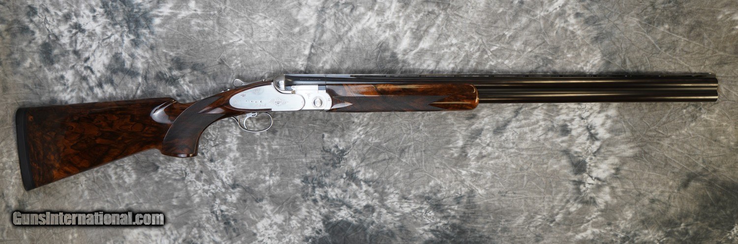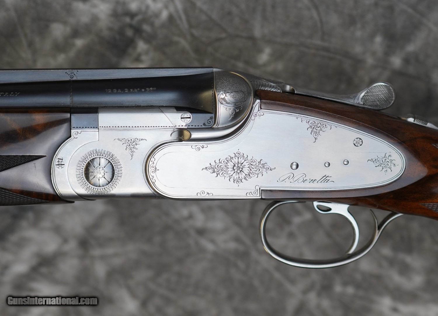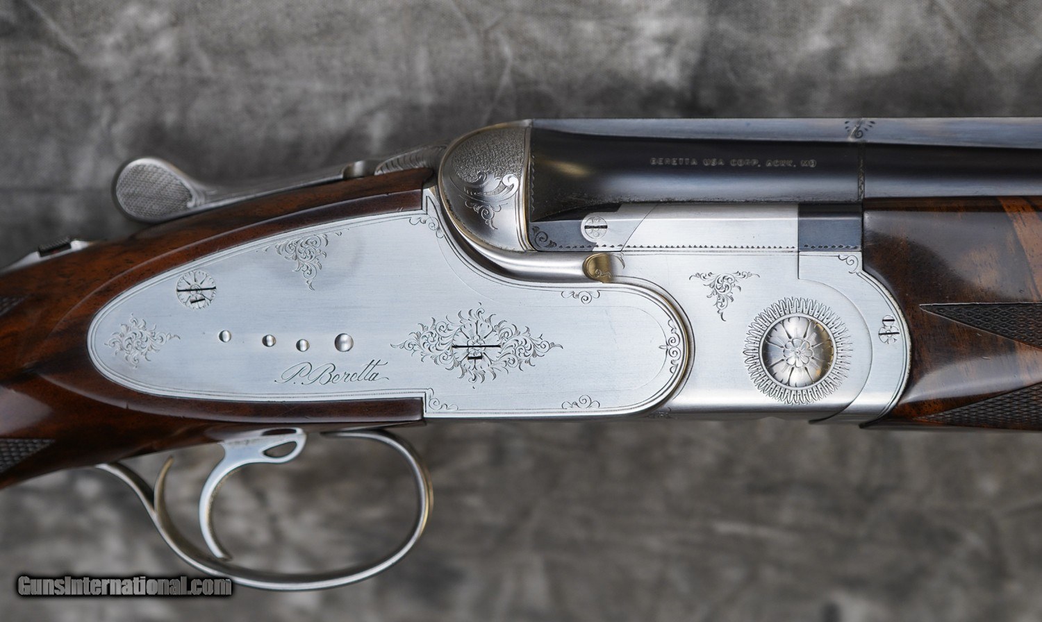 Description: Beretta SO5 Sporting 12GA with 29 1/2" factory Mobil choked barrels, 10x8 flat tapered, filed rib. Factory coin finished action, full side-lock with English scrolls and arabesques. Factory pistol grip sporting stock with right-hand palmswell and beavertail forearm, minor handling marks on stock and forearm and very minor bluing wear on barrels. Minor scuffing on action, overall excellent condition. Includes case, chokes and tools. Consignment, ineligible for trade-ins. SOLD Shotgun Gauge: 12 Gauge |