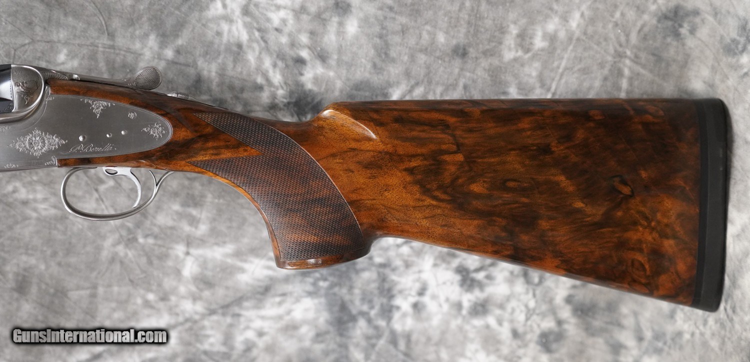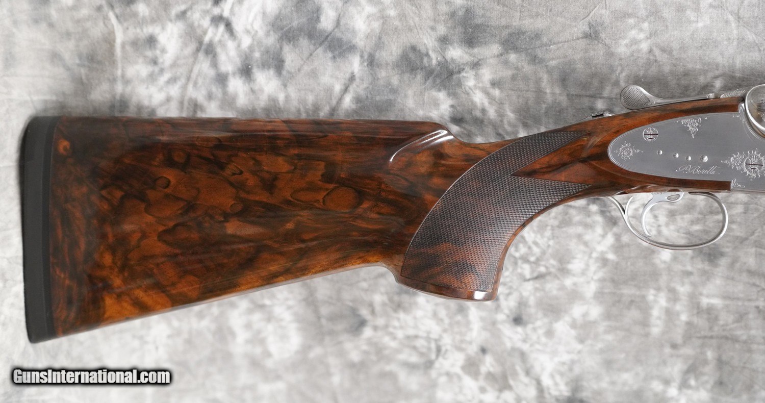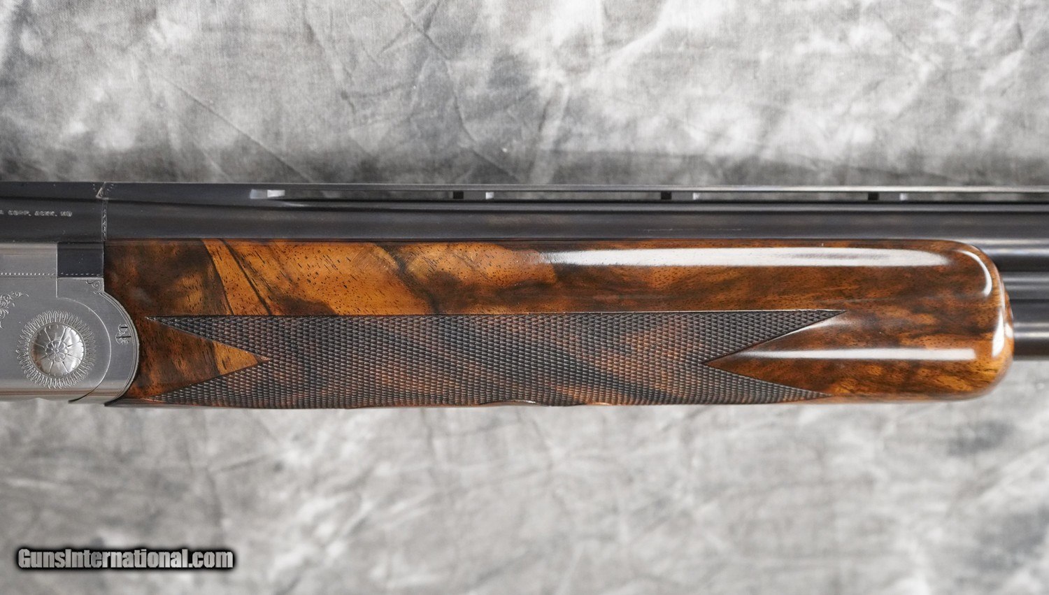 Description: Beretta SO5 Sporting 12GA with 29 1/2" factory Mobil choked barrels, 10x8 flat tapered, filed rib. Factory coin finished action, full side-lock with English scrolls and arabesques. Factory pistol grip sporting stock with right-hand palmswell and beavertail forearm, minor handling marks on stock and forearm and very minor bluing wear on barrels. Minor scuffing on action, overall excellent condition. Includes case, chokes and tools. Consignment, ineligible for trade-ins. SOLD Shotgun Gauge: 12 Gauge |