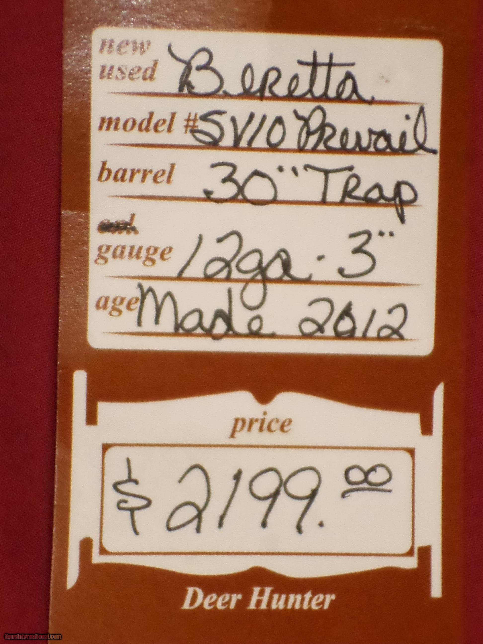 Description: SOLD For sale, Beretta SV 10 Prevail, 12 Ga 30", trap shotgun, with factory Kick Off. Excellent condition, no box or case. Circa 2012 SOLD To see more of our inventory, visit deerhunterguns,com We collect 7% sales tax for Florida sales. We accept MC, Visa and Discover, no AmEx. No Sales to California. Like us on Facebook: Deer Hunter Guns SOLD |