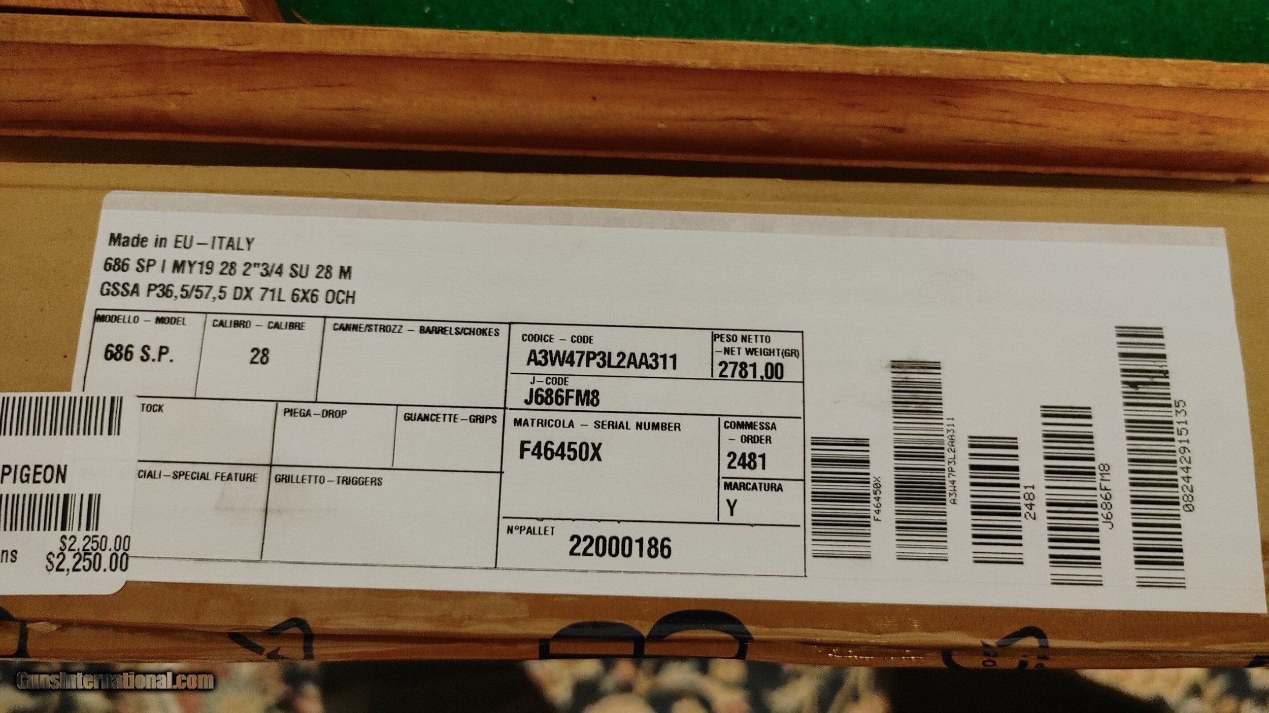 Description: new 686 SLV PGN I 28/28 BL/WD 2.75 J686FM8 ENHANCED ENGRAVING luggage case new in box (MODEL:686 SILVER PIGEON I); (ACTION:OVER / UNDER); (SIGHTS:FRONT METAL BEAD); (STOCKFRAMEGRIPS:OIL FINISHED WALNUT WOOD STOCK); (WEIGHT:6.8 LBS.); (CHAMBER:2-3/4); (BARREL LENGTH:28); (DRILL-TAPPED:FALSE); (CAPACITY:2); (SHOTGUN:SHOTGUN) Buyer pays shipping Millers Gun Center Located in New Castle, Delaware "Home of TAX-Free shopping" No Credit Card Fees SOLD Serial Number: F46450X |