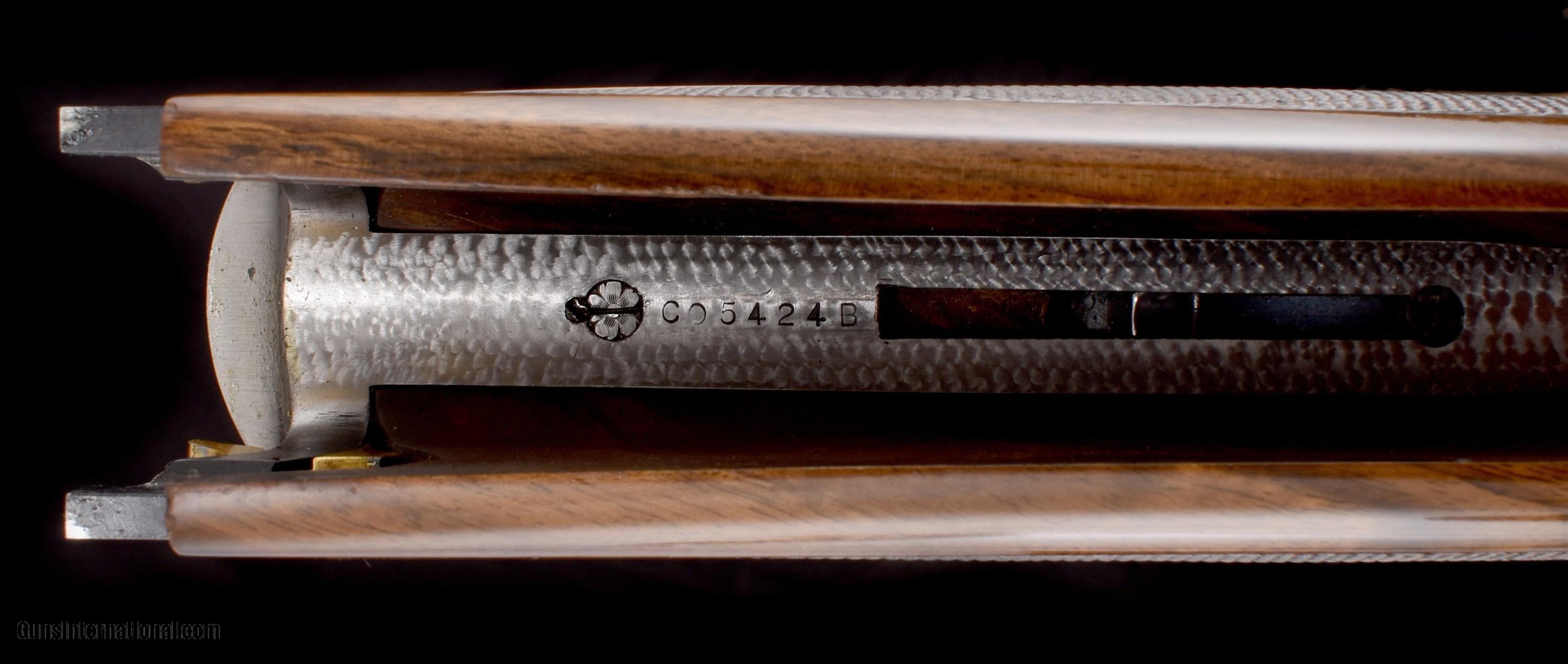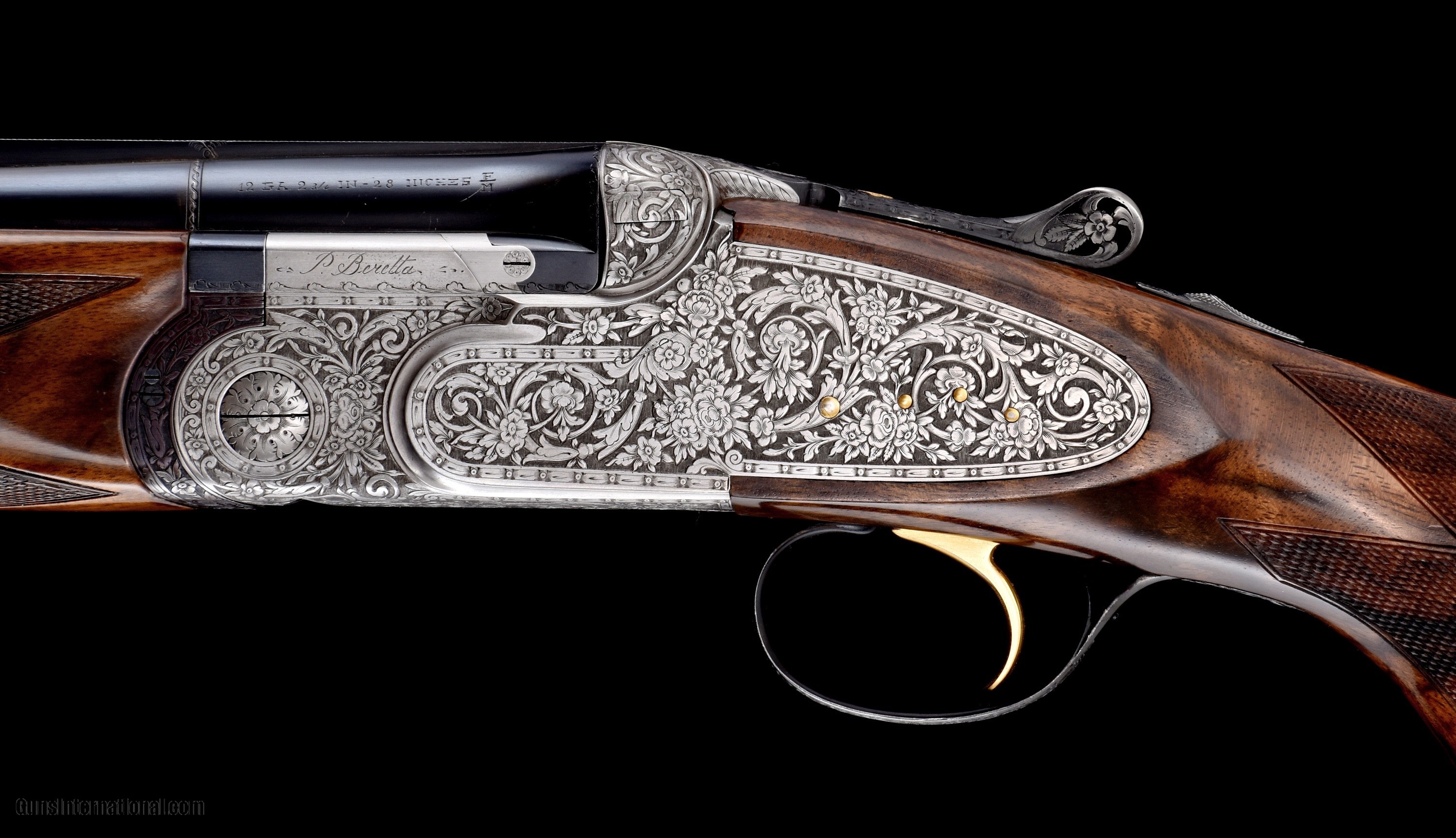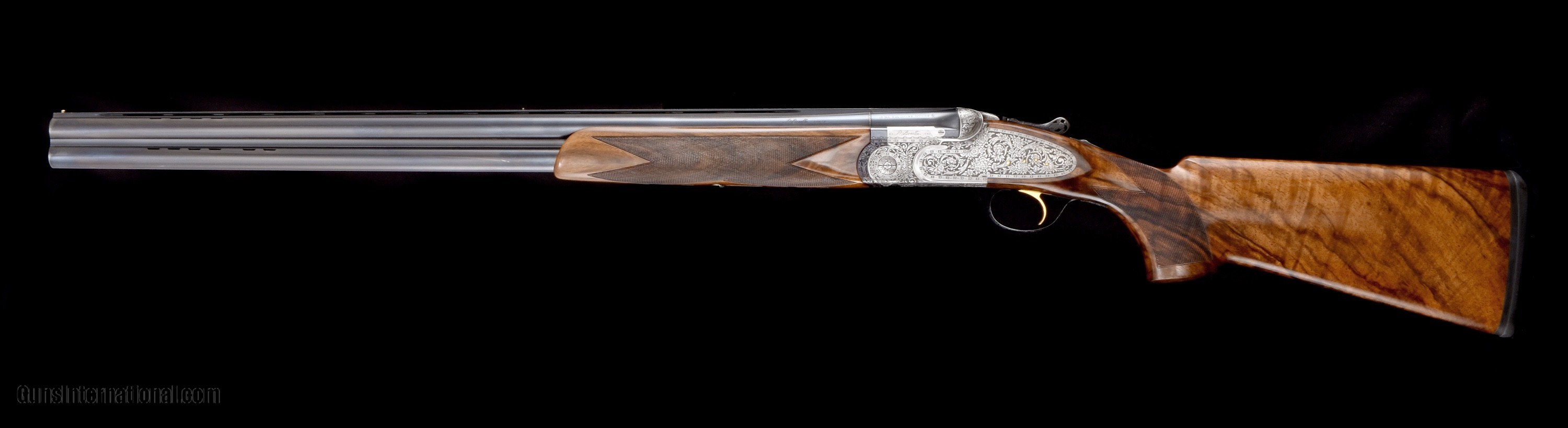 Description: Beautiful Beretta S3 EELL 12ga target gun. Made with 28" Bohler Steel barrels that are ported at muzzle end. Forend is checkered in point pattern with engraved and blued latch release and iron. Sidelock is beautifully floral scroll engraved with gold washed pins in near full coverage as seen in the photos. Blued and engraved trigger guard. Gun made with gold plated single trigger, auto ejectors, non-auto safety. Flat knob pistol grip walnut buttstock is beautifully figured as seen in the photos and terminates with a thin black pad. Stock has a right hand palm swell. Overall, the gun remains in excellent condition with more than 95% beautiful finishes remaining throughout. Bores are brilliant and shiny. Mechanics are excellent. The gun is tight and has not been shot a great deal. These Beretta's represent a great value in today's marketplace. They are fully handmade and finely polished with gold washed internals. This gun is priced at $8795 plus shipping to your FFL. Please dont hesitate to contact me with any questions or reasonable offers at (704) 280-2382 or via PM on this site. SOLD Curio/Relic: Yes Shotgun Gauge: 12 Gauge Manufacturer: Beretta Model: S3EL Serial Number: C05424B Barrel Length: 28 Chambers: 2-3/4 Ejectors: Yes Condition: Excellent Metal Condition: Excellent Wood Condition: Excellent Bore Condition: Bright and shiny Triggers: Gold plated Single Trigger Stock Comb: 1-1/2 Stock Heel: 2-1/8 Butt Pad: Thin "Kick-EEZ" brand pad LOP: 15 Weight: 7lbs. 8oz. Chokes: Tubes |