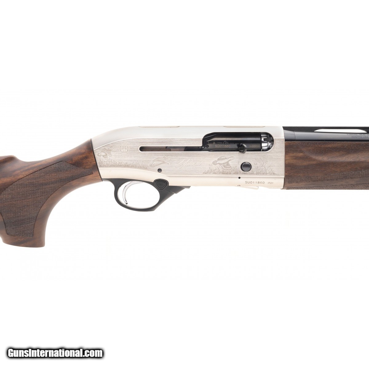 28"" barrel with vented rib and red fiber optic front sight bead. Comes with a walnut stock and kick-off device. In the box you get a shim kit and 5 chokes. The nickel receiver has a wildlife scene engraved. NEW. UPC:082442923789