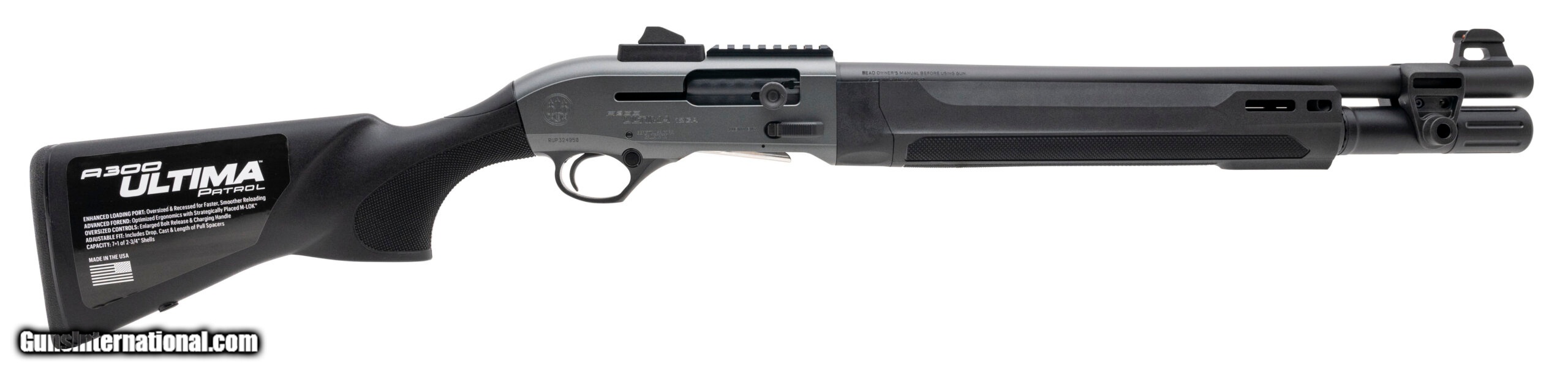 Description: "Beretta A300 Ultima Patrol Shotgun. 12 Gauge with an 19.1"" barrel. Semi-automatic tactical shotgun with an 7-shot capacity, synthetic fixed stock, and Anodized black finish. New. UPC: 082442959849 (STOCK PHOTO) SOLD |