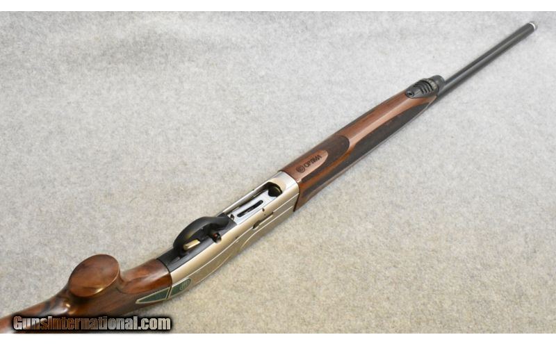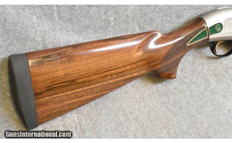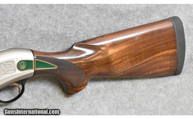 Description: Teknys Gold model with engraved hunting scenes, jewelled breech bolt and carrier. Has a aftermarket bolt release. SOLD Caliber Info: 12 Ga. Chambers: 3 inch Metal Condition: very good condition, some scattered light handling marks on the barrel, a few handling marks on the left side of the receiver Wood Condition: very good condition, a few spots of pressed down checkering on the for end, a couple light dings on the stock Bore Condition: bright and shiny Barrels: 30 inch vent rib Triggers: single, smooth gold trigger Stock: checkered deluxe walnut stock with green enamel inserts Stock Dimensions: 14 3/4 inch lop Fore End: checkered walnut Butt Pad: checkered rubber pad Weight: 8 lbs 6 oz Sights: dual white dots Chokes: screw in, Optima style (comes with one Full choke) Extras: none, no box or case Item Location: Kansas City, KS |
