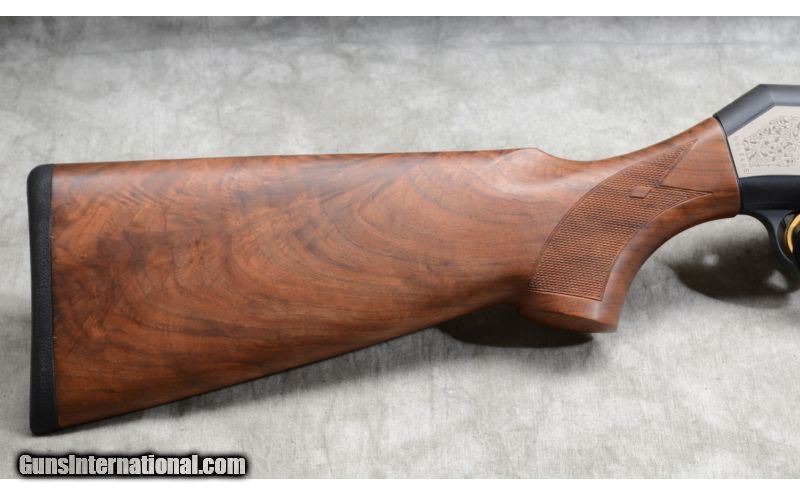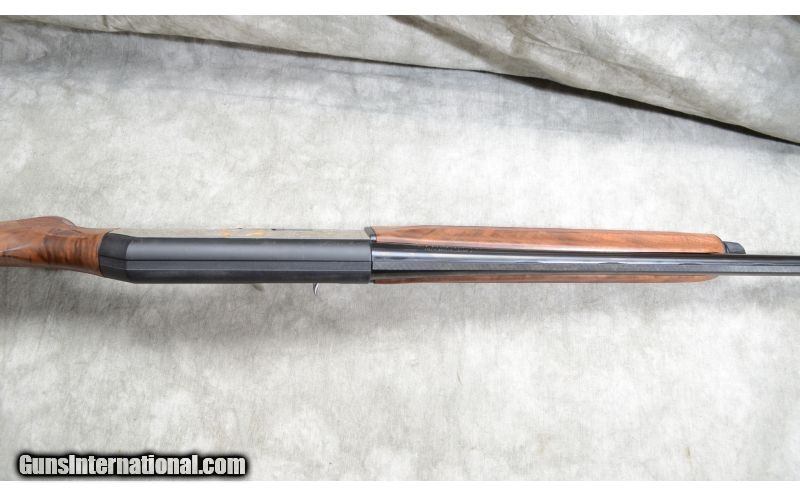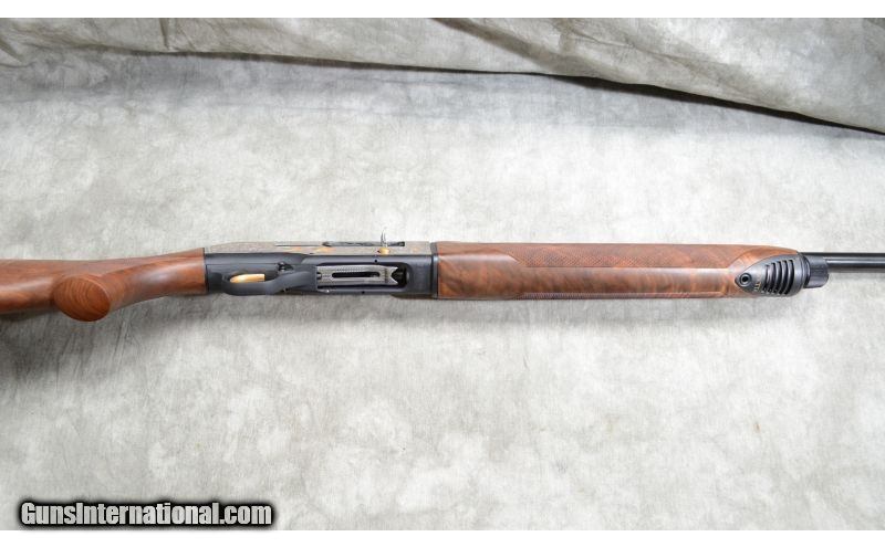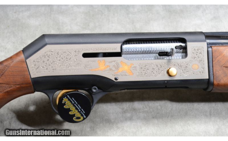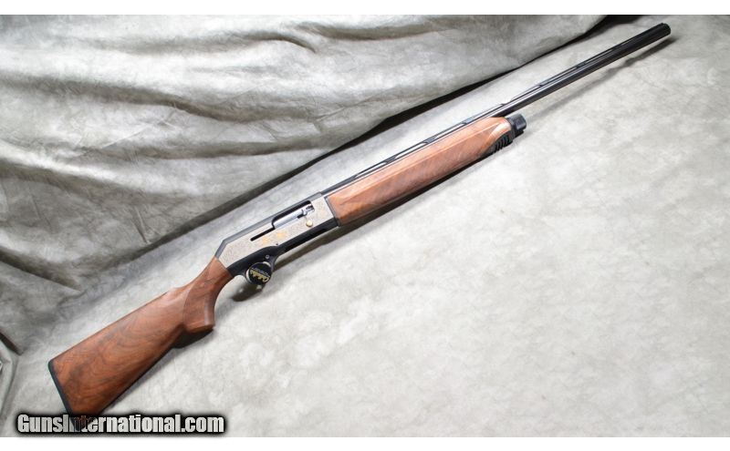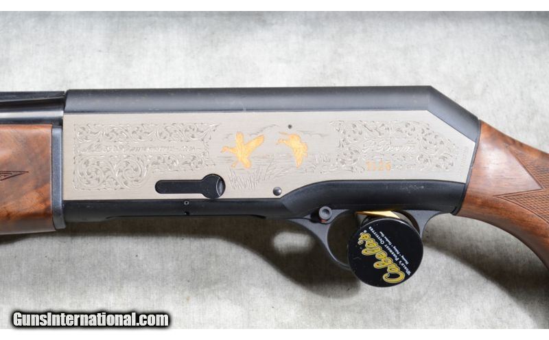 Description: This limited edition shotgun features gold-filled games scenes on the flats, better grade walnut with very pleasing grain, jeweled bolt and vent rib. SOLD Caliber Info: 12 Gauge. Chambers: 2 3/4 and 3 inch semi-auto. Metal Condition: Excellent. Wood Condition: Excellent with very little signs of use. Bore Condition: Shiny and bright. Barrels: 28 inch, blue. Triggers: Factory trigger, gold. Stock: Checkered select grade walnut. Stock Dimensions: 14 -3/8 inch LOP. Fore End: Matching checkered walnut. Butt Pad: Rubber pad. Weight: 7 lb. - 4 oz. Sights: Ventilated rib with gold bead. Chokes: Interchangeable screw-in chokes. Extras: Case and chokes. Item Location: Rogers,, MN |