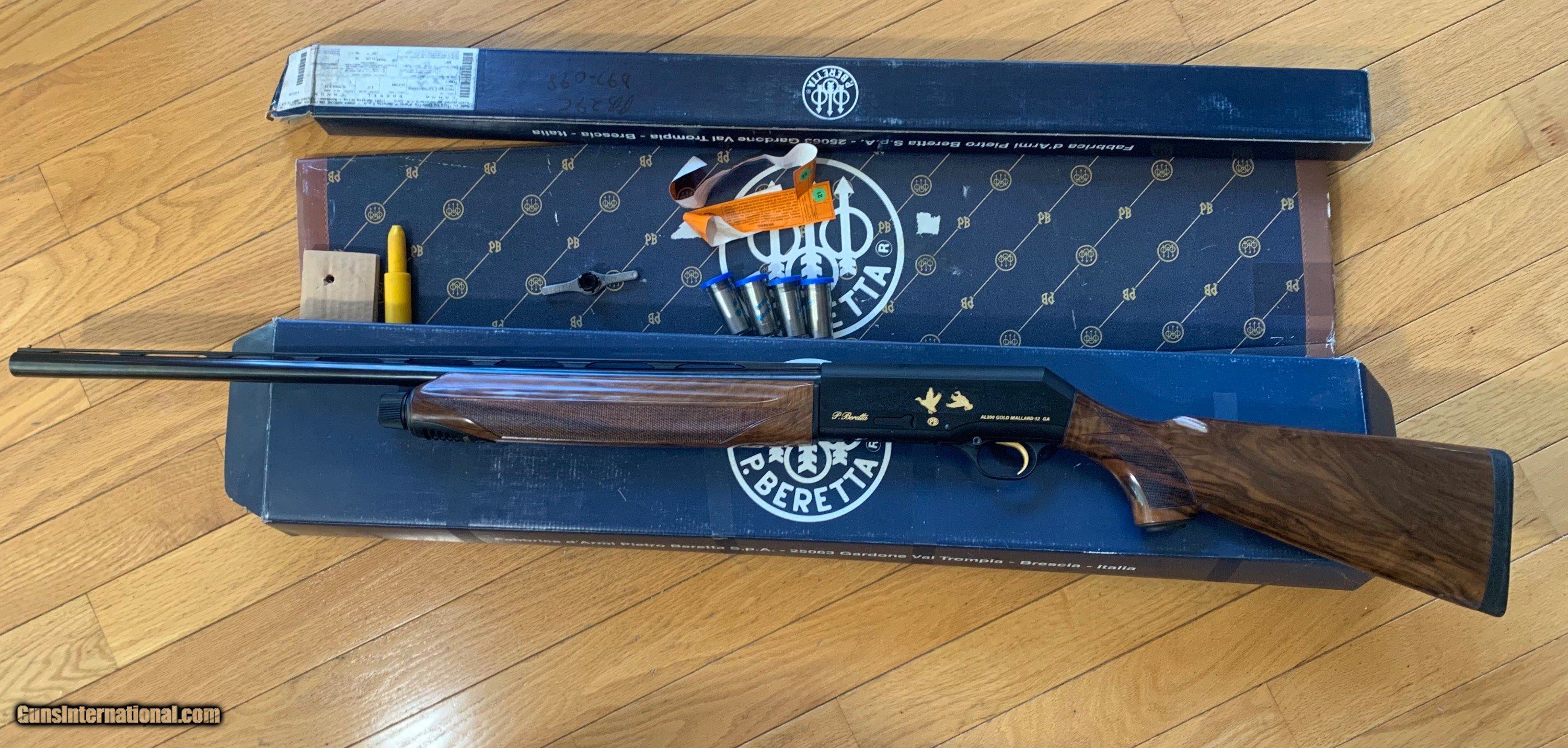 Description: Beretta AL390 Deluxe Gold Mallard 28" barrel 12 Ga. 3" chamber. Blued receiver with Gold inlaid Snipe,mallards/and gold P.Beretta signature and AL 390 gold mallard.12ga. On receiver sides. Beautiful deluxe walnut stock and forearm. Gun is like new original box, four mobil chokes included: skeet, IC, Mod. Full and extra full. Choke tube wrench. buyer pays actual shipping costs and insurance FFL required. SOLD Shotgun Gauge: 12 Gauge Manufacturer: Beretta Model: AL390 deluxe gold Mallard Chambers: 3” Condition: Like new Metal Condition: 99% Wood Condition: 99% Bore Condition: Mint Barrels: 28” |