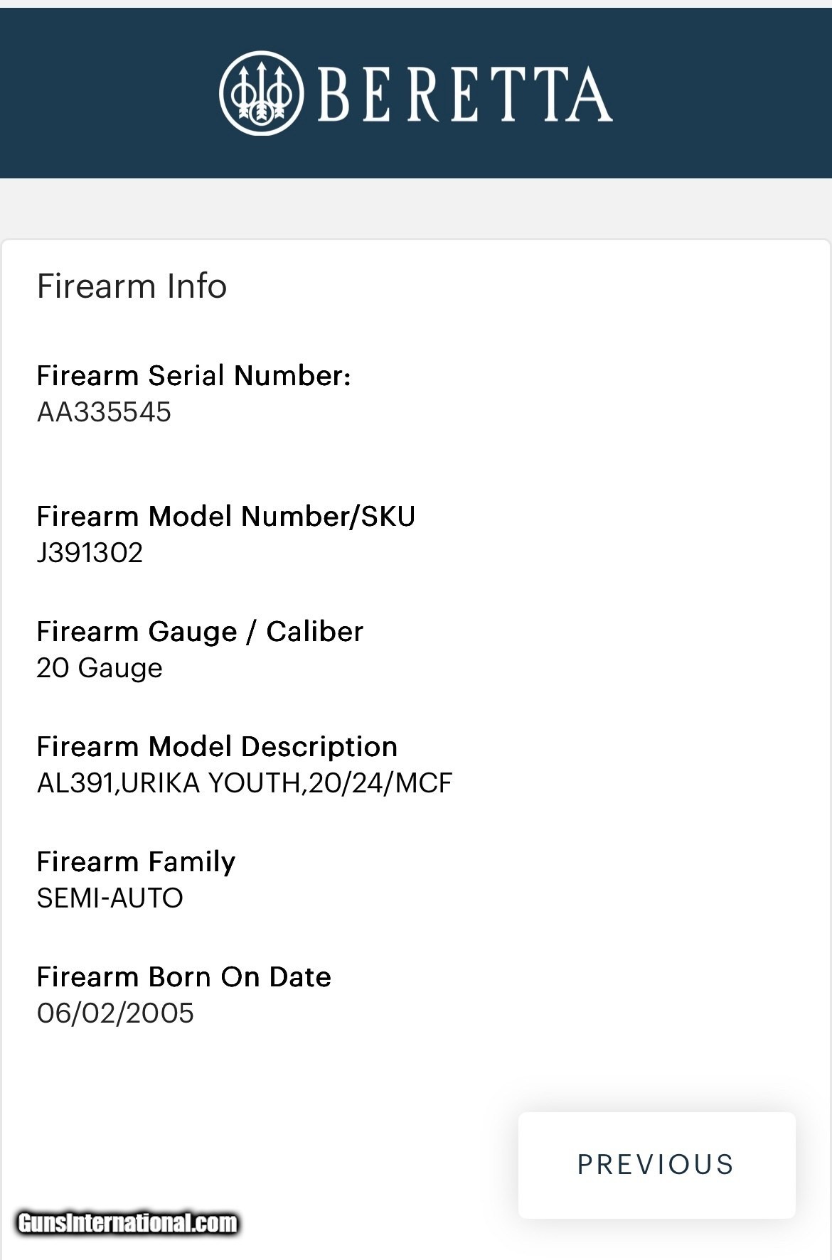 Description: The Beretta AL391 Youth is a compact, youth-oriented version of Beretta’s AL391 semi-automatic shotgun line. Built around Beretta’s reliable gas-operated action, the Youth model is intended for smaller or younger shooters who need a lighter, shorter, easier-to-handle firearm without sacrificing the semi-auto’s reduced recoil and follow-up-shot capability. Hard to find yet excellent condition - Beretta youth 391 20 gauge. Metal is near perfect. A few marks on the stock & forearm (see pics). 24" barrel - 3" chamber. Comes with factory case, paperwork, wrench, 5 Mobil chokes (C, IC, M, IM, F). Also has two Beretta pads (~½” & ~¾”). LOP currently 13.75” with the thick pad installed Weight: 5.9 pounds Shotgun Gauge: 20 Gauge Manufacturer: Beretta Model: AL391 Youth Barrel Length: 24” Price: $2,250.00 Contact Seller |