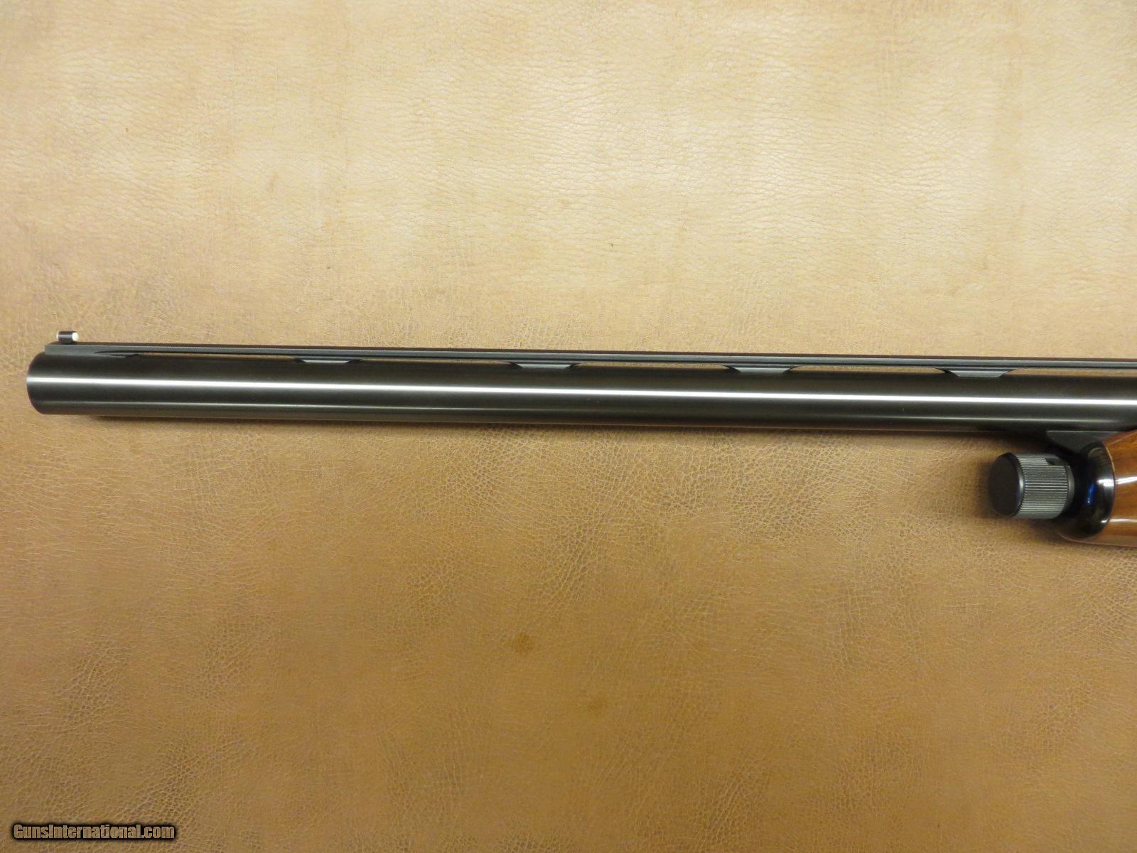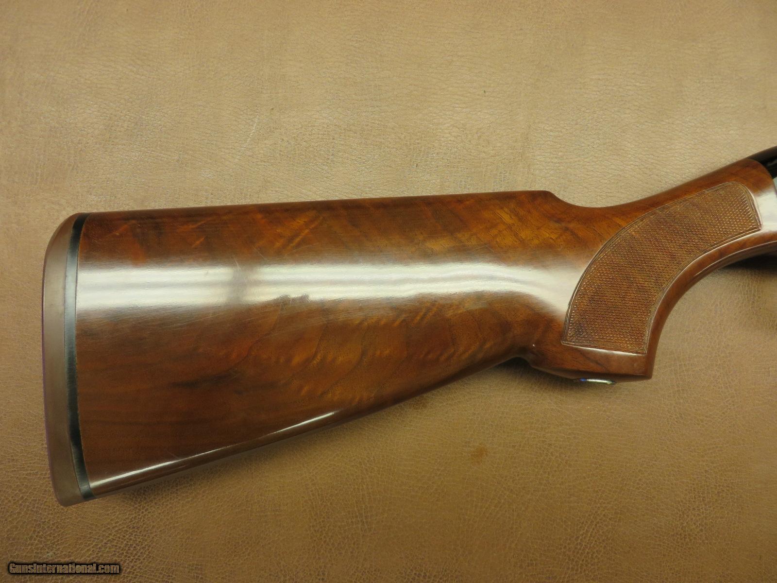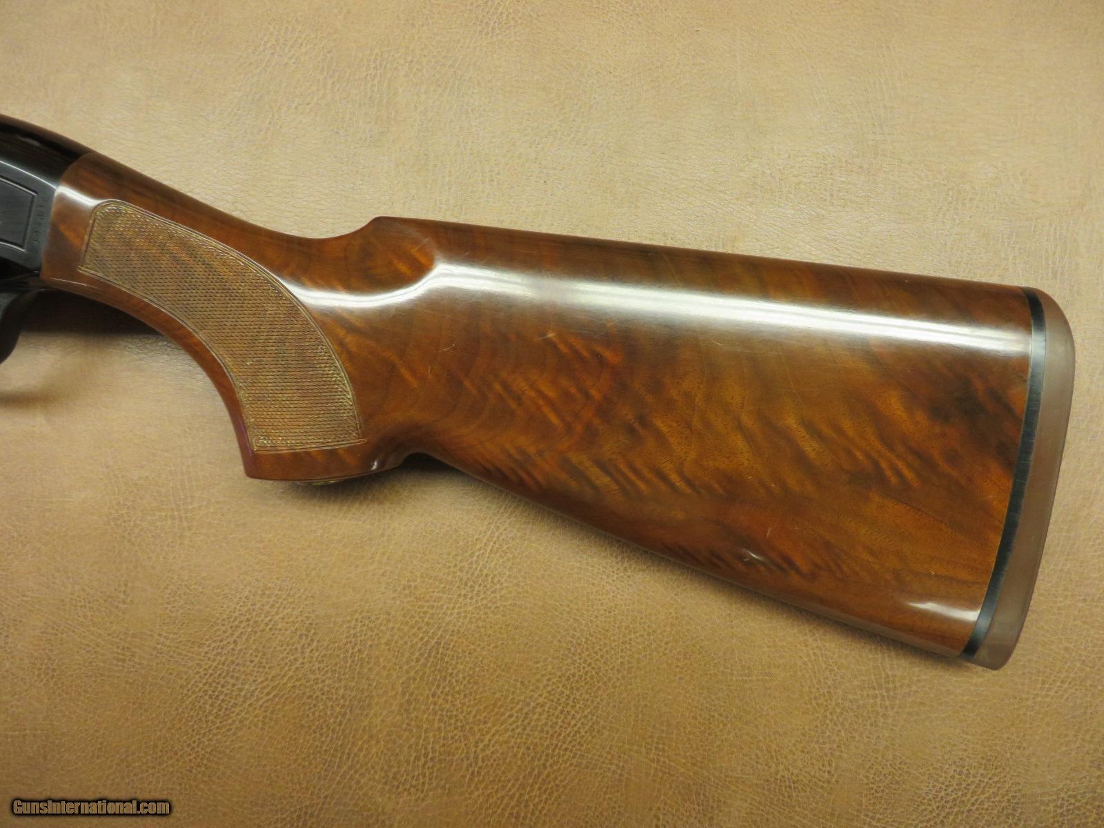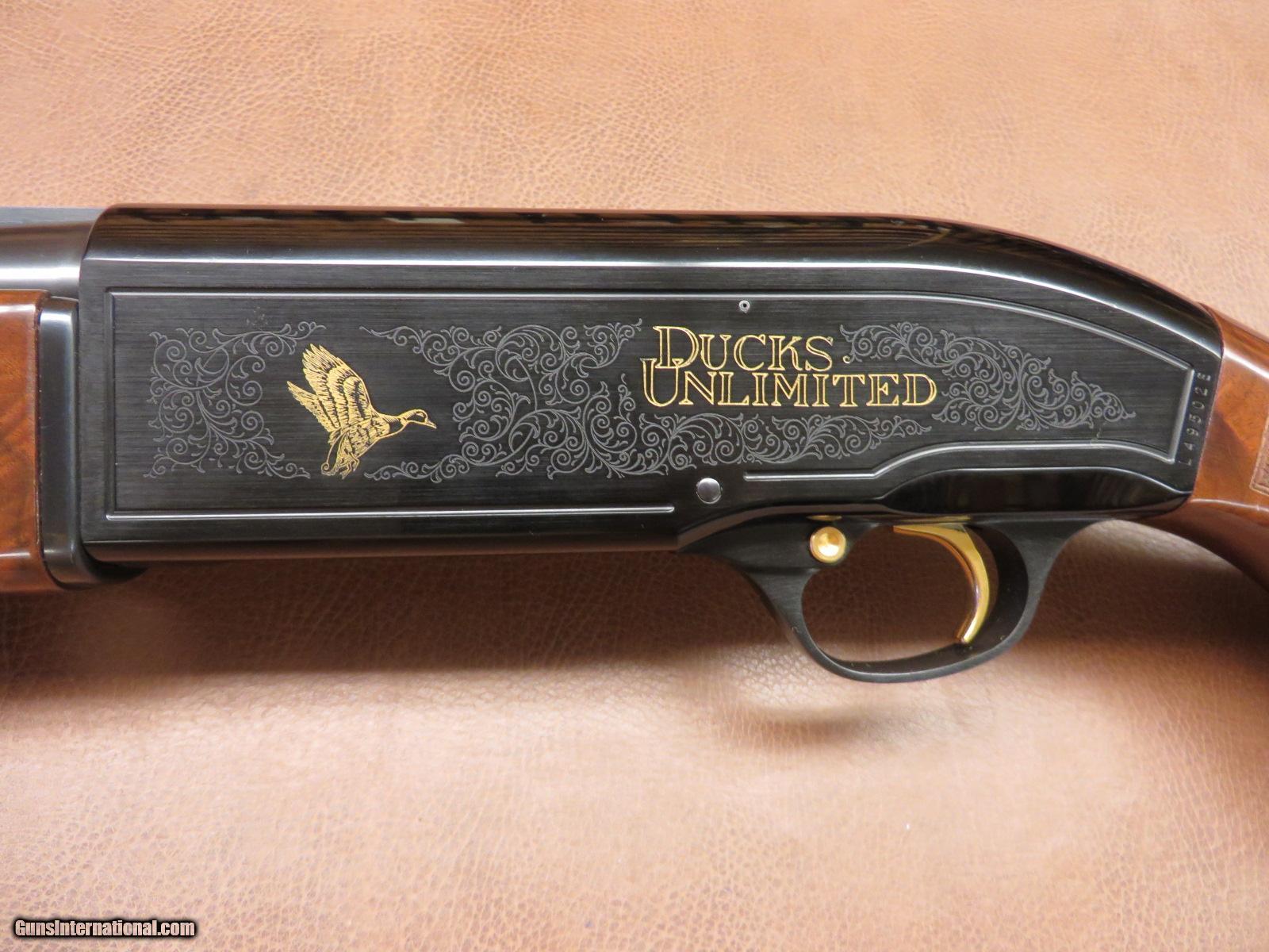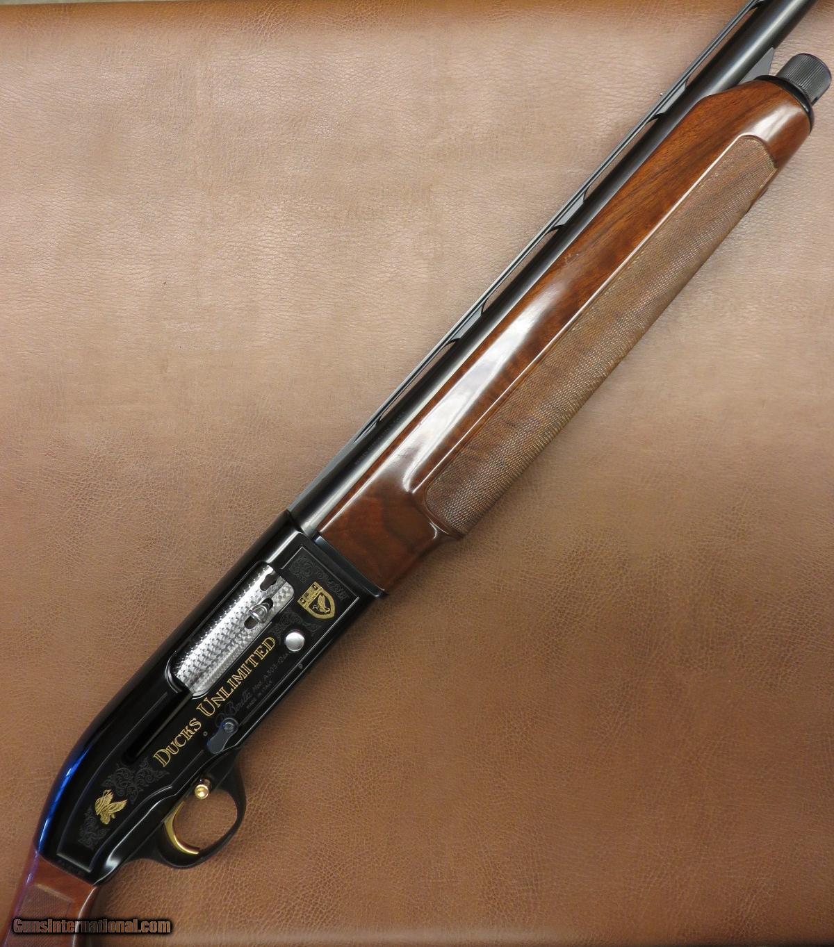 Description: 1986 Ducks Unlimited dinner gun. 12 ga. 3 inch chambered semi auto has 28 inch vent rib choke tubed barrel. Engraved receiver with gold trigger and safety. Jeweled breech bolt and shell lifter. Nicely figured checkered walnut with original rubber butt pad. North American Hunt Club medallion in pistol grip cap. Metal is 99% and the wood is 95%+. Comes in original Ducks Unlimited hard case with papers, 3 choke tubes, and wrench. SOLD |
