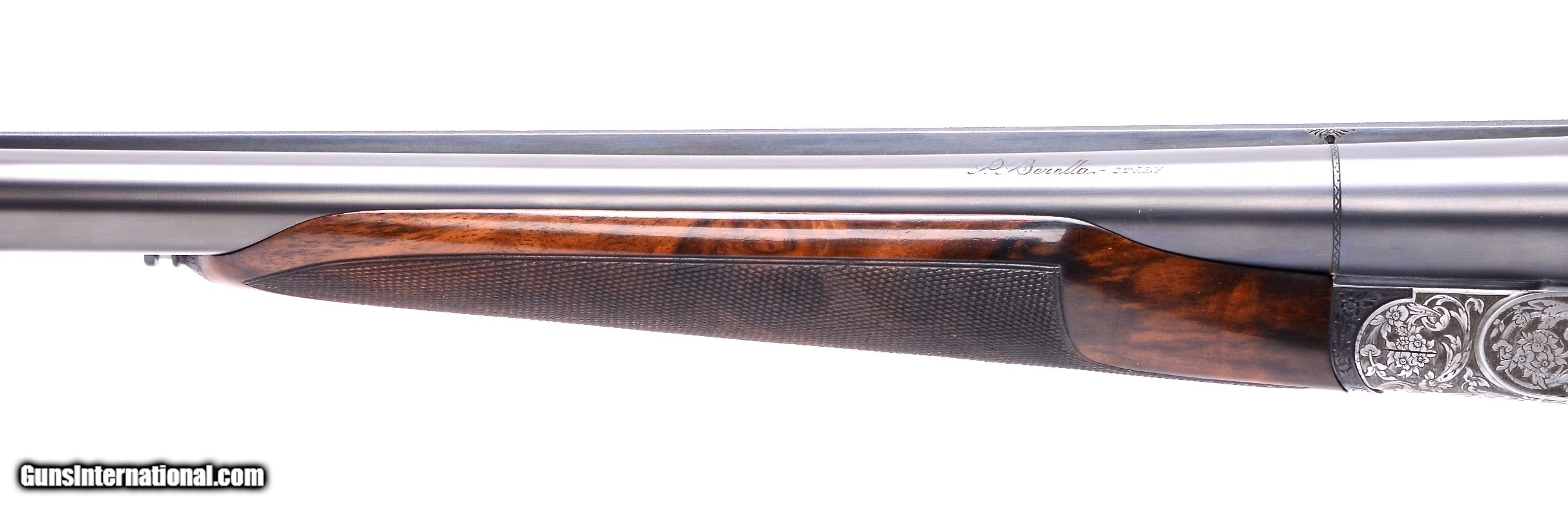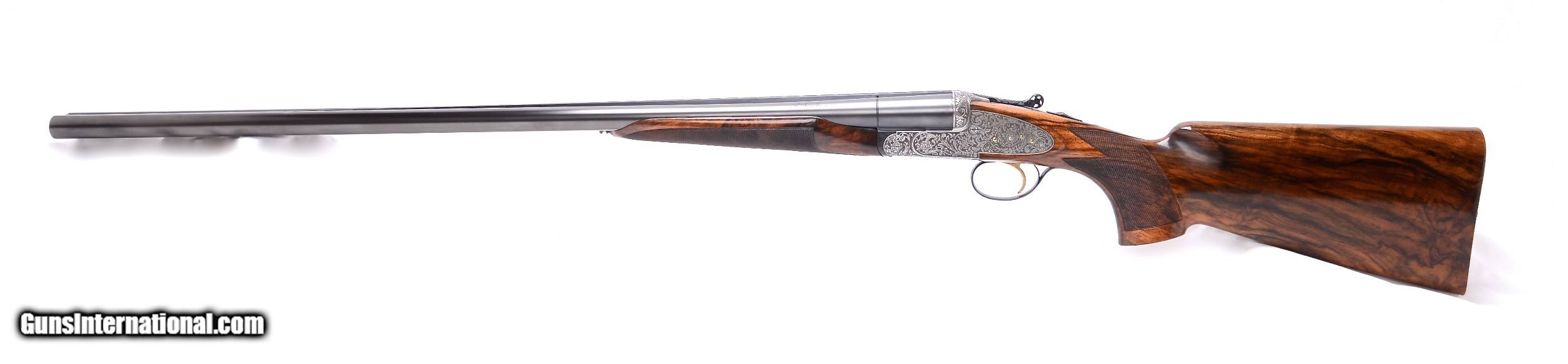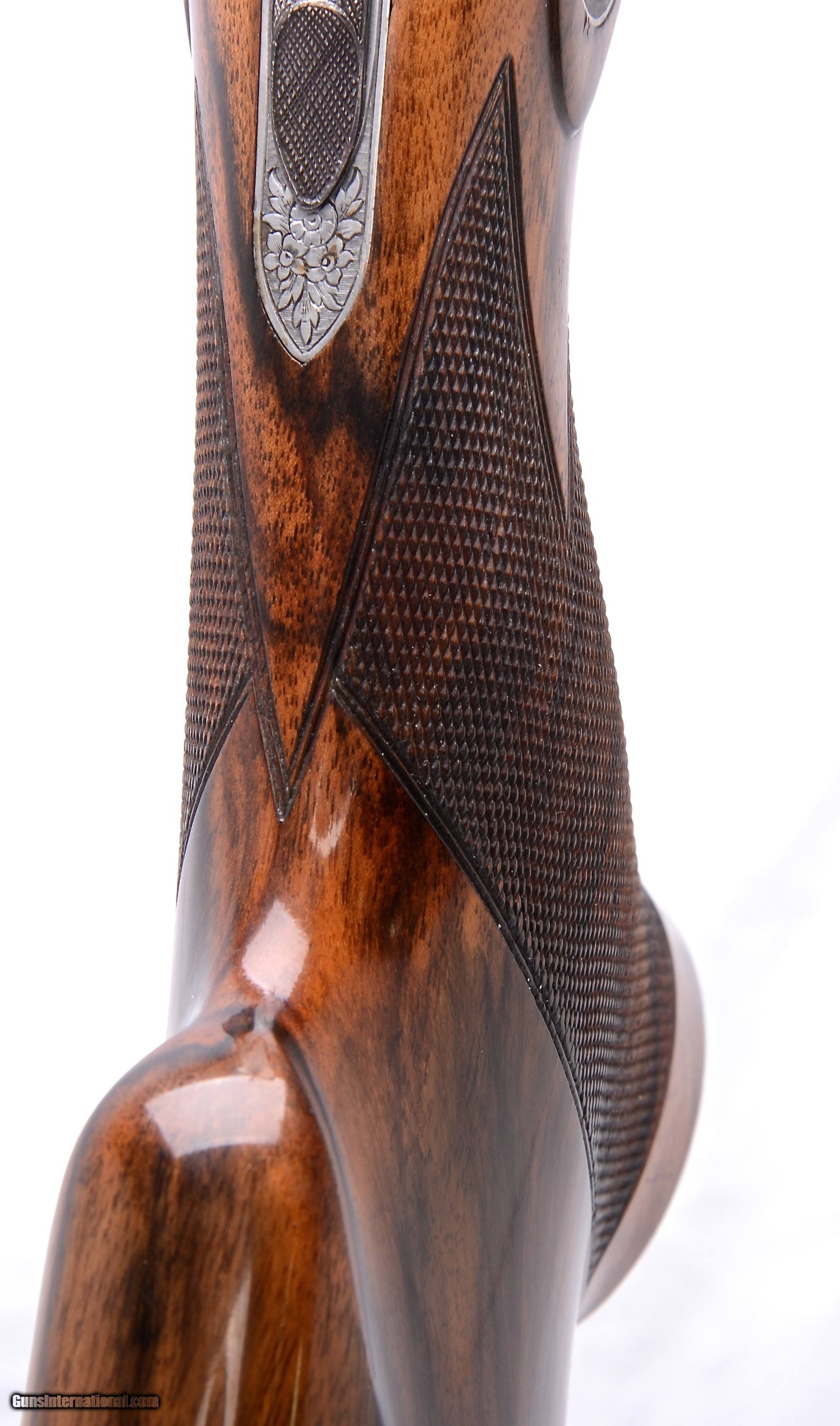 Description: Beretta 451EELL true sidelock 12 gauge SxS shotgun. Designed as a Live Pigeon gun this exquisite sidelock has 30” barrels with a raised concave solid rib that tapers from 10.69mm (27/64”) to 5.75mm (7/32”) at the muzzle. The bore diameters are .727 with 2 3/4” chambers and are choked to .030” full in the right tube and .042” extra full in the left barrel. Additionally the barrels are made of premium, mirror bright, Bohler Antinit steel. The magnificent floral and scroll engraving on the receiver, top lever and trigger guard was done by Beretta master engraver F. Ferraute. If this gun has been fired is was done so very sparingly as it is 99% overall. Single non-selective trigger, non-automatic safety and Anson forearm latch. Built exclusively for a right hand shooter with a right hand palm swell the stock has a 14 1/2” LOP to the checkered butt, 1 3/8” DAC, 1 7/8” DAH with a 1/4” RH cast. Weighs in at 7 lbs. 4 oz. and balances nicely between the hands. Made in 1982. Spectacular true sidelock Beretta SxS. $24,900.00 SN: H0848 SOLD |