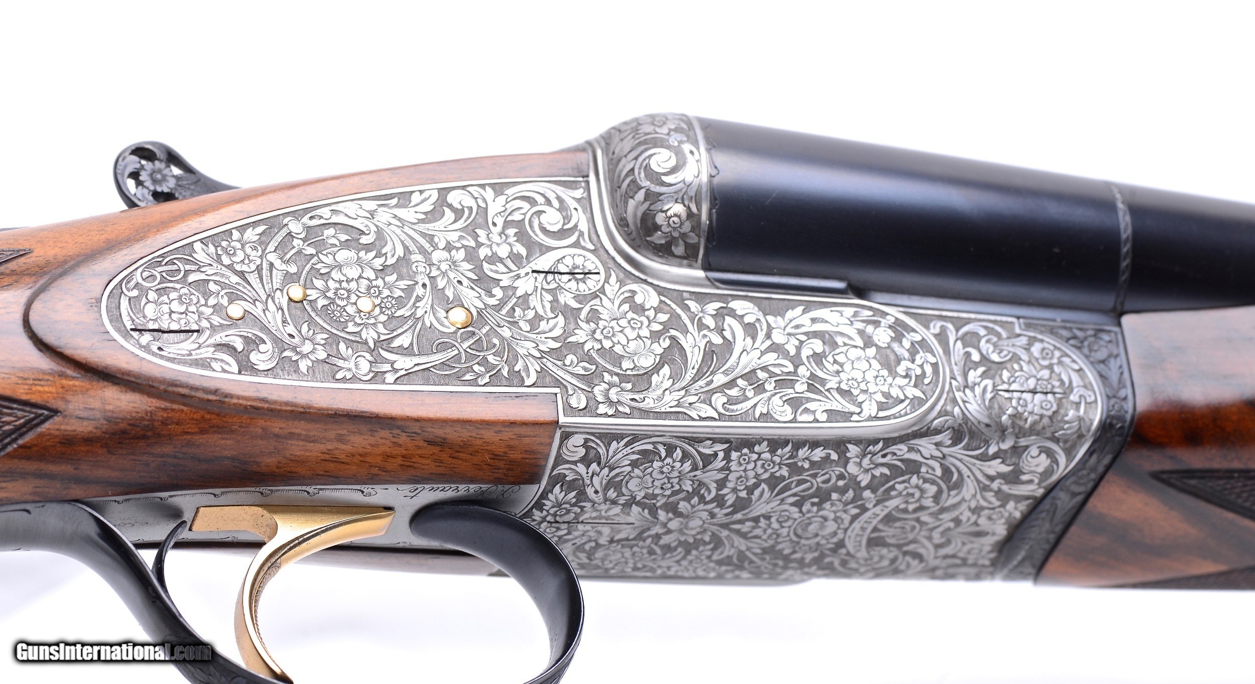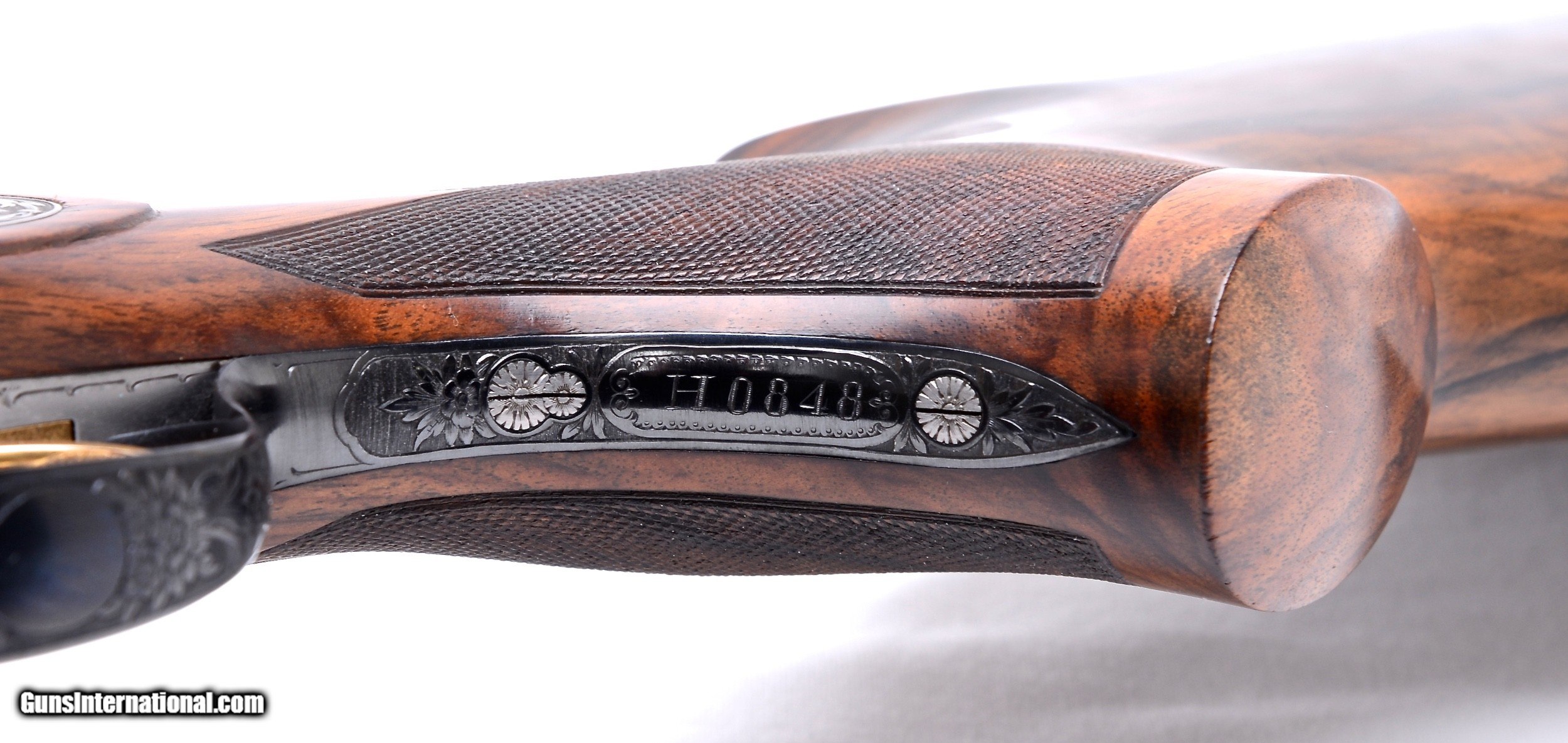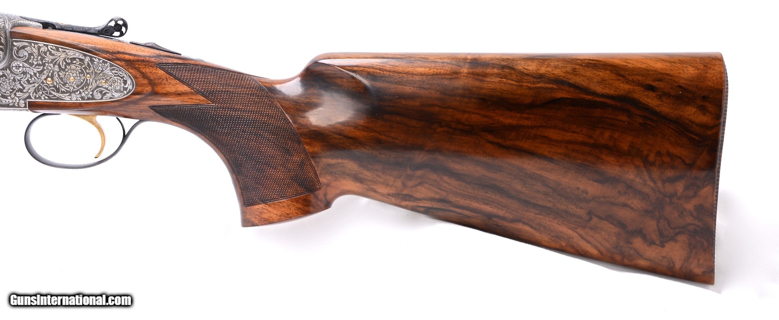 Description: Beretta 451EELL true sidelock 12 gauge SxS shotgun. Designed as a Live Pigeon gun this exquisite sidelock has 30” barrels with a raised concave solid rib that tapers from 10.69mm (27/64”) to 5.75mm (7/32”) at the muzzle. The bore diameters are .727 with 2 3/4” chambers and are choked to .030” full in the right tube and .042” extra full in the left barrel. Additionally the barrels are made of premium, mirror bright, Bohler Antinit steel. The magnificent floral and scroll engraving on the receiver, top lever and trigger guard was done by Beretta master engraver F. Ferraute. If this gun has been fired is was done so very sparingly as it is 99% overall. Single non-selective trigger, non-automatic safety and Anson forearm latch. Built exclusively for a right hand shooter with a right hand palm swell the stock has a 14 1/2” LOP to the checkered butt, 1 3/8” DAC, 1 7/8” DAH with a 1/4” RH cast. Weighs in at 7 lbs. 4 oz. and balances nicely between the hands. Made in 1982. Spectacular true sidelock Beretta SxS. $24,900.00 SN: H0848 SOLD |