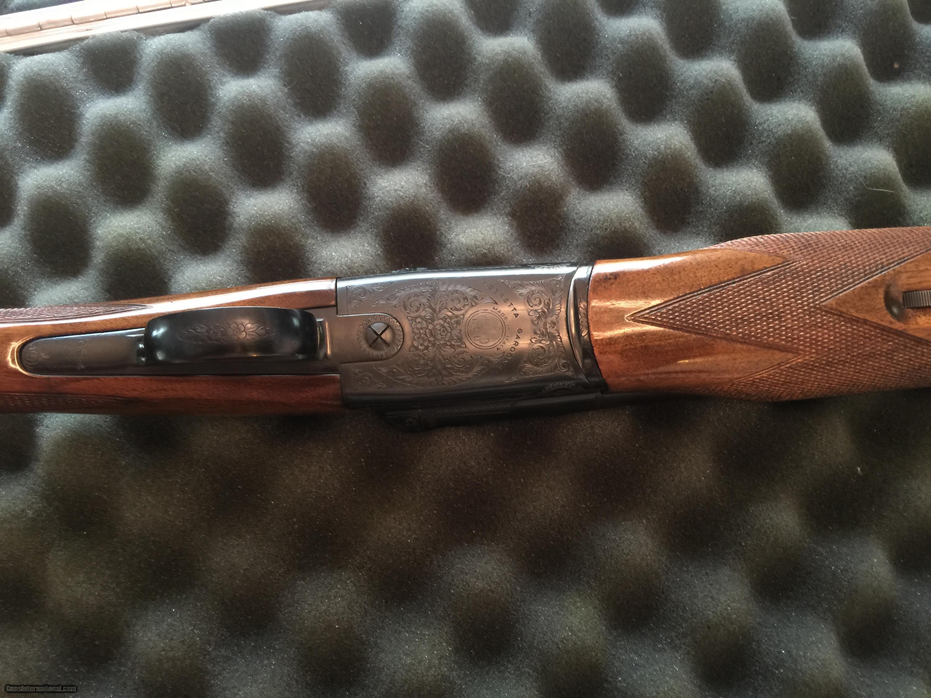 Description: Great 70s Beretta quality GR-4,their highest grade boxlock loaded with features including vent rib,jewelled flats,single trigger,auto safety,ejectors,beavertail forend,hand engraved scroll,silver inlaid pigeon on opening lever and hand checkered stock and forend.This gun is unmolested and unaltered at 99% with opening lever way to the right.The stock demensions are standard Beretta at 141/4 LOP and 11/2 and 21/2 to plastic buttplate.The barrels are 28" mod and full with hand filed vent rib and single bead front sight.The gun is very well balanced and lively at about 71/2 lbs.Great field gun or sporting clays SXS,especially if Brileys and a pad were added.A great value at less than 1/2 of current price for new Beretta SXS,thanks for looking! SOLD |