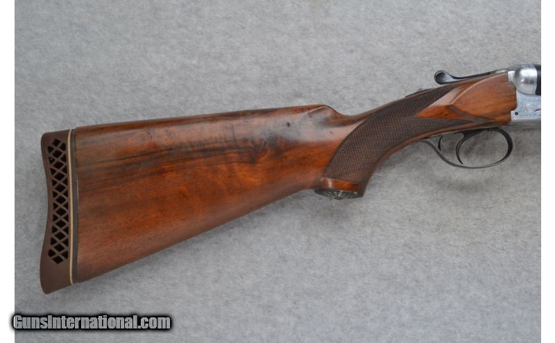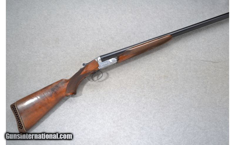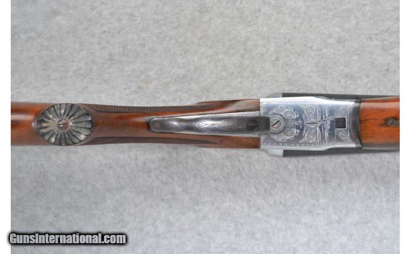 Description: Silver receiver is nicely engraved with scroll and border. SOLD Manufacturer: Made in Italy. Caliber Info: 12 GA Chambers: 2 3/4 inch. Metal Condition: Shows some age, light wear and freckling. Wood Condition: Shows some light wear and light handling marks. Two small cracks behind the top tang and behind the left side receiver at top. Bore Condition: Shiny. Barrels: 30 inches with a solid rib. Triggers: Single Stock: Checkered grip walnut pistol grip with a black cap. Stock Dimensions: LOP 14 1/8 inches. Fore End: Checkered grip walnut Beavertail style. Butt Pad: Pachmayr White Line rubber recoil pad. Weight: 7 lbs. 8 oz. Sights: Red bar high visibility front. Chokes: Fixed Full and Imp. Mod. Item Location: Richfield, WI |