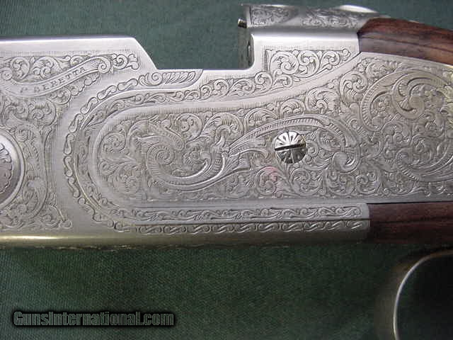 Description: 4629 Beretta Gallery 687 EE LL Diamond Pigeon 28 gauge 28 inch barrels, 4 screw chokes sk ic mod full, 14 1/2 lop checkered butt, 100% beautifully engraved coin silver sideplate receiver EXHIBITON WALNUT IN STOCK AND FOREND, VERY VERY HEAVILY FIGURED. gun is new in case with all papers. Don't miss this exquisite beauty. SOLD |