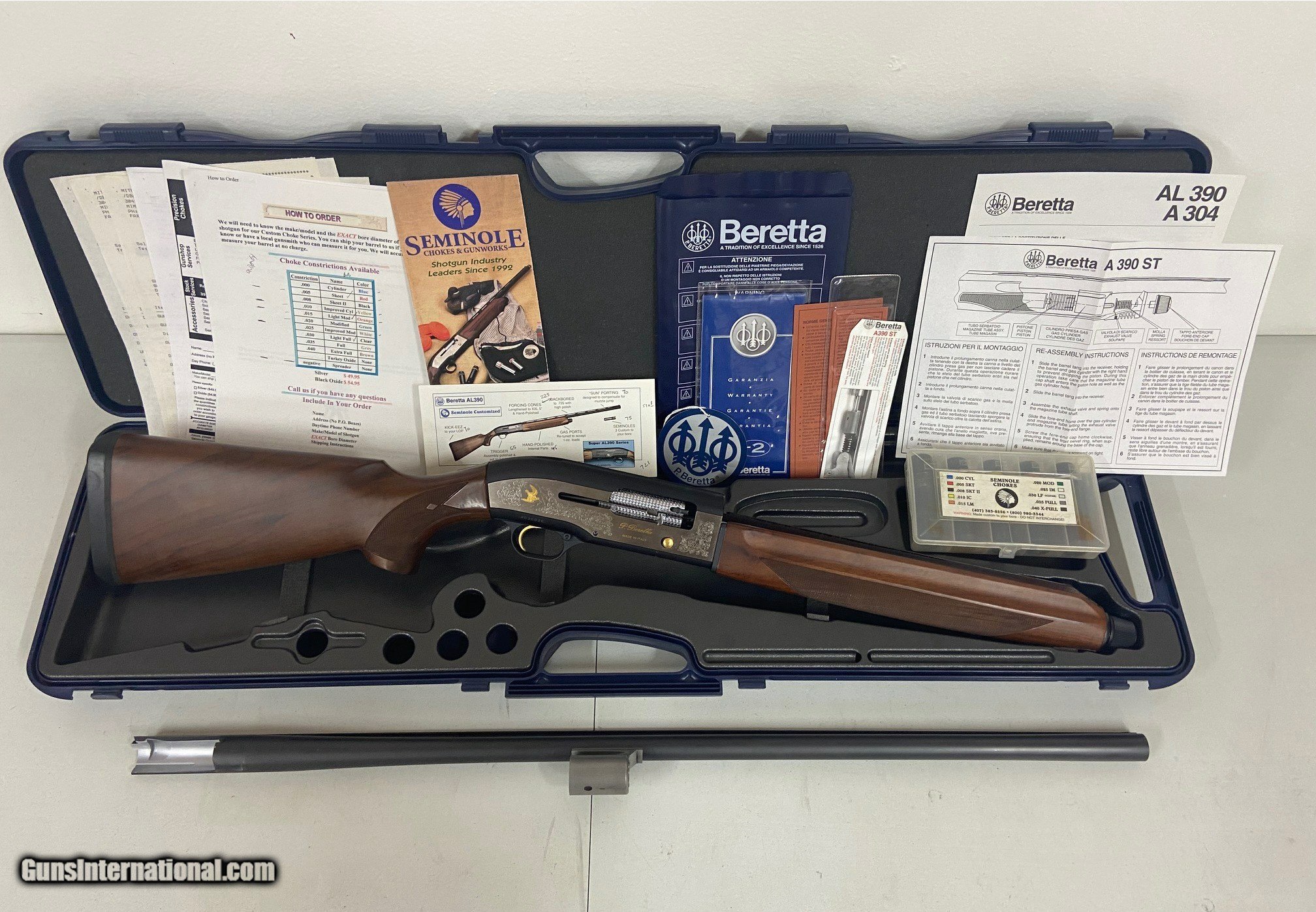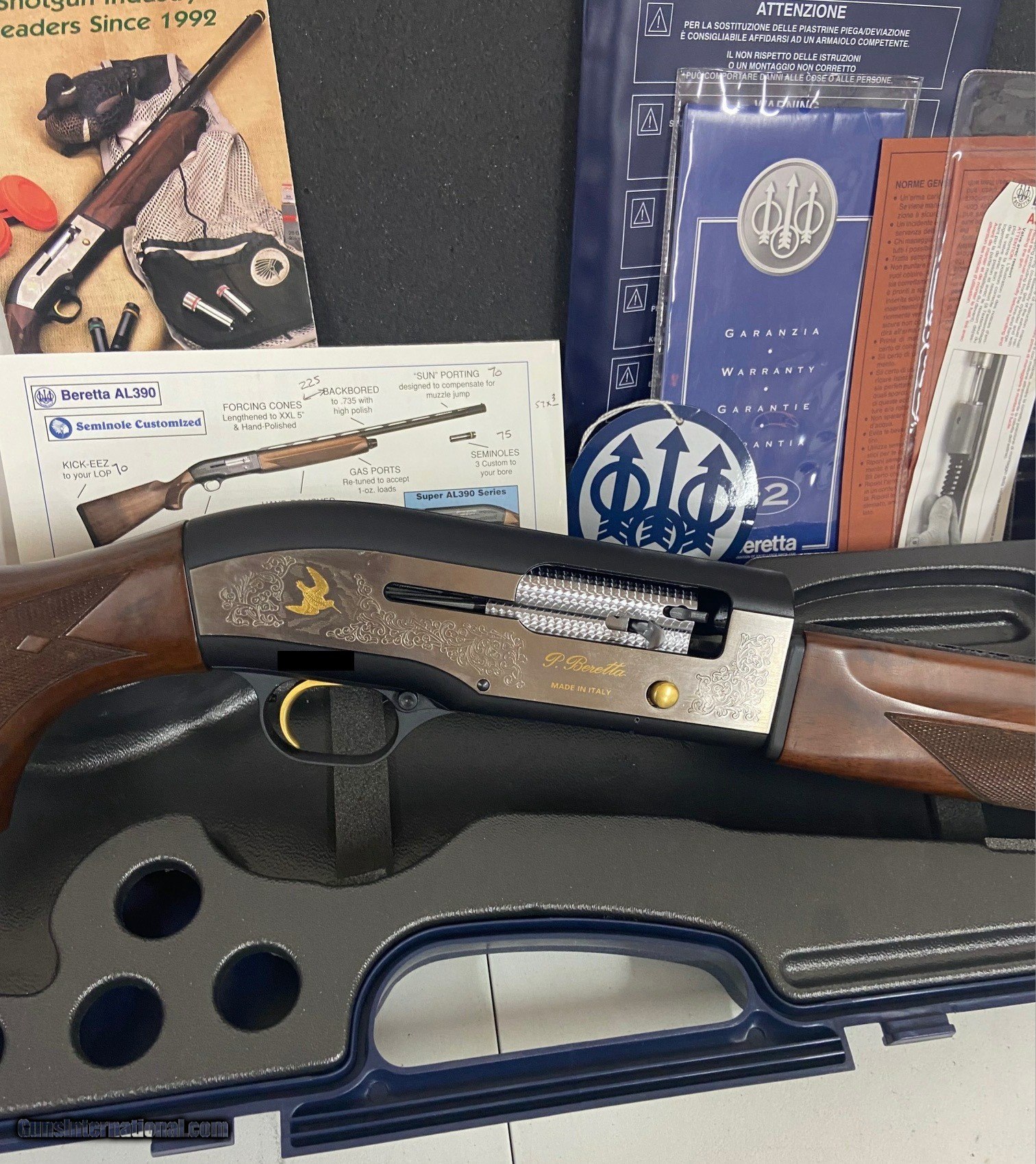 Description: Beretta 390 Gold sporter with 30" barrel and complete Seminole Gunworks Package. All provenance including the original receipt of purchase, Seminole receipts for upgrades, Seminole brochures, original Beretta manuals, instructions and all paperwork that came with the gun will be included. Everything is documented, it is not a pieced together gun. The trigger has been fine tuned and is very crisp with an over-travel stop, safety lock-out, polished internals, long cone, back-bore, moon porting and Seminoles proprietary SG2 choke system. Includes 5 chokes (SPREADER, SKT, IC, LM, IM). Gun is in incredible condition (98%) having been fired only about 2K shells. Original pad was replaced with a Kickeez pad without altering the wood. Includes ABS Team Beretta case. Gun is offered at $2600 plus shipping to your FFL. No trades. I will be happy to take any additional pictures requested. Thanks for looking and good shooting, Rey SOLD |