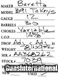 Description: Beretta 391 Teknys 12 gauge SOLD Serial Number: AA368262 Barrels: 30 Stock Comb: Adj Stock Heel: Adj Weight: 8lbs 9oz Chokes: Variable |