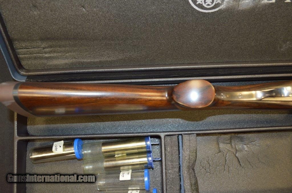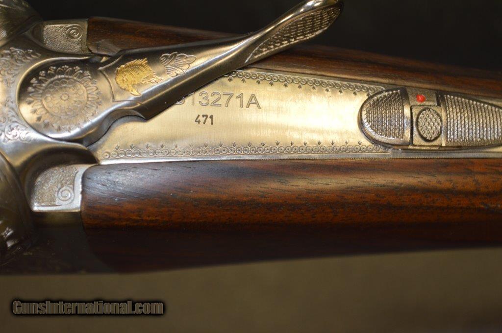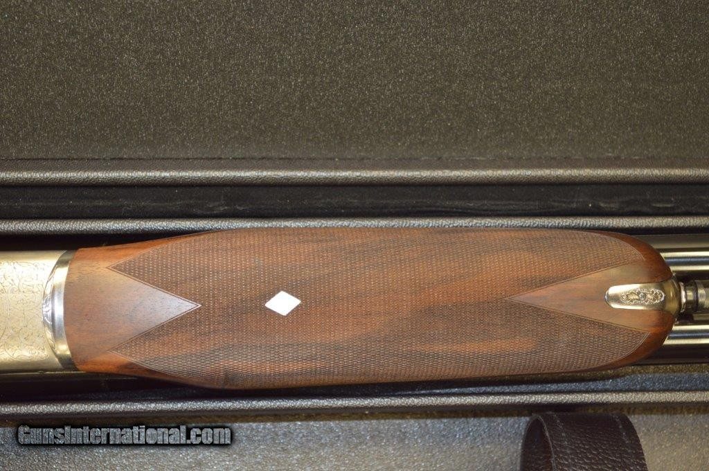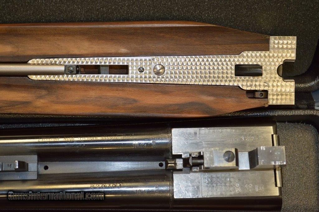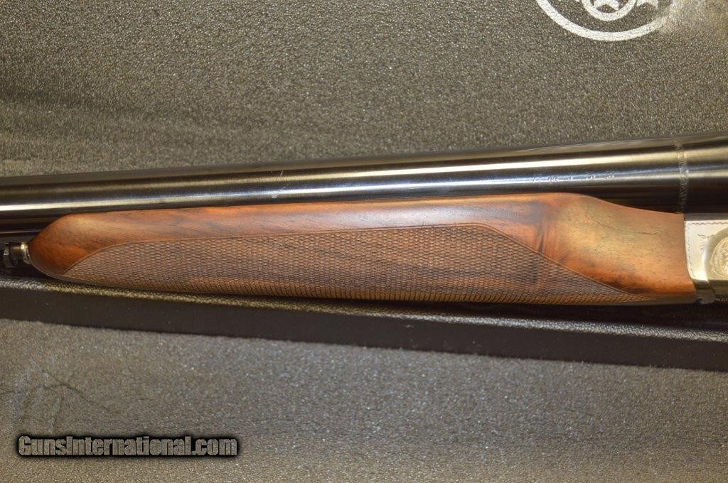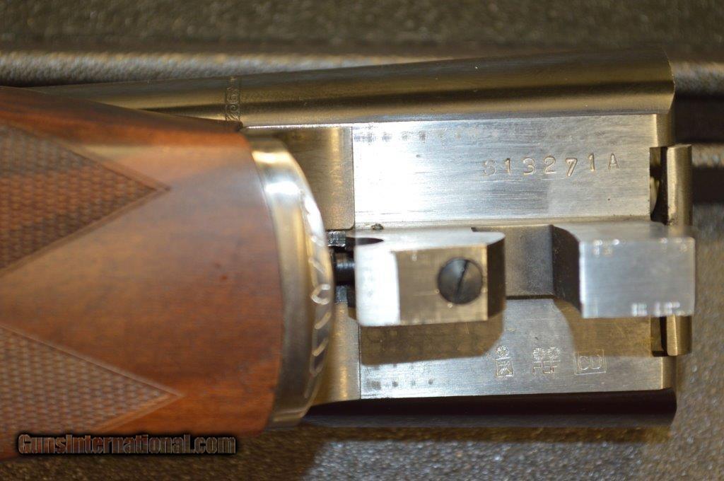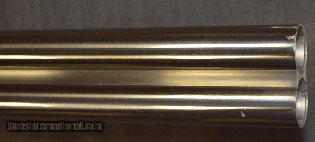 Description: This is a Beretta 471 Silver Hawk 12 gauge with 28" barrels. The 470 was released in Europe in 1996 to commemorate the firm's 470th anniversary and made it to the States in 1997. It has since been updated with new features and finish options under the Model 471 designation. The receiver is of nickel-chromium-molybdenum steel with an attractive satin-nickel proprietary finish. The receiver's sides have half, false sideplates machined as a part of their contours. Both sides-as well as the underside-feature tasteful, hand-chased scroll engraving. The bolsters, too, have deep scroll engraving, and the nickel trigger guard exhibits modest scroll ornamentation as well. Lock-up is by the proven Purdey double-underlug method-with a slight twist. Beretta angled the lugs slightly to keep the gun tight even as surfaces wear. The lugs are manufactured by electric discharge machining (EDM), and the barrels are fused to the monobloc with a laser-making this classically styled side-by-side utterly modern in its manufacture. The surfaces of the breechface and receiver under the barrels are jeweled. The barrels are cold hammer forged, and the 3-inch chambers are chrome-lined. Beretta's interchangeable Optimachokes are the 2 3/4-inch-long tubes and feature an elongated cone for the choke constriction. 5 chokes are included. The exterior bluing of the barrels is smooth and even. However, there are two small nicks, one in each tube, near the end of the barrels on the bottoms. The stock is of European walnut with a semi-gloss finish and this gun exhibits nice figure on both sides. The stock's wrist and fore-end are hand-checkered in a 20-line-per-inch, bordered point pattern with only a few flattened points. The wood-to-metal fit is excellent around the trigger guard and left intentionally proud at the receiver and fore-end. The 13-1/2" length of pull is ended with a Kick-Ezz recoil pad. Drop at the comb is 1-1/2" and drop at the heel is 2-3/8". An Anson push rod serves as a retainer for the fore-end. Interestingly, a small selector mounted in the fore-end iron's left rear allows the shooter to choose between selective automatic ejection or extractors only. The Silver Hawk has a single, selective trigger. The steel trigger blade is left in the white and it breaks around 4 lbs. The barrel selection is made via a button mounted on the tang safety. Pushing it to the left reveals a single red dot, and the right barrel fires first. Pushing it to the right selects the left barrel, and two red dots are revealed. It comes in a blue Beretta hard plastic, foamed lined, travel case as shown. Ships to Lower 48, W/Insurance: $45.00 SOLD |