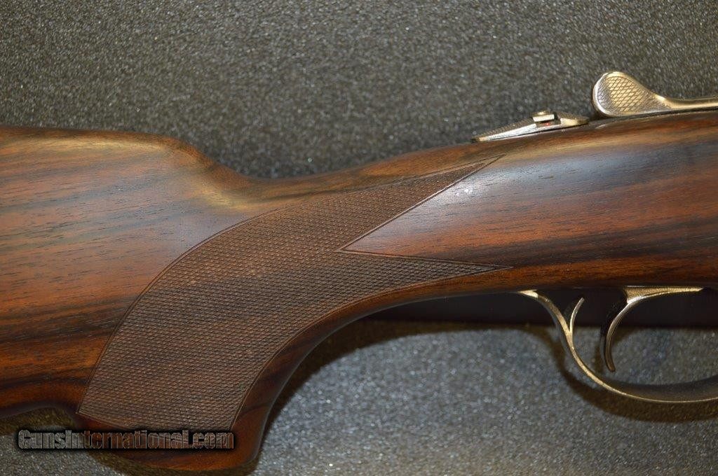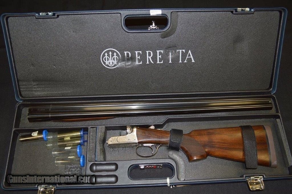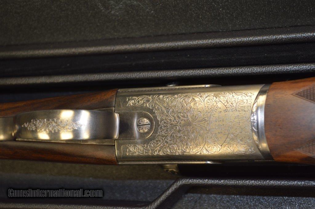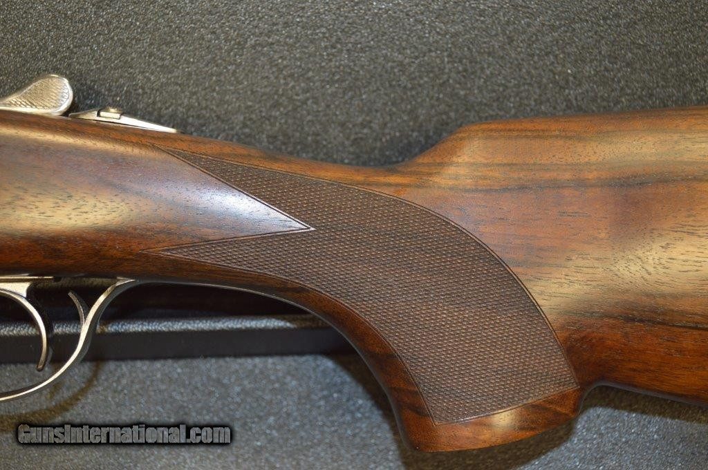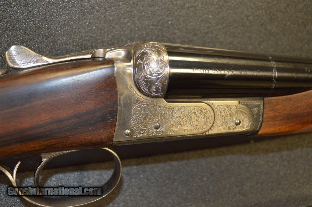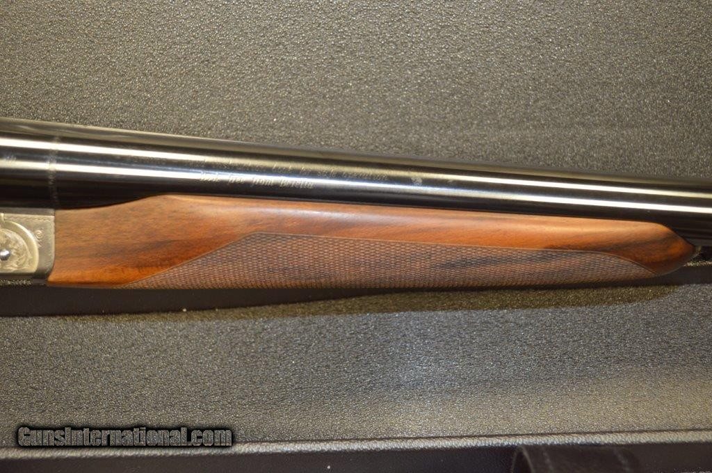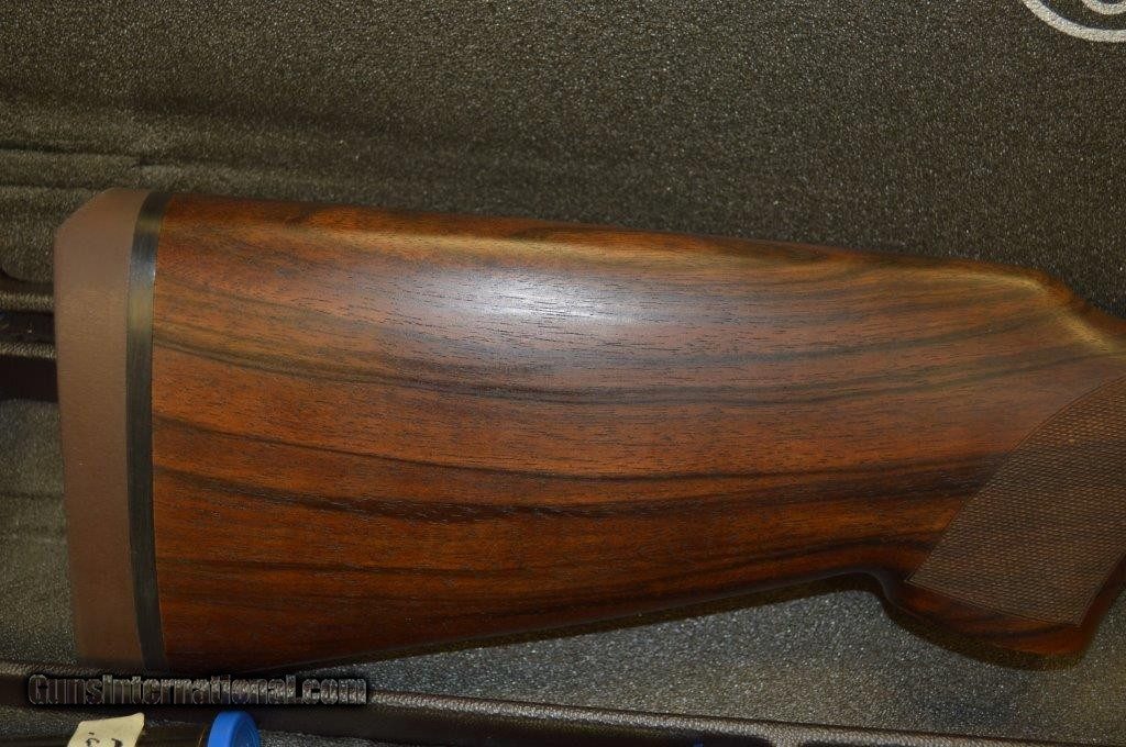 Description: This is a Beretta 471 Silver Hawk 12 gauge with 28" barrels. The 470 was released in Europe in 1996 to commemorate the firm's 470th anniversary and made it to the States in 1997. It has since been updated with new features and finish options under the Model 471 designation. The receiver is of nickel-chromium-molybdenum steel with an attractive satin-nickel proprietary finish. The receiver's sides have half, false sideplates machined as a part of their contours. Both sides-as well as the underside-feature tasteful, hand-chased scroll engraving. The bolsters, too, have deep scroll engraving, and the nickel trigger guard exhibits modest scroll ornamentation as well. Lock-up is by the proven Purdey double-underlug method-with a slight twist. Beretta angled the lugs slightly to keep the gun tight even as surfaces wear. The lugs are manufactured by electric discharge machining (EDM), and the barrels are fused to the monobloc with a laser-making this classically styled side-by-side utterly modern in its manufacture. The surfaces of the breechface and receiver under the barrels are jeweled. The barrels are cold hammer forged, and the 3-inch chambers are chrome-lined. Beretta's interchangeable Optimachokes are the 2 3/4-inch-long tubes and feature an elongated cone for the choke constriction. 5 chokes are included. The exterior bluing of the barrels is smooth and even. However, there are two small nicks, one in each tube, near the end of the barrels on the bottoms. The stock is of European walnut with a semi-gloss finish and this gun exhibits nice figure on both sides. The stock's wrist and fore-end are hand-checkered in a 20-line-per-inch, bordered point pattern with only a few flattened points. The wood-to-metal fit is excellent around the trigger guard and left intentionally proud at the receiver and fore-end. The 13-1/2" length of pull is ended with a Kick-Ezz recoil pad. Drop at the comb is 1-1/2" and drop at the heel is 2-3/8". An Anson push rod serves as a retainer for the fore-end. Interestingly, a small selector mounted in the fore-end iron's left rear allows the shooter to choose between selective automatic ejection or extractors only. The Silver Hawk has a single, selective trigger. The steel trigger blade is left in the white and it breaks around 4 lbs. The barrel selection is made via a button mounted on the tang safety. Pushing it to the left reveals a single red dot, and the right barrel fires first. Pushing it to the right selects the left barrel, and two red dots are revealed. It comes in a blue Beretta hard plastic, foamed lined, travel case as shown. Ships to Lower 48, W/Insurance: $45.00 SOLD |