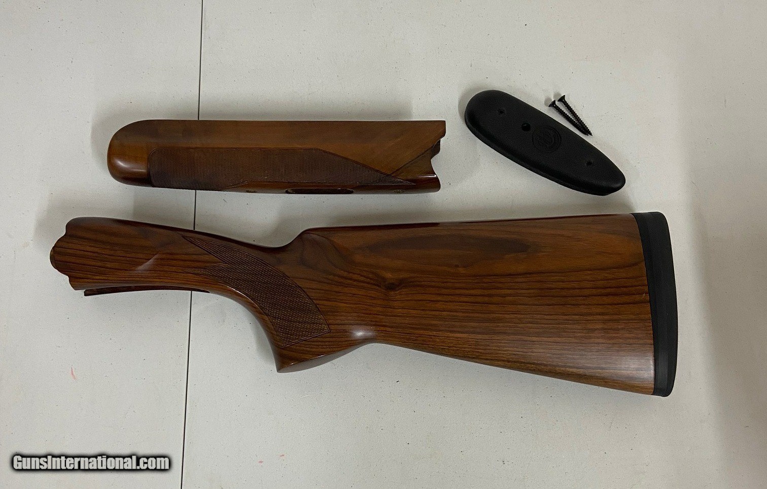 Description: Beretta 680, 682, 686, 687 12 gauge sporter stock set. I had a kickeez pad installed with gun nut machine screw inserts. The stock was not cut. It is factory length. The original pad is included in case you’d like to re-install it. Includes stock bolt. Excellent condition. Offered at $550. Thanks for looking and and good shooting, Rey SOLD |