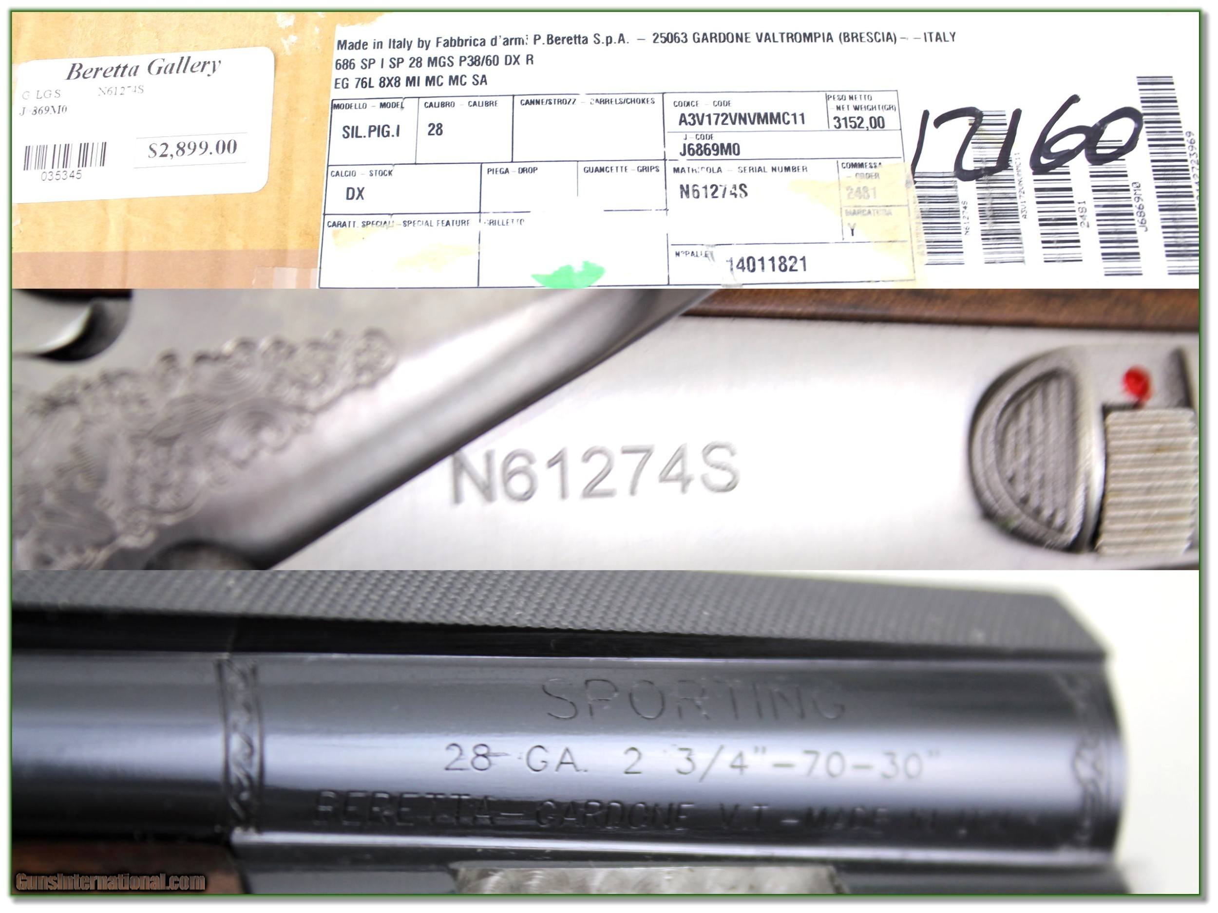 Description: This is a like new Beretta 686 Silver Pigeon 1 28 Gauge with 30in barrel. It has an adjustable comb and 30in barrels. I am sure not many shells fired, and I find no marks on metal or wood. It comes in original case and include 5 choke tubes and papers. I am selling this one on consignment and as such lay-a-way can’t be used. It does of course have the standard 3-day inspection. Shipping and insurance is $49. Please email me with any questions or larger pictures. (Consign your quality firearms with Shooting Investments for only 12%! Let me know if you have any you would like to sell!) 20-0892 Payment: Payment is by Money Order, Cashiers Check or Personal Check. I can now also accept Credit Cards (MasterCard, Visa, Discover & American Express) with a 3% convenience fee. Shipping: The shipping charge will be listed in each description. It is $39 for most firearms. Some heavy guns or those insured for over $2000 will be higher. Shipments to Alaska and Hawaii are higher because air shipment is required. Most firearms are shipped on Tuesday and Thursday and usually in 5 days of receipt of payment. We package all shipments carefully and insure them. Optics are shipped Priority Mail and most other non-firearm shipments are shipped First Class. Returns: Our return policy is simple. If for any reason you are not pleased with your purchase, you may return your item for a full refund of purchase price. Ammunition cannot be returned. It is important to us that you are happy. Guns cannot be fired or dissembled before returning them and they must be returned in the same condition as received. Notification of a return must occur with-in 3 days of receipt at your dealer. Shipping, convenience and dealer fees are not refundable and are the responsibility of the buyer. Lay-a-way: If needed, we offer a 60 day lay-a-way option on most firearms. It is 1/3 now, 1/3 in 30 days and 1/3 in 60 days. Lay-a-way firearm sales are final and if not completed the first payment cannot be returned. Consigning your firearms with Shooting Investments: We will help you get top dollar for your firearms. While most local guns shops charge 20% or more, our fee is only 12% with a minimum of $75. At your local gun shop it might take months to sell. Selling on-line provides instant access to thousands of interested buyers. You won’t find any other on-line dealer willing to sell your firearms for only 12% or listing every gun on 3 separate s. Selling through an House typically costs the seller 15% and the buyer an addition 15% (so 30%) and you have to wait several months to sell and longer to receive funds. If properly priced, we will sell your firearms in a few weeks. Send us an email or give us a call and we’ll explain how easy it is for you to get top dollar. Trading: Trading for use is really just buying your gun to re-sell. If you have a gun you want to trade, please email a picture and we will let you know what we can give or it. You will always get more if we sell it for you on consignment. Help for California Buyers: We are happy to ship to California. It is the buyer’s responsibility to make sure any item you buy is legal in your state. We are also happy to help with your purchase of a firearm from someone other than us. If you see a gun you would like to buy but the seller can’t or won’t ship to California they can ship to use and we’ll then ship it to your California dealer. The cost for this service is only $30 + shipping. Let us know if we can help! SOLD |