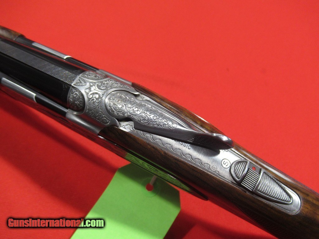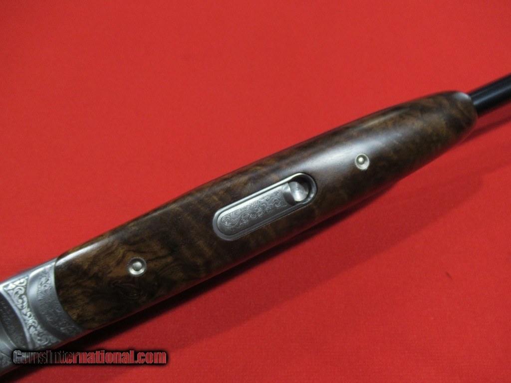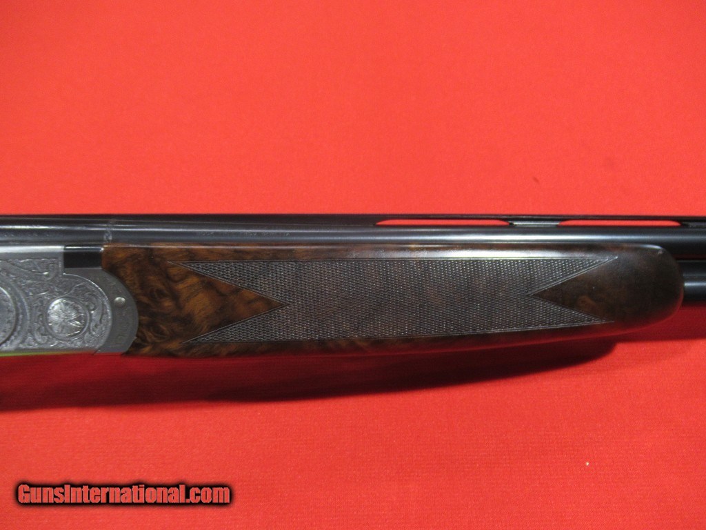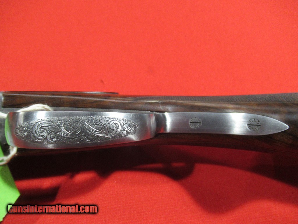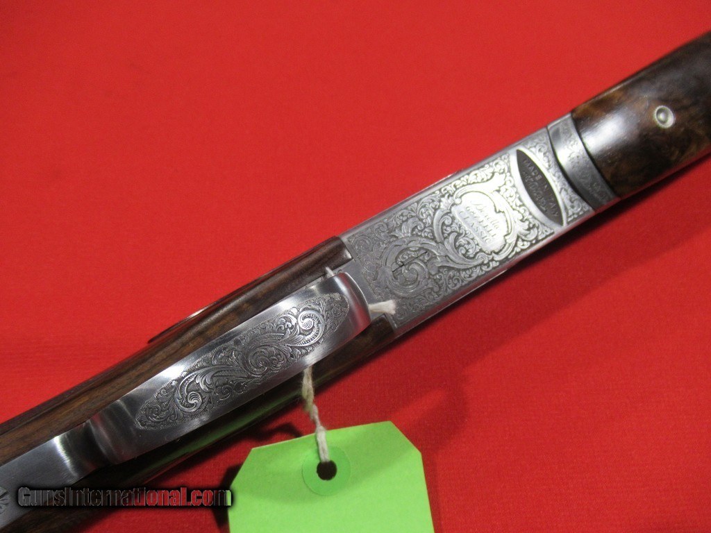 Description: Sideplated boxlock with full coverage scroll engraving surrounding game scenes: highly figured POW and rounded game style forend, hand rubbed oil finish, ventilated rib, selective safety, threaded for factory choke tubes. Factory case and accessories included. SOLD |