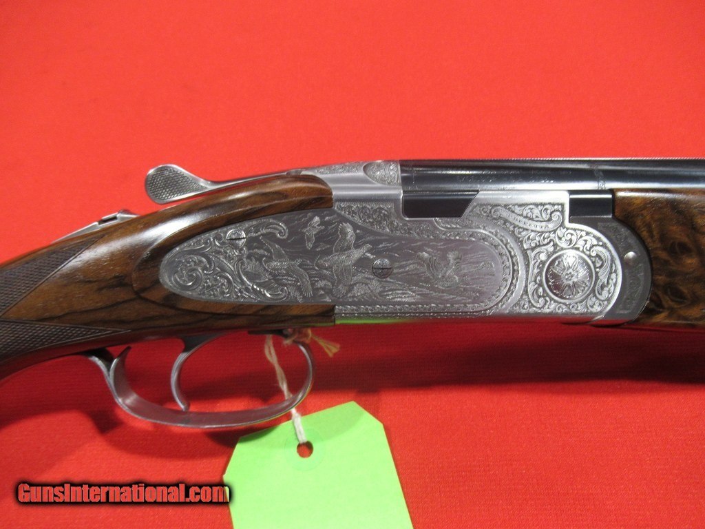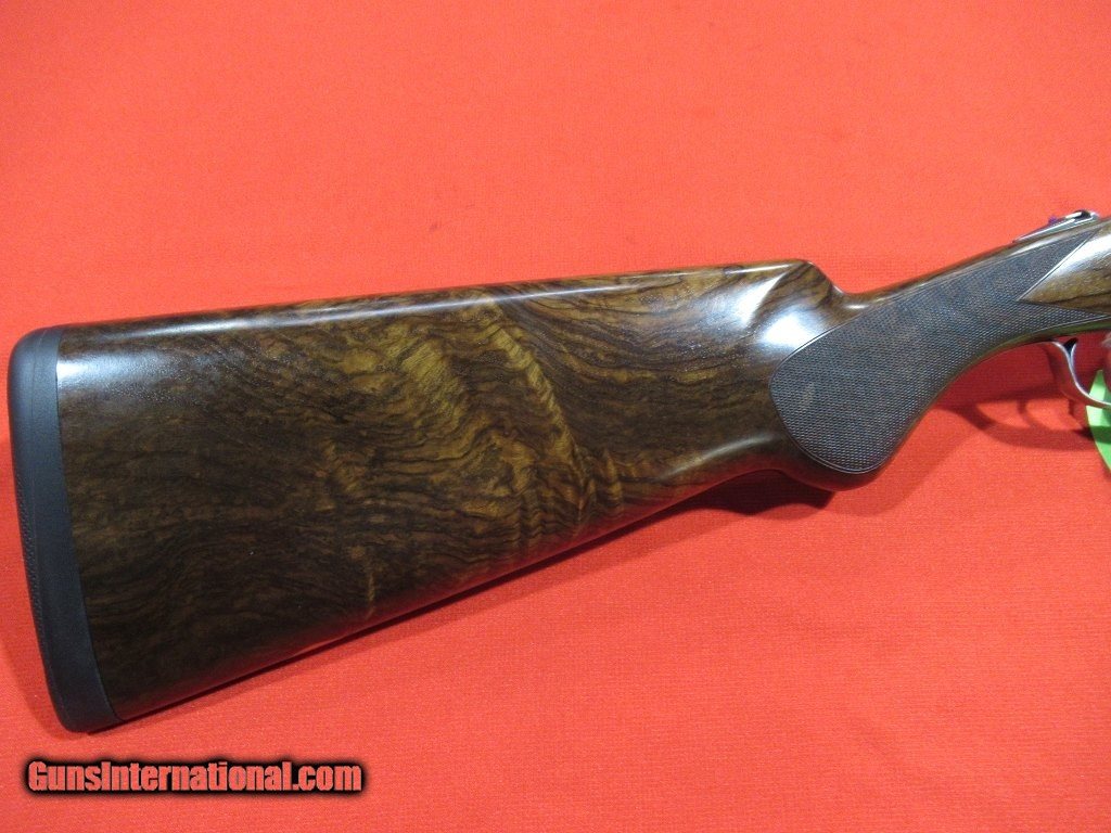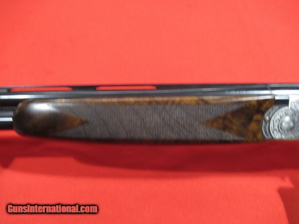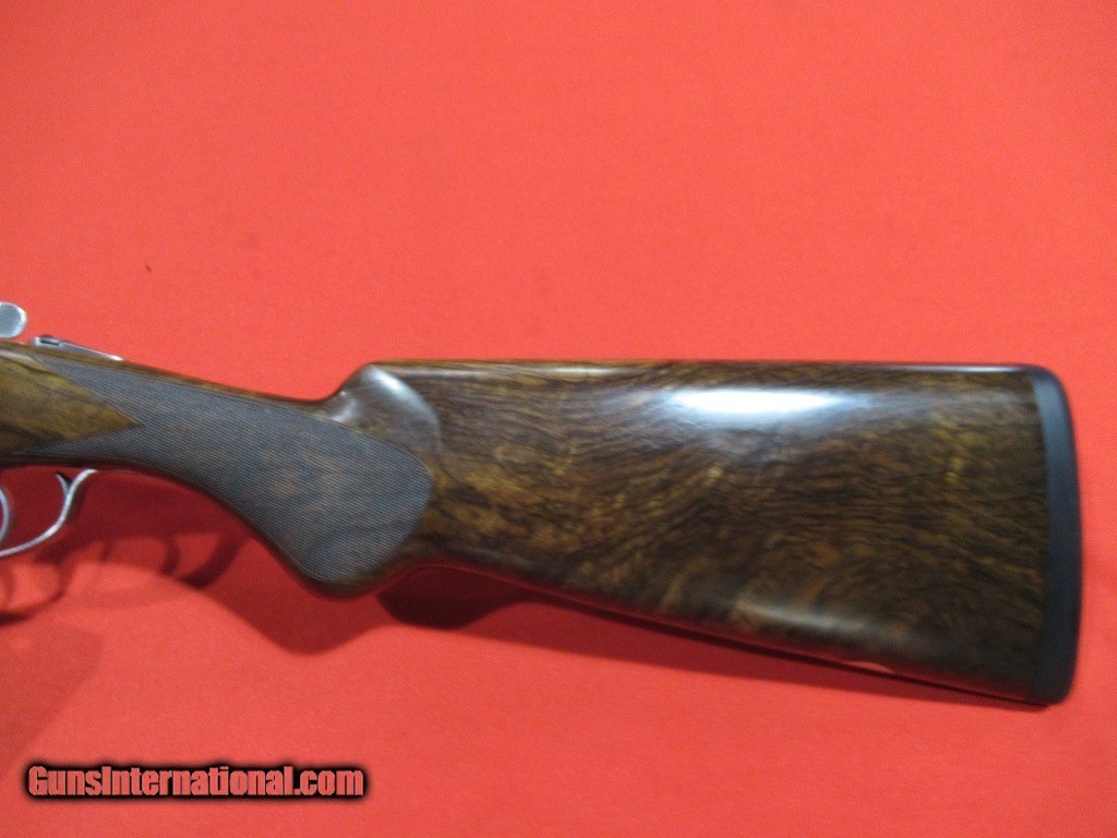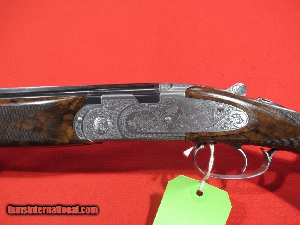 Description: Sideplated boxlock with full coverage scroll engraving surrounding game scenes: highly figured POW and rounded game style forend, hand rubbed oil finish, ventilated rib, selective safety, threaded for factory choke tubes. Factory case and accessories included. SOLD |