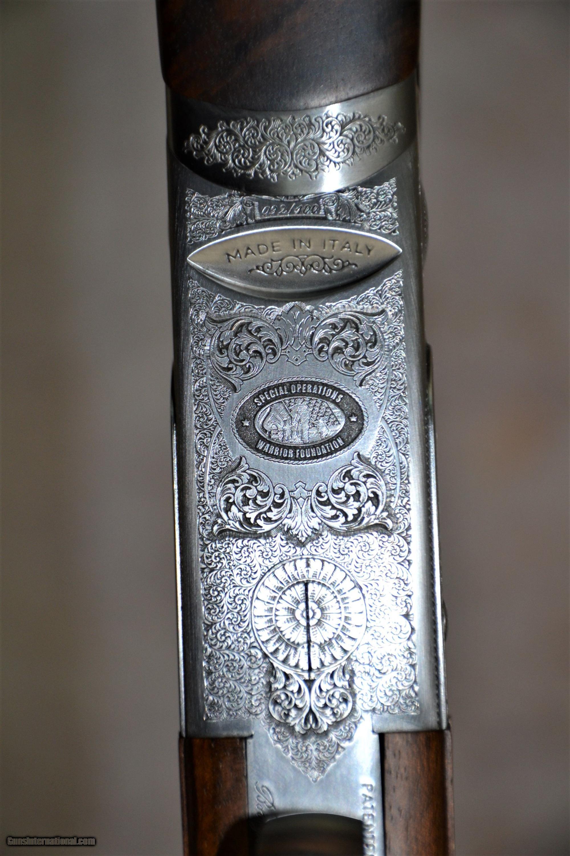 Description: Beretta 687 EELL Classic SOWF Limited Edition 20ga 29.5" Field Shotgun #92/100 SN#Z70375S One hundred of these guns will be produced with the SOWF logo engraved as a tribute to the dedicated men & women of the U.S. Special Operation Forces. Beretta will donate a portion of the proceeds to the SOWF. The SOWF 687 EELL Classic 20 gauge comes with premium quality wood, and classic game scene side plates. For more than 34 years, this organization has provided surviving children of Army, Navy, Air Force and Marine Corps Special Operations Forces (SOF) with college education their fallen parent would have wanted for them, and also has provided financial assistance and support to special operations personnel who are severely wounded. Beretta’s genuine locking mechanism creates a particularly slim and strong receiver, making these Beretta over-and-unders the most elegant, finely balanced and responsive double barrel shotgun in the world. Delivered to you in a handsome, airline approved hard case with leather trim and luxury lining. Federal firearms laws do not allow us to ship firearms directly to you. Please contact us for ordering and shipping information. Gauge: 20ga Barrel Length: 29.5" Chamber: 3" Chokes: Set of 5 flush MobilChokes included Rib: Field~Flat Stock Dimensions Drop at nose: 1 5/16" Drop at heel: 2 1/8" Cast Off: 1/8"- 1/4" Pad: Wooden butt plate Forend Style: English Length of pull : 14.1/2" Comb: fixed Weight: 6lbs. 4.6oz. Warranty: 3 years SOLD |