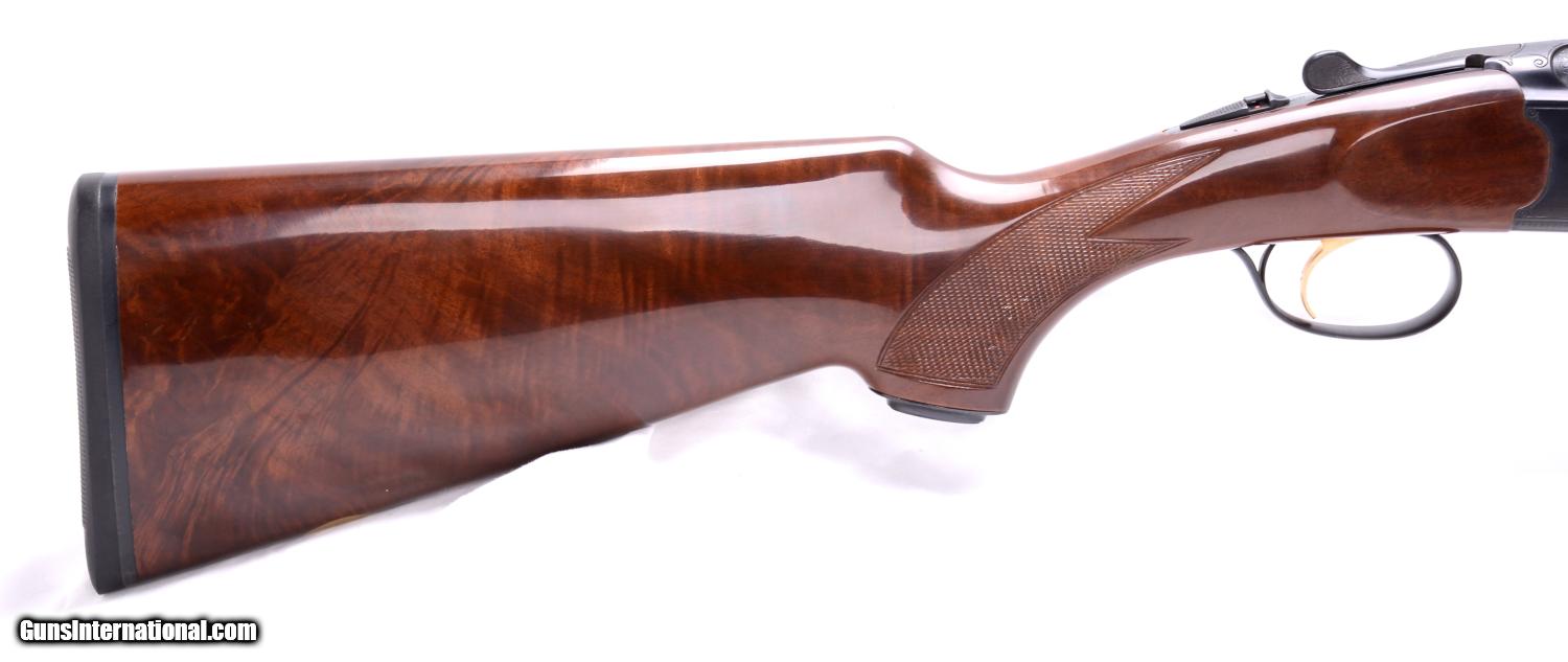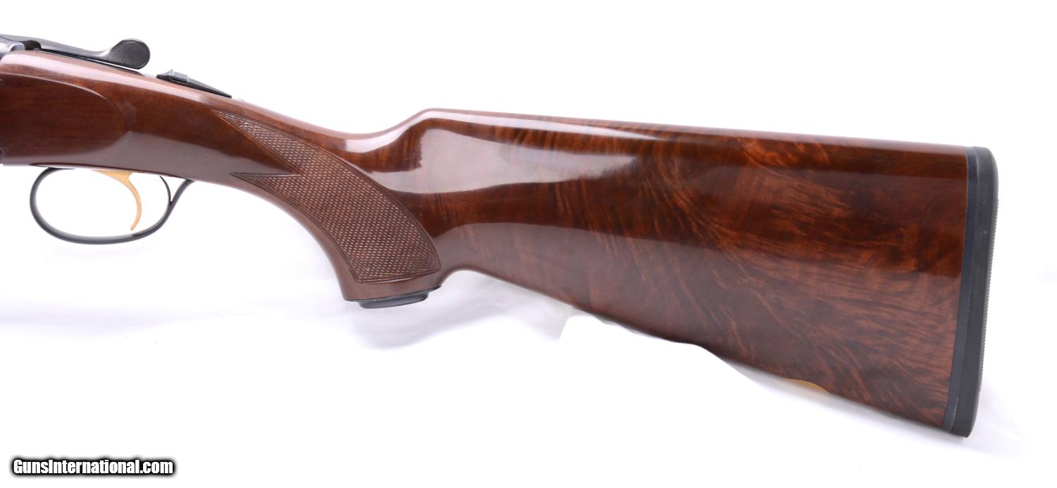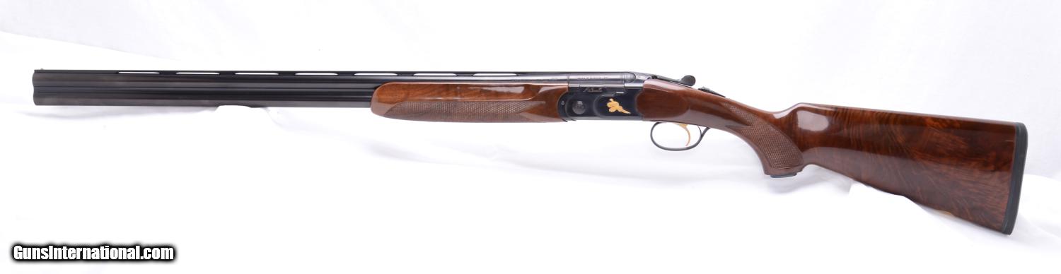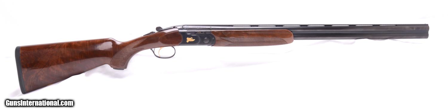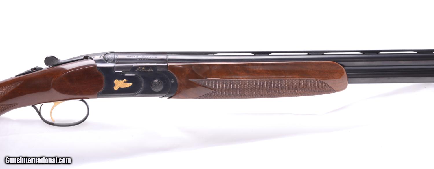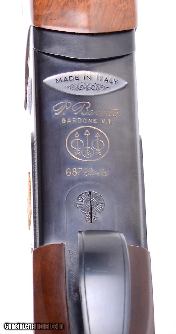 Description: SALE PENDING Beretta 687 Gold 20 gauge O/U shotgun. This model was made and imported on in 1988/89 so there is not a lot of these to be found. It was a distinctive upgrade to the Onyx that was a fairly unadorned gun. The “Gold” features a much higher quality of wood and wood finish as well as it has two “real” hand engraved gold inlays; a pheasant on the left side of the receiver and a mallard on the right. This gun has 26” vent rib barrels with factory choke tubes and chambered for 2 ¾” and 3” shells. The metal finish on the receiver is deep rich blue that appears black and the barrels are tradition deep blue. Overall the gun retains 98% original finishes with just some very small handling marks. The dark and highly figured buttstock has a 14 5/8” LOP over factory pad, 1 ½” DAC and 2 ¼” DAH with a slight left hand cast. (My gunsmith with "bend" the stock for right hand shooter upon request...no charge) SOLD |