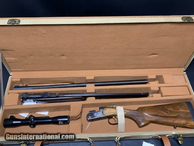 Description: Extra shotgun barrel and forearm. Weight 6lbs with shotgun barrels Beretta Case factory - Cheek piece on stock expres rifle has quick detach claw mount Schmidt & Bender 4x Scope, 1/21 rib with 1 standing rear sight and agold bead front. Serial number is D9971913. 30-06 cal. Rifle 24", Shotgun 28". Case hardened. 14 1/2 to front trigger LOP. 8lbs express in weight. Perfect bore. SOLD Condition: Good condition. |