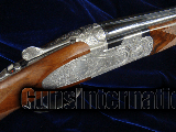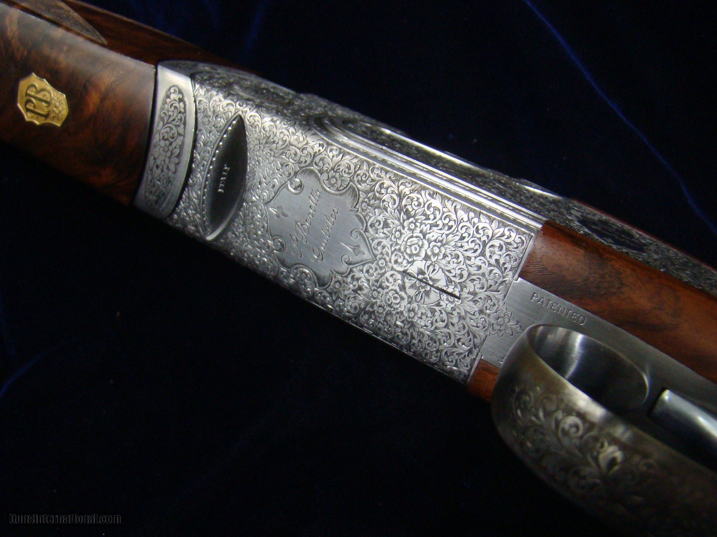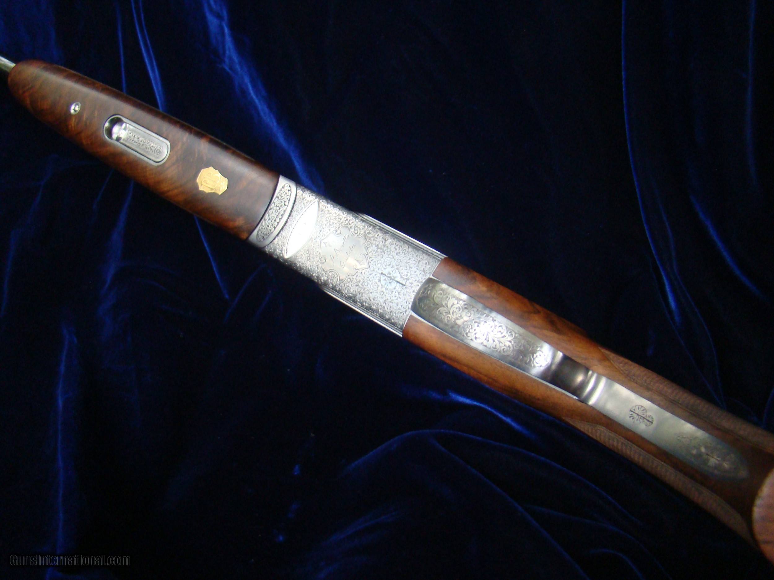 Description: Beretta Jubilee 20 gauge, 30" Excelsior Steel multi-choke barrels feature file cut tapered vent rib. The profusely engraved action features the finest scroll surrounding the Beretta Crest signed E Belleri. Single trigger. The highly figured stock of black and amber color measures 1-3/8" comb, 2-1/4" heel, LOP 14 -3/4" over factory pad. This is the top of the line Premium Grade Beretta side-plate model, built in the SO workshop with complete hand finishing. All the parts and workings mirror polished and engraved to SO series highest standards. Weighs in at 6 lbs, 10boz perfect for game or a round of clays. Outstanding Premium Grade, the gun is 99 % condition. SOLD |