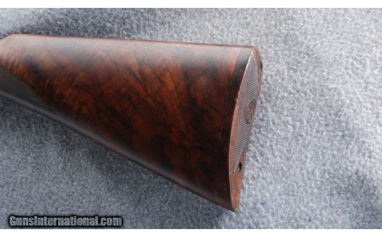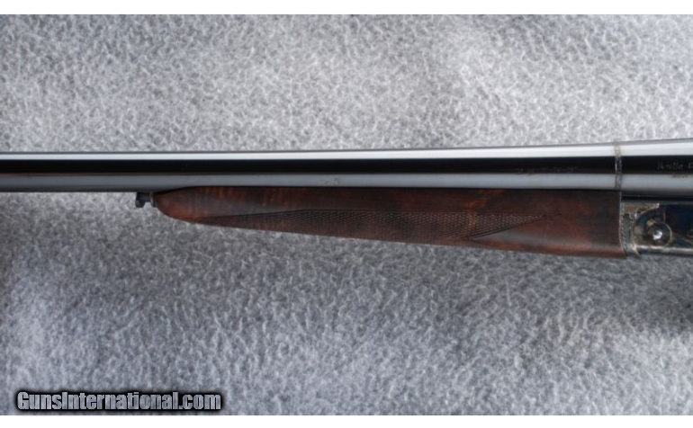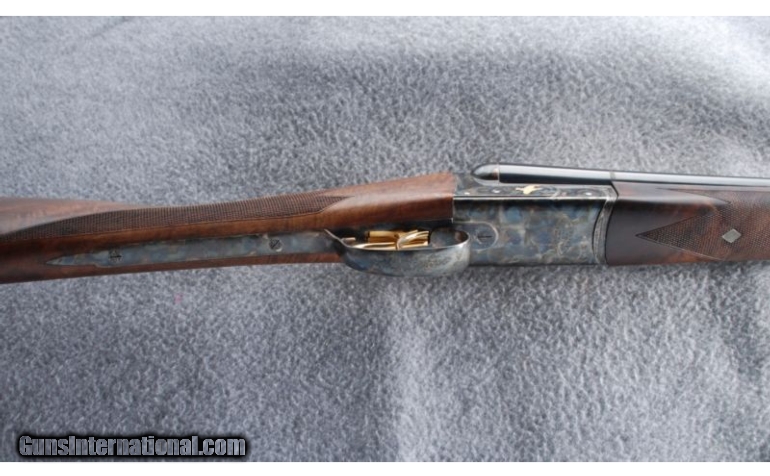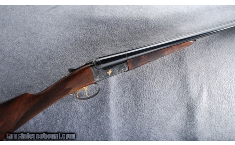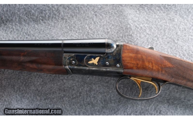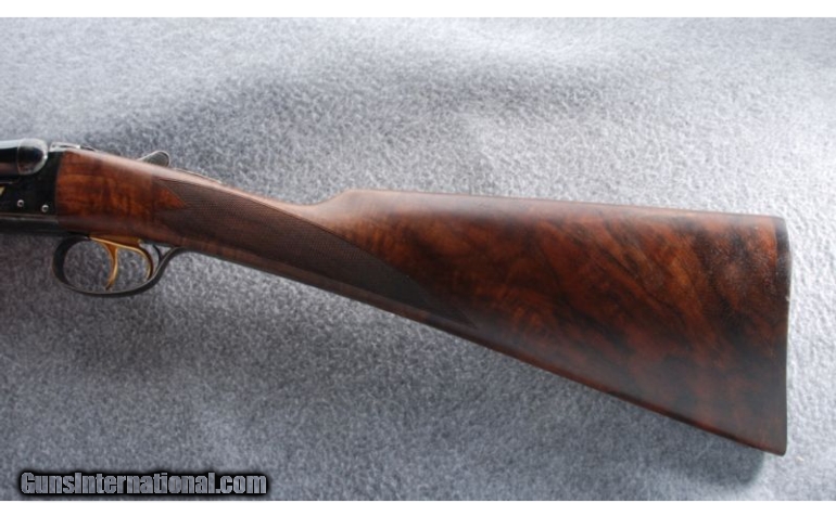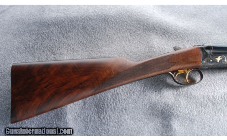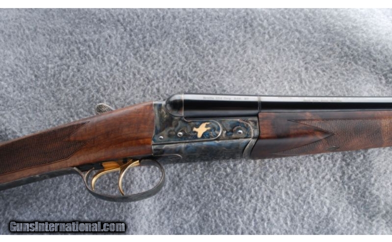 Description: This elegant side-by-side 20 Gauge has a richly blued, concave rib barrel set paired with a case colored receiver and a checkered walnut stock set. The trigger guard, forend iron and release, top snap, and bottom tang are also case colored. The lever is far right of center. It is fitted with ejectors. It has a traditional double trigger group with an articulated front. The English-style straight stock ends in a wooden buttplate bearing the Beretta Trident logo. It comes with the maker’s hard case. SOLD Manufacturer: 2006 Caliber Info: 20 Gauge Chambers: 3 Metal Condition: Only a couple small handling marks. Wood Condition: A few scattered light handling marks. Some dings and scratches on the wooden buttplate. Bore Condition: Bright bores. Barrels: 28" barrels with concave rib and ejectors. Triggers: Double triggers with articulated front. Stock: Straight Stock Dimensions: 14 1/2" LOP Fore End: Splinter with Anson release. Butt Pad: Wooden buttplate with maker's logo. Weight: 6 lbs. 4 oz. Sights: Front Bead Chokes: Fixed - IC/IM Extras: Case Item Location: Gonzales, LA |