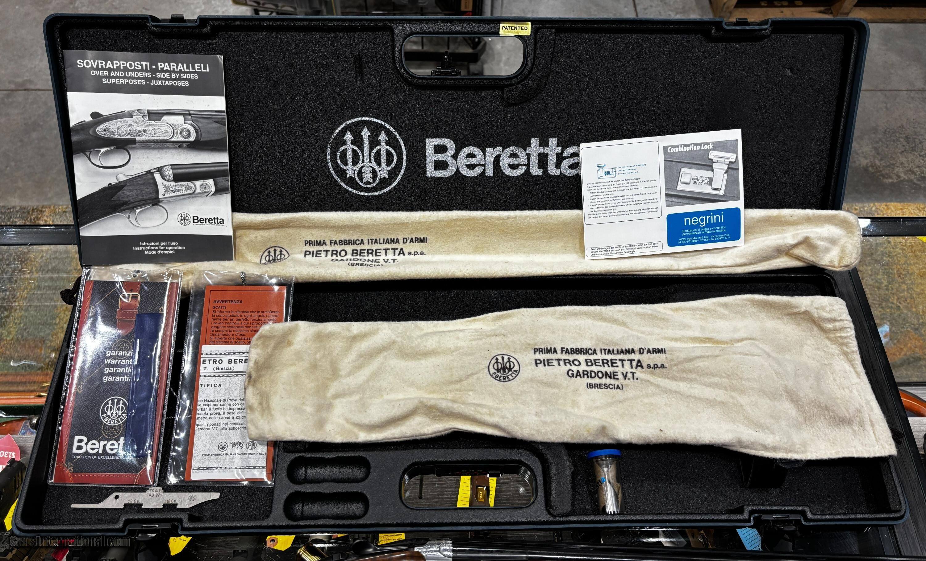 Description: Beautiful Beretta 687 Sovrapposti 28 Gauge over/under shotgun built in 1999. Features Excelsior high-strength steel barrels, 2¾" chambers, gold foil-inlaid engraving, and select walnut stock. Includes factory case, paperwork, and all accessories. For sale: a gorgeous Beretta 687 Silver Pigeon Sovrapposti over/under shotgun chambered in 28 Gauge. This is a true Italian masterpiece — beautifully engraved, smooth-handling, and proofed at Gardone Val Trompia in 1999. This gun comes complete with its original Beretta/Negrini hard case, owner’s manuals, combination lock documentation, and accessories as pictured. The receiver is coin-finished with detailed scroll engraving and gold-inlaid game scenes. The walnut stock has a rich, high-gloss figure and crisp checkering. The barrels are stamped with Beretta’s famous Excelsior High-Strength Alloyed Steel, and bear all Gardone proof house marks: