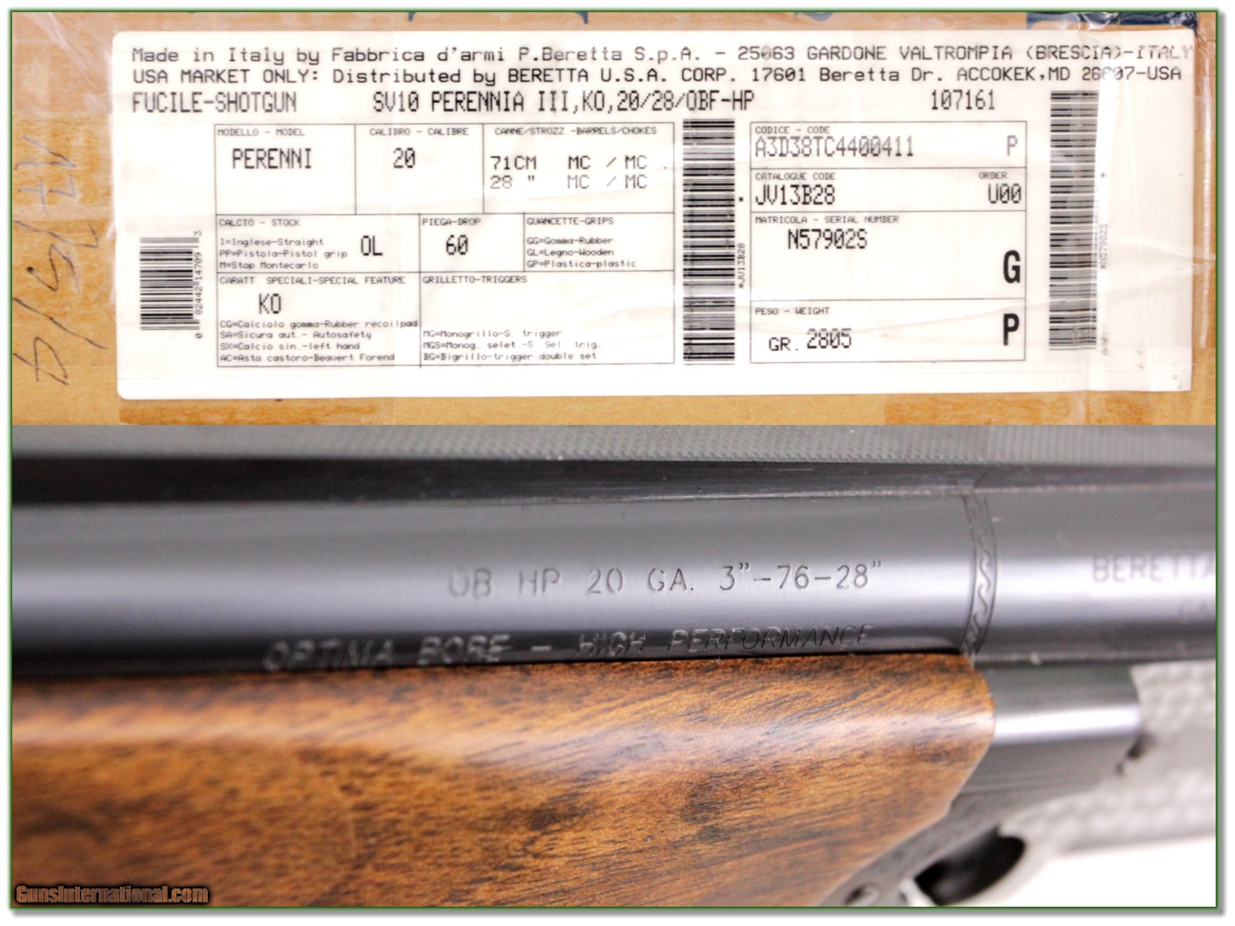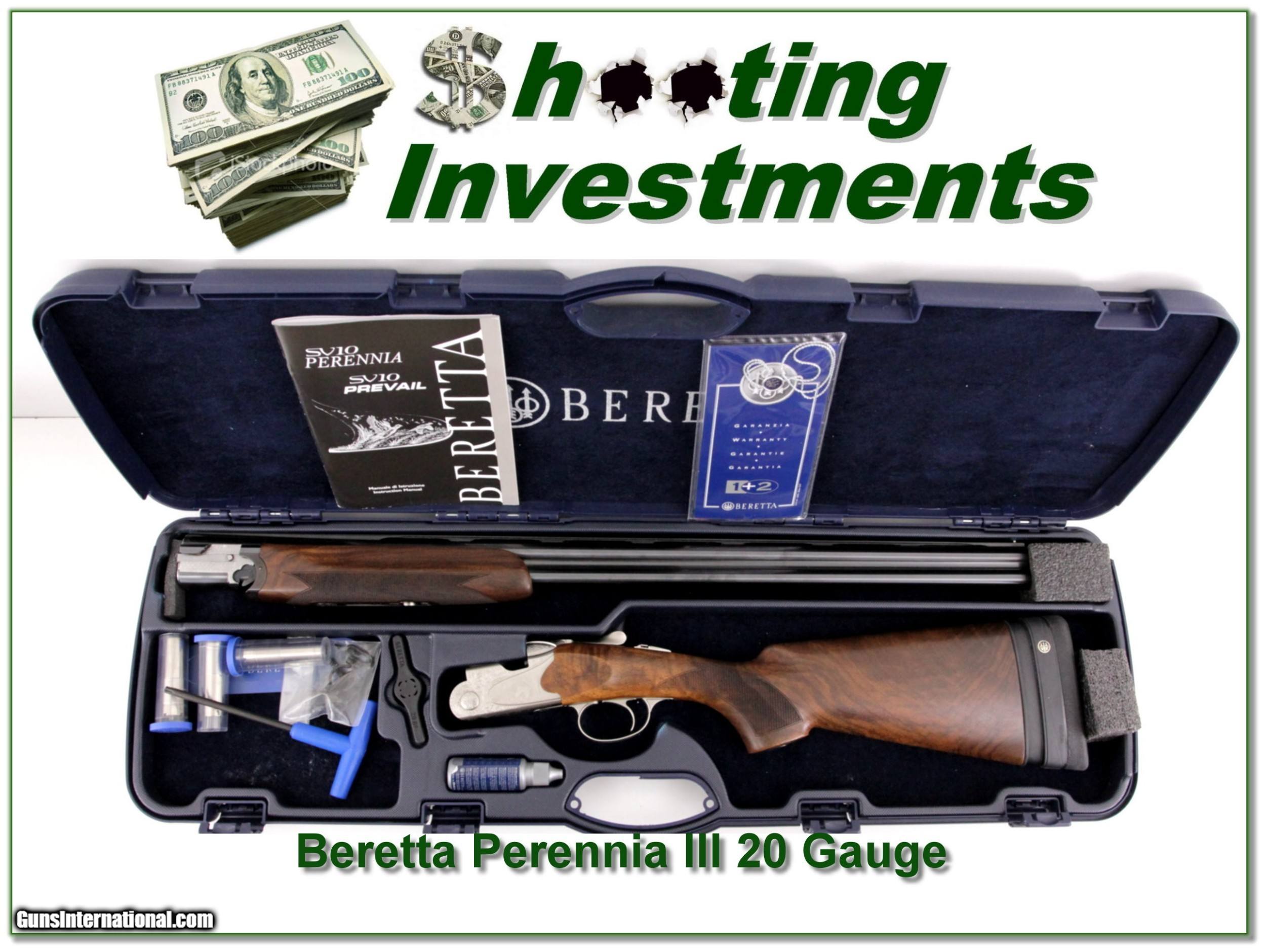 Description: Beretta SV10 Perennia I over/under shotgun in 20 gauge. 28" barrels 3" chambers. It is unfired in case with all papers and accessories. Kickoff recoil reduction system. This is a fantastic over/under that was sadly discontinued by Beretta a few years ago. Somehow this one surfaced and here it is for sale! This is a great choice for anyone looking for a lighter kicking 20. I am selling this one on consignment and as such lay-a-way can’t be used. It does of course have the standard 3-day inspection. Shipping with insurance is $49. Please email me with any questions or larger pictures. (Consign your quality firearms with Shooting Investments for only 12%! Let me know if you have any you would like to sell!) 19-0599 Payment: Payment is by Money Order, Cashiers Check or Personal Check. I can now also accept Credit Cards (MasterCard, Visa, Discover & American Express) with a 3% convenience fee. PayPal can be used for some items but never for firearms. Shipping: The shipping charge will be listed in each description. It is $39 for most firearms. Some heavy guns or those insured for over $2000 will be higher. Shipments to Alaska and Hawaii are higher because air shipment is required. Most firearms are shipped on Tuesday and Thursday and usually in 5 days of receipt of payment. We package all shipments carefully and insure them. Optics are shipped Priority Mail and most other non-firearm shipments are shipped First Class. Returns: Our return policy is simple. If for any reason you are not pleased with your purchase, you may return your item for a full refund of purchase price. Ammunition cannot be returned. It is important to us that you are happy. Guns cannot be fired or dissembled before returning them and they must be returned in the same condition as received. Notification of a return must occur with-in 3 days of receipt at your dealer. Shipping, convenience and dealer fees are not refundable and are the responsibility of the buyer. Lay-a-way: If needed, we offer a 60 day lay-a-way option on most firearms. It is 1/3 now, 1/3 in 30 days and 1/3 in 60 days. Lay-a-way firearm sales are final and if not completed the first payment cannot be returned. Consigning your firearms with Shooting Investments: We will help you get top dollar for your firearms. While most local guns shops charge 20% or more, our fee is only 12% with a minimum of $75. At your local gun shop it might take months to sell. Selling on-line provides instant access to thousands of interested buyers. You won’t find any other on-line dealer willing to sell your firearms for only 12% or listing every gun on 3 separate s. Selling through an House typically costs the seller 15% and the buyer an addition 15% (so 30%) and you have to wait several months to sell and longer to receive funds. If properly priced, we will sell your firearms in a few weeks. Send us an email or give us a call and we’ll explain how easy it is for you to get top dollar. Trading: Trading for use is really just buying your gun to re-sell. If you have a gun you want to trade, please email a picture and we will let you know what we can give or it. You will always get more if we sell it for you on consignment. Help for California Buyers: We are happy to ship to California. It is the buyer’s responsibility to make sure any item you buy is legal in your state. We are also happy to help with your purchase of a firearm from someone other than us. If you see a gun you would like to buy but the seller can’t or won’t ship to California they can ship to use and we’ll then ship it to your California dealer. The cost for this service is only $30 + shipping. Let us know if we can help! SOLD |