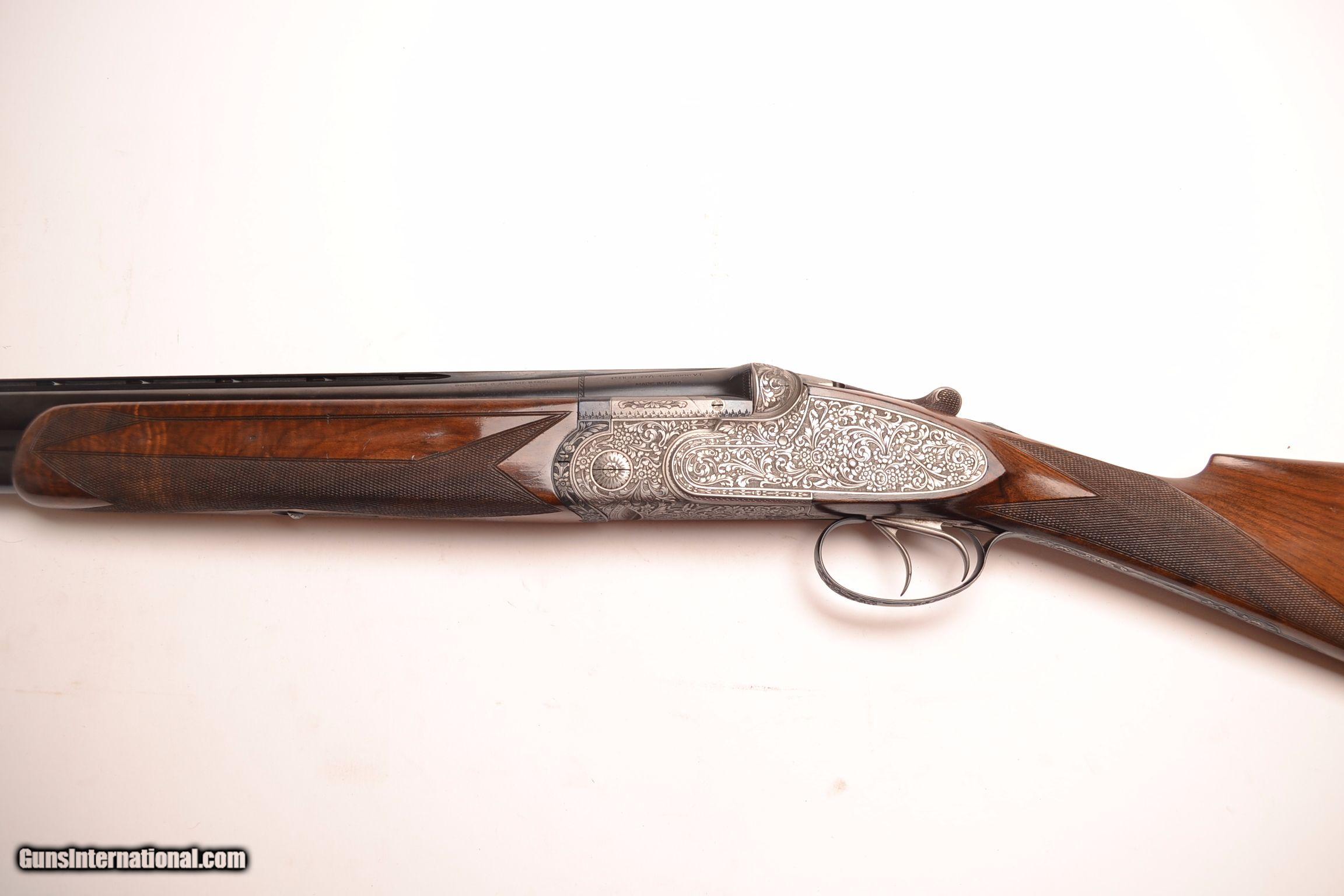 Description: P. Beretta/Fracassi - S3 EL, 12ga. 28" Barrels Choked F/F. Very rare Fracassi engraved gun. The cost of a Fracassi engraved gun today starts at $50,000 and not for full coverage work as exhibited on this gun, superior hand detachable, full sidelock deluxe, with a rare configuration double trigger, straight stock checkered butt, the gun is virtually unused, in maker's case with canvas cover, very, very rare find, One of the finest Italian makers, and possibly the best engravers in the world, this gun couldn’t be duplicated for 3 times the amount of money. S&H - $50.00. Inv: 24489 7 lbs. 5 oz. 14 ¼” X 1 ½” X 2 1/8” $45,000.00 SOLD |